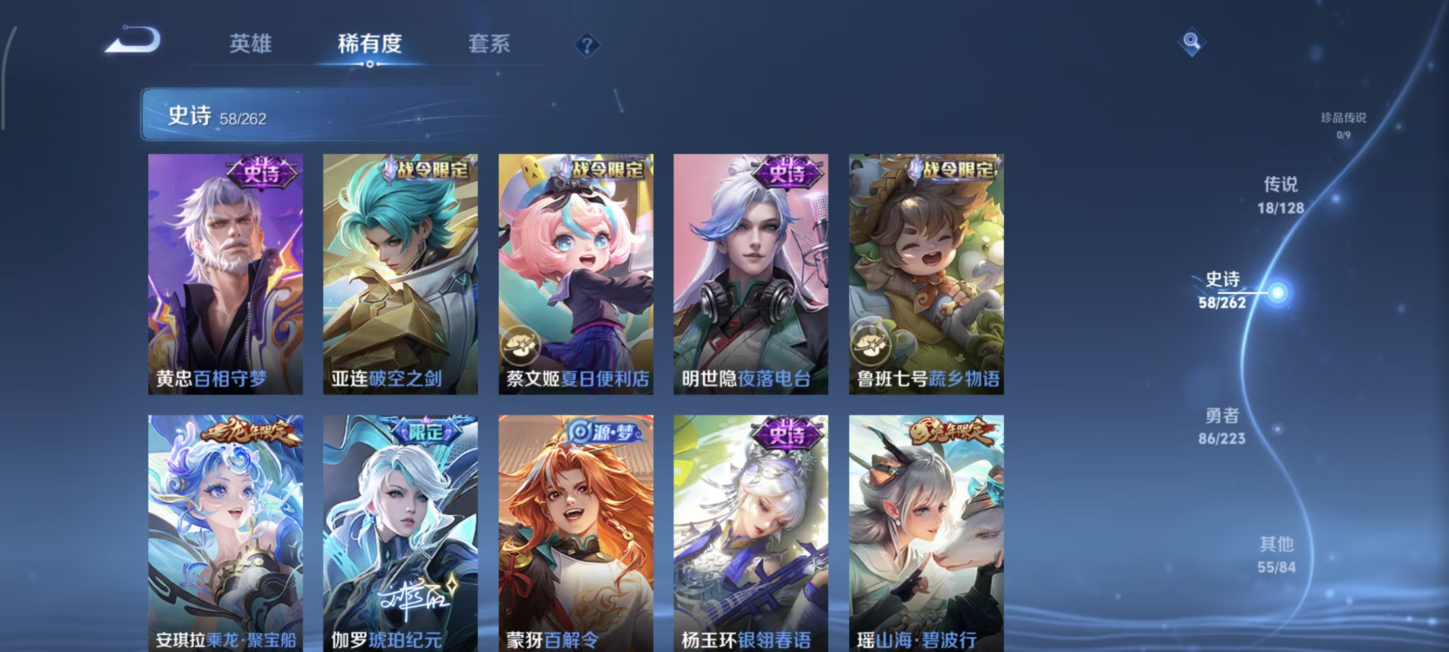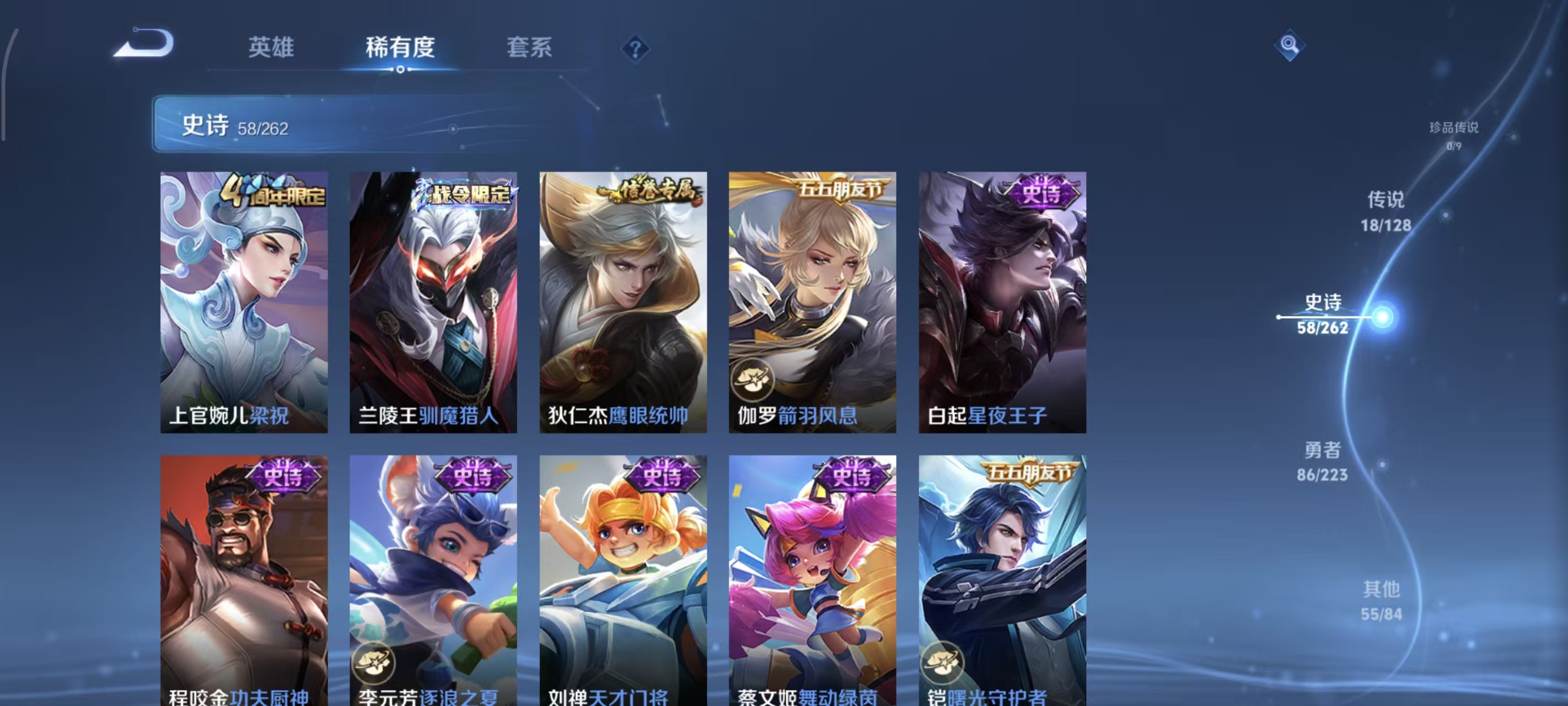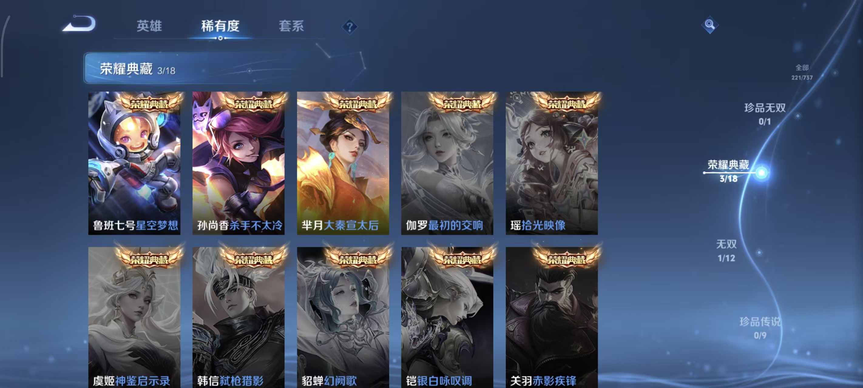 - PX_2085982-贵族8/皮肤302/典藏1/传说18/史诗95/英雄123/鸣剑曳影/优雅恋人/特工战影/胡桃夹子/末日机甲女/白虎志/云鹰飞将/启明星使/炽阳神光/时雨天司/碎云/诗剑行/鹤羽星尊/妄想实况/鹤归松栖女/惊梅引/遇见神鼓/桑启鸣野蒿/嬴政玄雷天君/云缨幻光神枪/虞姬愿照岁时盈/女娲愿照千秋盛/狰/姜子牙天穹之誓/杨戬破阵退雄兵/狄仁杰阴阳师/凯尔特女王/赵云皇家上将/引擎之