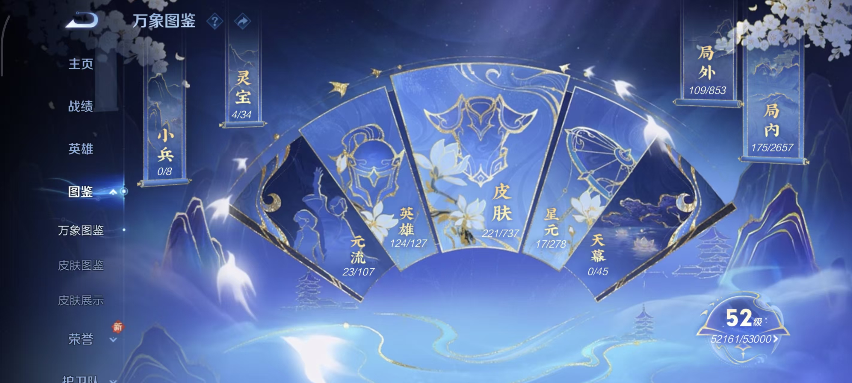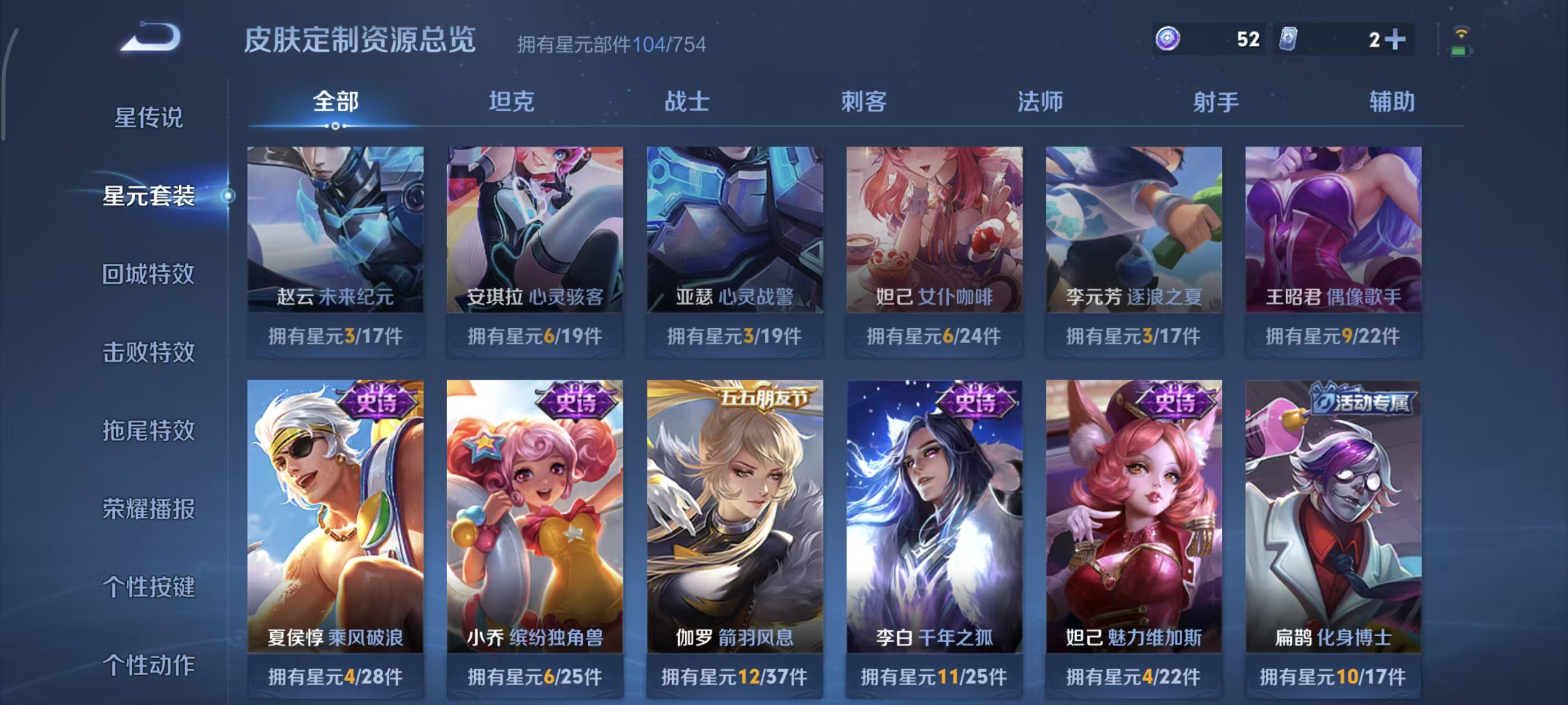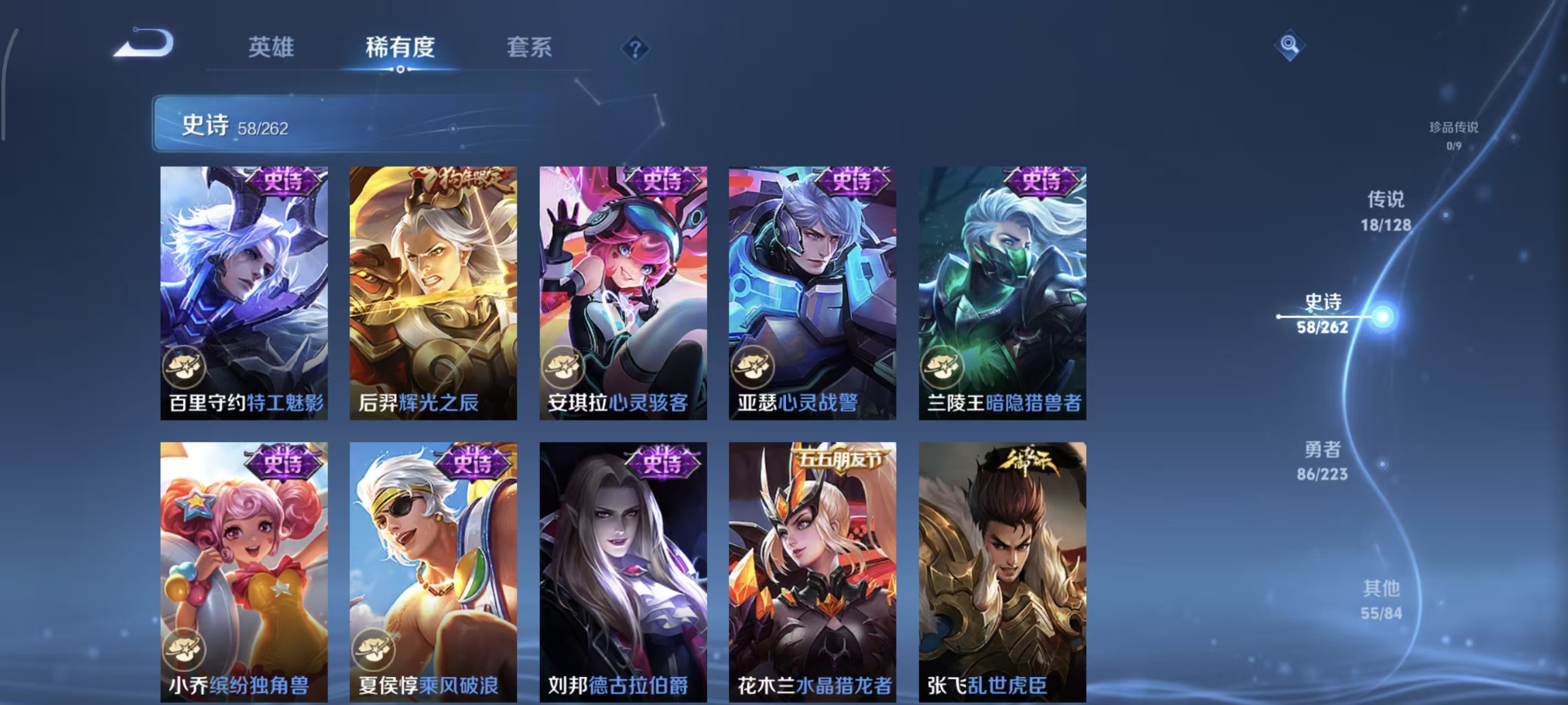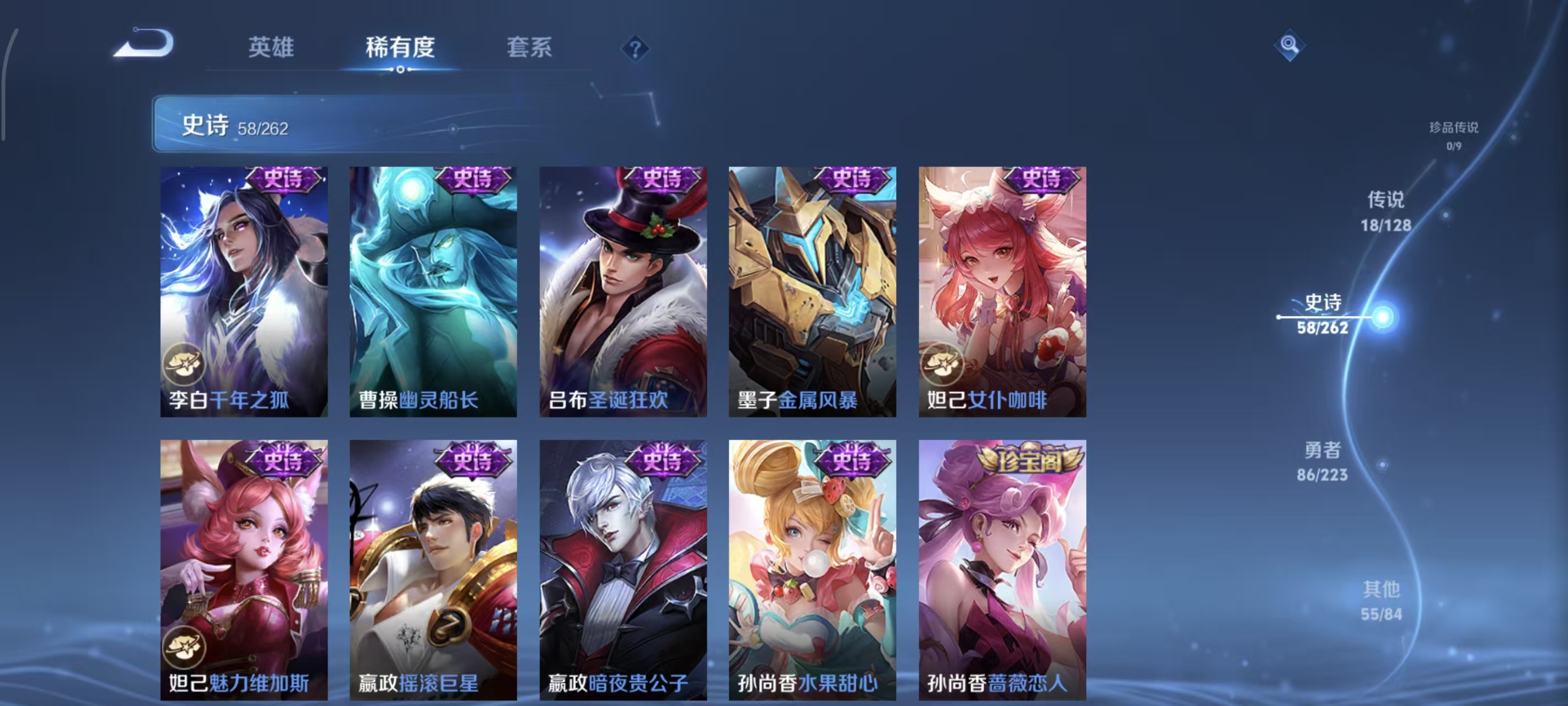 - PX_2085982-贵族8/皮肤302/典藏1/传说18/史诗95/英雄123/鸣剑曳影/优雅恋人/特工战影/胡桃夹子/末日机甲女/白虎志/云鹰飞将/启明星使/炽阳神光/时雨天司/碎云/诗剑行/鹤羽星尊/妄想实况/鹤归松栖女/惊梅引/遇见神鼓/桑启鸣野蒿/嬴政玄雷天君/云缨幻光神枪/虞姬愿照岁时盈/女娲愿照千秋盛/狰/姜子牙天穹之誓/杨戬破阵退雄兵/狄仁杰阴阳师/凯尔特女王/赵云皇家上将/引擎之