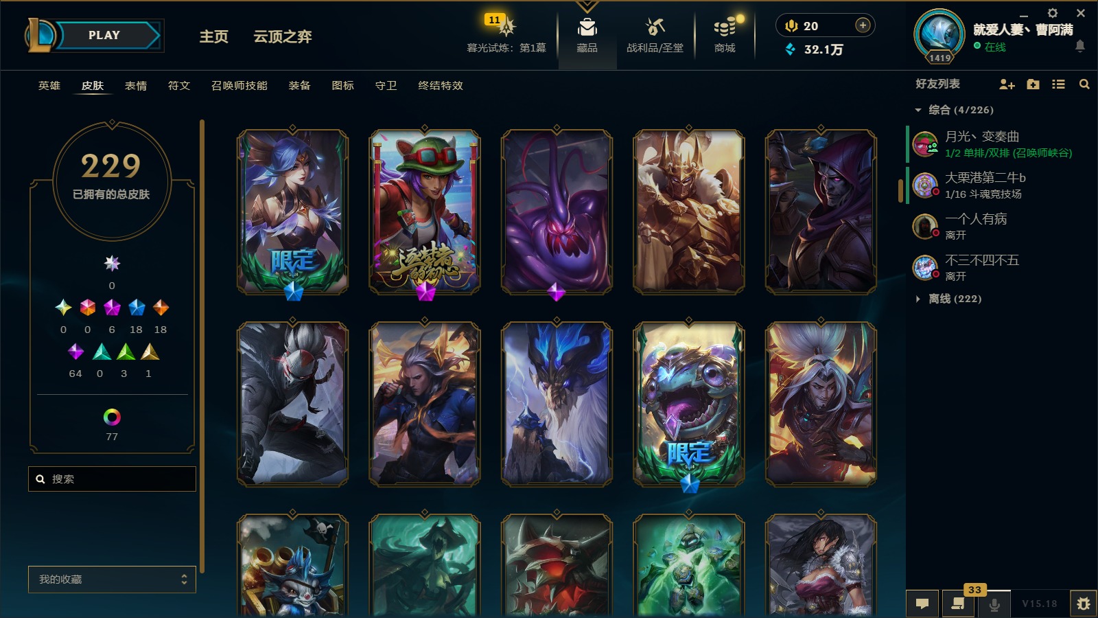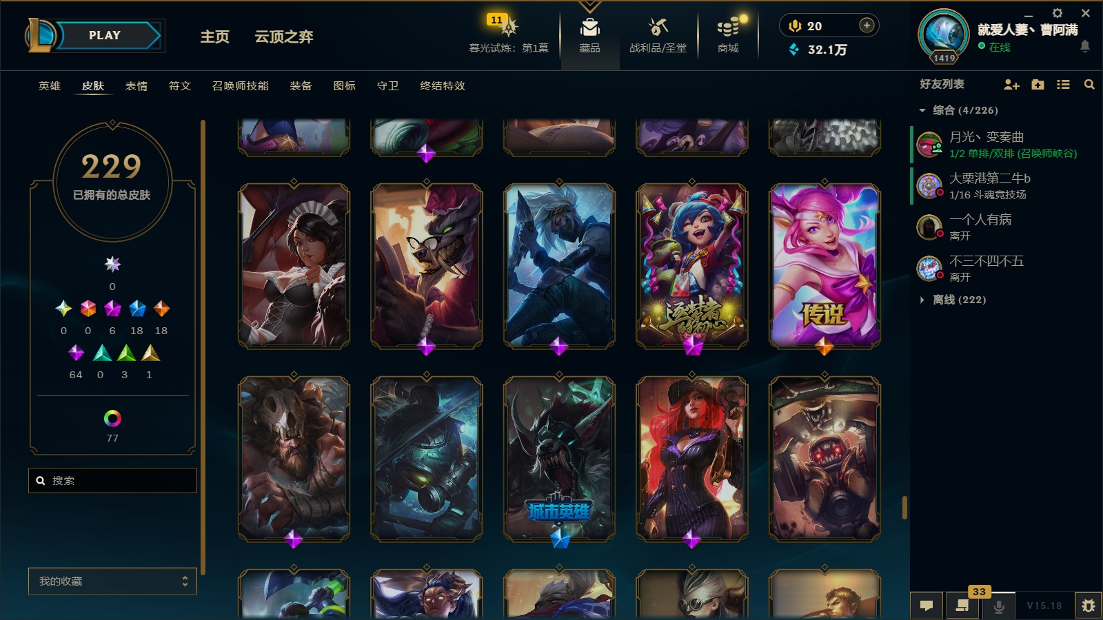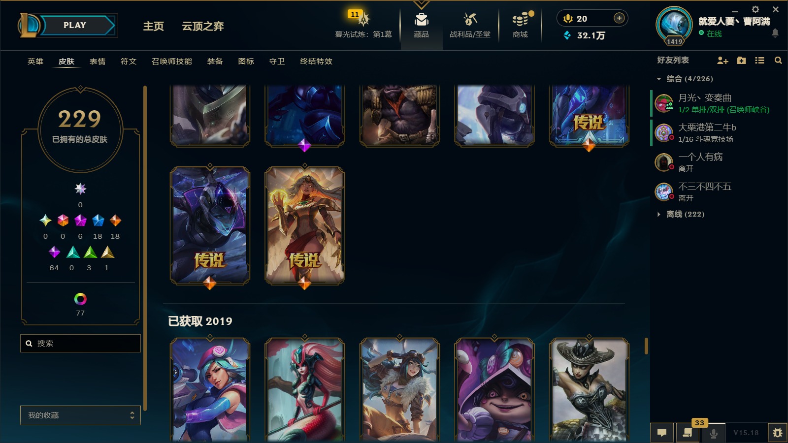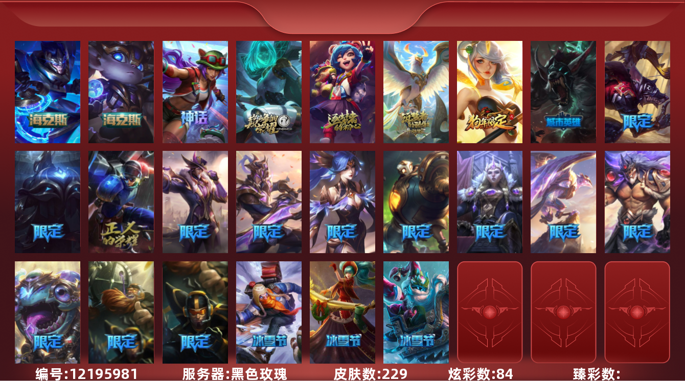 [12195981]6神话 18限定 18传说 64史诗 229皮肤 84炫彩 171英雄 可二次 可修改实名 优质装备:源代码 乐芙兰,防爆天使 凯尔,暗影 沃里克,都铎王朝 图奇,冠军之隐 劫,冠军之血 希瓦娜 凯旋圣装,净雪之月 莫甘娜 冬虹,十五周年纪念 希维尔,魔女 阿卡丽 虚荣 海克斯:海克斯 嘉文四世,海克斯 波比 赛季限定皮:胜利凤凰 艾尼维亚,胜利之运 崔斯特,胜利剑圣 易,胜利女神 娑娜,胜利巨口 克格莫,胜利之王 泰达米尔,胜利机器人 布里茨,胜利女神 瑟庄妮 冠军限定系列:S1FNC 酒桶,S1FNC 嘉文四世 冰雪节限定:冰雪节 炼金,平安夜女神 娑娜,邪恶圣诞老人 维迦 年限:狗年 光辉 周年:10周年 安妮,10周年 凤凰