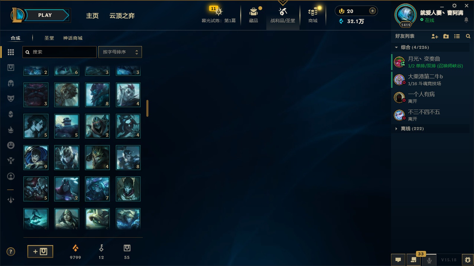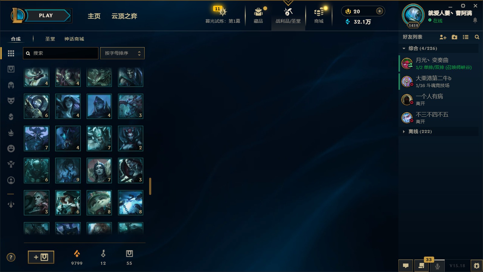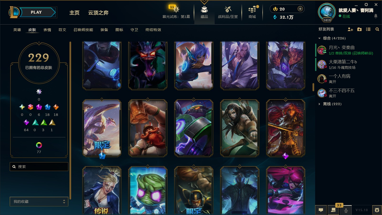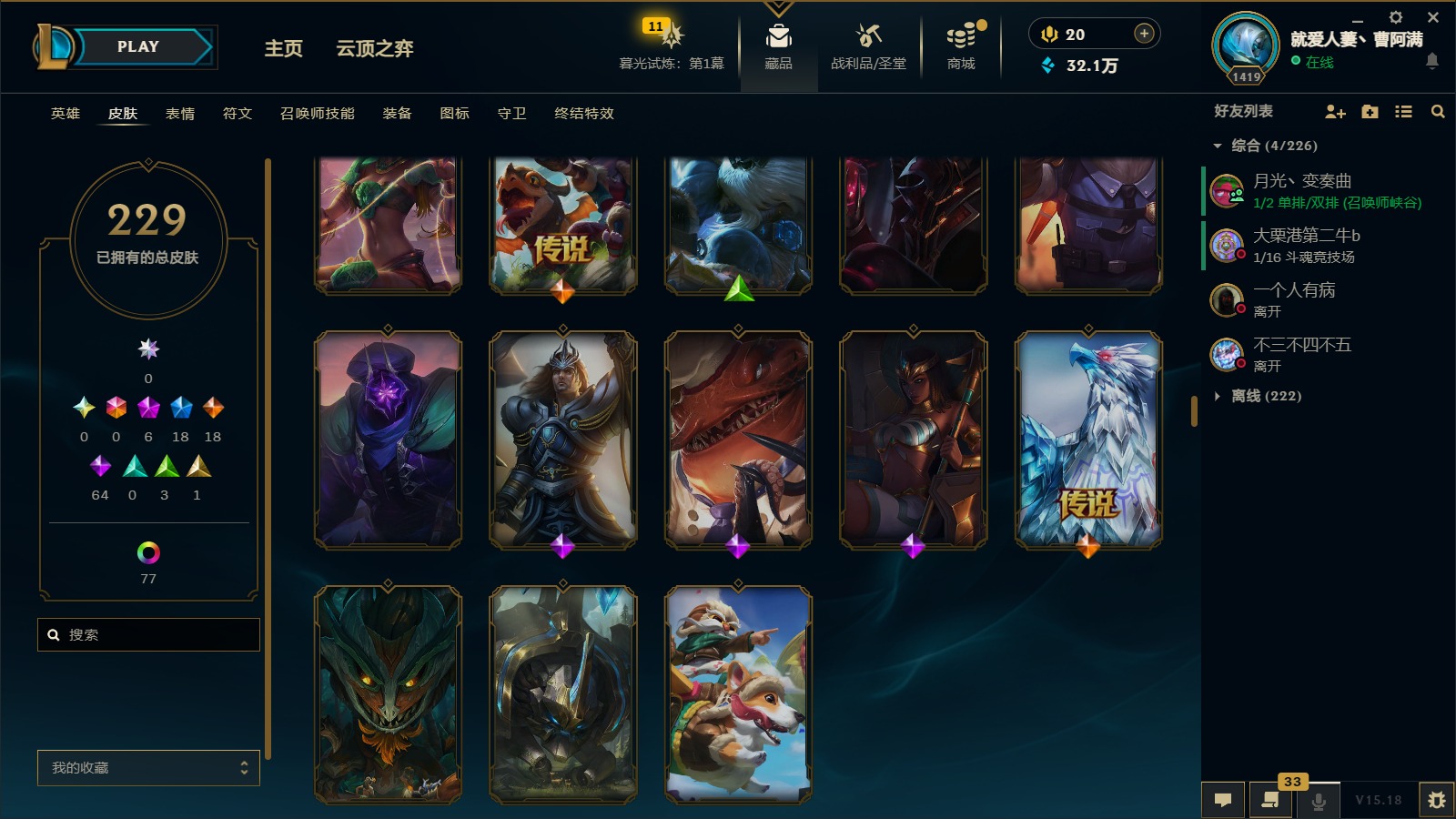 [12195981]6神话 18限定 18传说 64史诗 229皮肤 84炫彩 171英雄 可二次 可修改实名 优质装备:源代码 乐芙兰,防爆天使 凯尔,暗影 沃里克,都铎王朝 图奇,冠军之隐 劫,冠军之血 希瓦娜 凯旋圣装,净雪之月 莫甘娜 冬虹,十五周年纪念 希维尔,魔女 阿卡丽 虚荣 海克斯:海克斯 嘉文四世,海克斯 波比 赛季限定皮:胜利凤凰 艾尼维亚,胜利之运 崔斯特,胜利剑圣 易,胜利女神 娑娜,胜利巨口 克格莫,胜利之王 泰达米尔,胜利机器人 布里茨,胜利女神 瑟庄妮 冠军限定系列:S1FNC 酒桶,S1FNC 嘉文四世 冰雪节限定:冰雪节 炼金,平安夜女神 娑娜,邪恶圣诞老人 维迦 年限:狗年 光辉 周年:10周年 安妮,10周年 凤凰