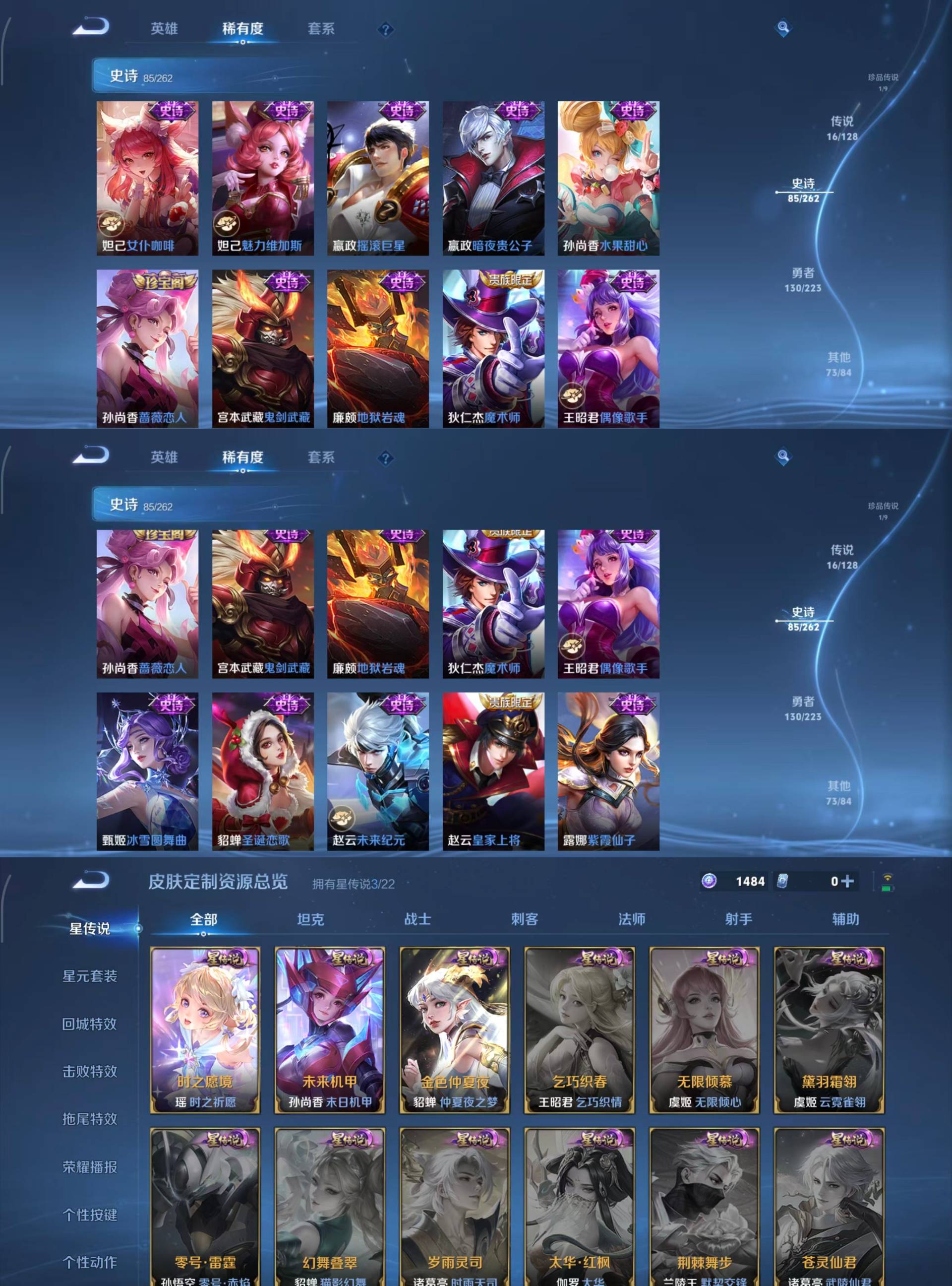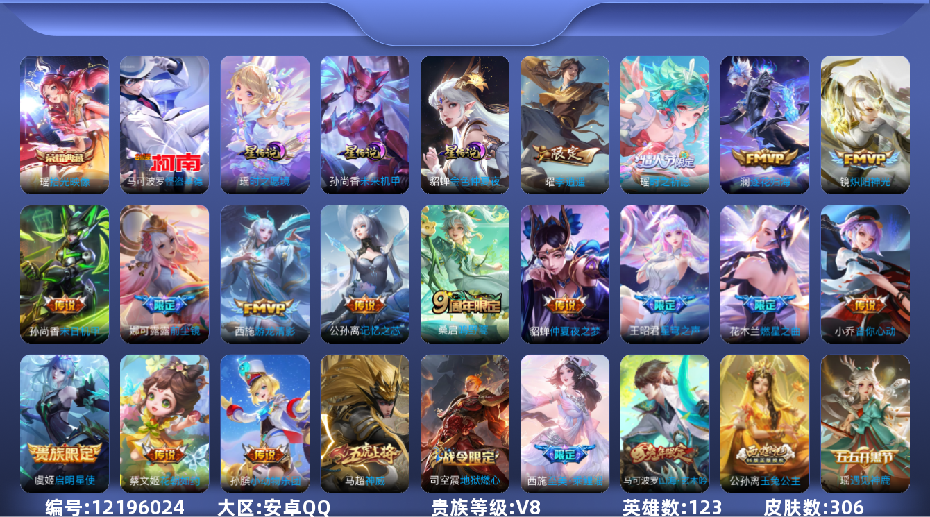 - [12024831]V9 1典藏 34传说 125英雄 344皮肤 可修改实名 优质装备:全息碎影(猴子典藏),黄金狮子座,黄金射手座,云鹰飞将(小将军),黄金白羊座,炽阳神光,一念神魔,仲夏夜之梦(大飞蛾),飞鸢探春,音你心动-周瑜,李逍遥,乞巧织情,时之恋人-刘备(电焊工),游龙清影(小青龙),淬星耀世,末日机甲-孙策,无双飞将,鲁班七号-时之奇旅,大乔-时之奇旅,澜逐花归海,琥珀纪元铠,琥珀纪元马超,金乌负日,黄金天蝎座 传说皮:乘龙·问璇玑(孙尚香年限),乘龙·铭钟鼎(赵云年限),乘龙·淬吴钩(孙策年限),典韦战鼓燎原,落雪白狼,铠冥王哈迪斯 珍宝阁皮:胡桃夹子,蔷薇恋人 限定皮:傲雪梅枪,白晶晶,时雨天司(水龙头),至美·乘鲤谣,至美·化雀舞,影龙天霄,遇见飞天,匿光决锋者,五谷丰年,辉光之辰,孙行者,大圣娶亲,玉兔公主,无尽星芒,山海·玄木吟(马可年限) 史诗皮:化蝶舞,灵蛊蚀心,怒海争锋,埋骨钱,芈月浮光幕影,琥珀纪元伽罗,决胜骁骑,上官婉儿群星魔术团,奇遇星旅,蔬乡物语(鲁班七号),曹操夜都魔契,超元猎域,乘龙·聚宝船(安琪拉年限),乘龙·忆丹青(大乔年限),百相守梦-黄忠,遇见神鹿,紫霞仙子,黄金分割率,特工魅影,千年之狐,永昼,江河有灵,匿光侦查者,鹤归松栖(赵怀真),真我赫兹(百里守约),魅语,百解令(蒙犽),高渐离燃音魔法,无限星赏官,青蛇,偶像歌手,晚萤,电玩·爆裂旋风,龙骑士(小龙虾),末日机甲-吕布,猫狗日记-孙策,猫狗日记-大乔,时之恋人-孙尚香,乱世虎臣,修罗,女仆咖啡,摇滚巨星,水果甜心,绅士熊喵,天才门将,星夜王子,心灵骇客,功夫厨神,德古拉伯爵,暗隐猎兽者,幽灵船长,鬼剑武藏,暗渊魔法,心灵战警,乐园奇幻夜,舞动绿茵,纤云弄巧,拒霜思,缤纷独角兽,乘风破浪,逐浪之夏,水晶猎龙者,曙光守护者,箭羽风息,金属风暴,圣诞狂欢,圣诞恋歌,鹰眼统帅,暗夜贵公子,魅力维加斯,赏金猎手,奇遇舞章,天秀·音浪,千筹问战,顽趣-阿古朵,无心,未来纪元-赵云