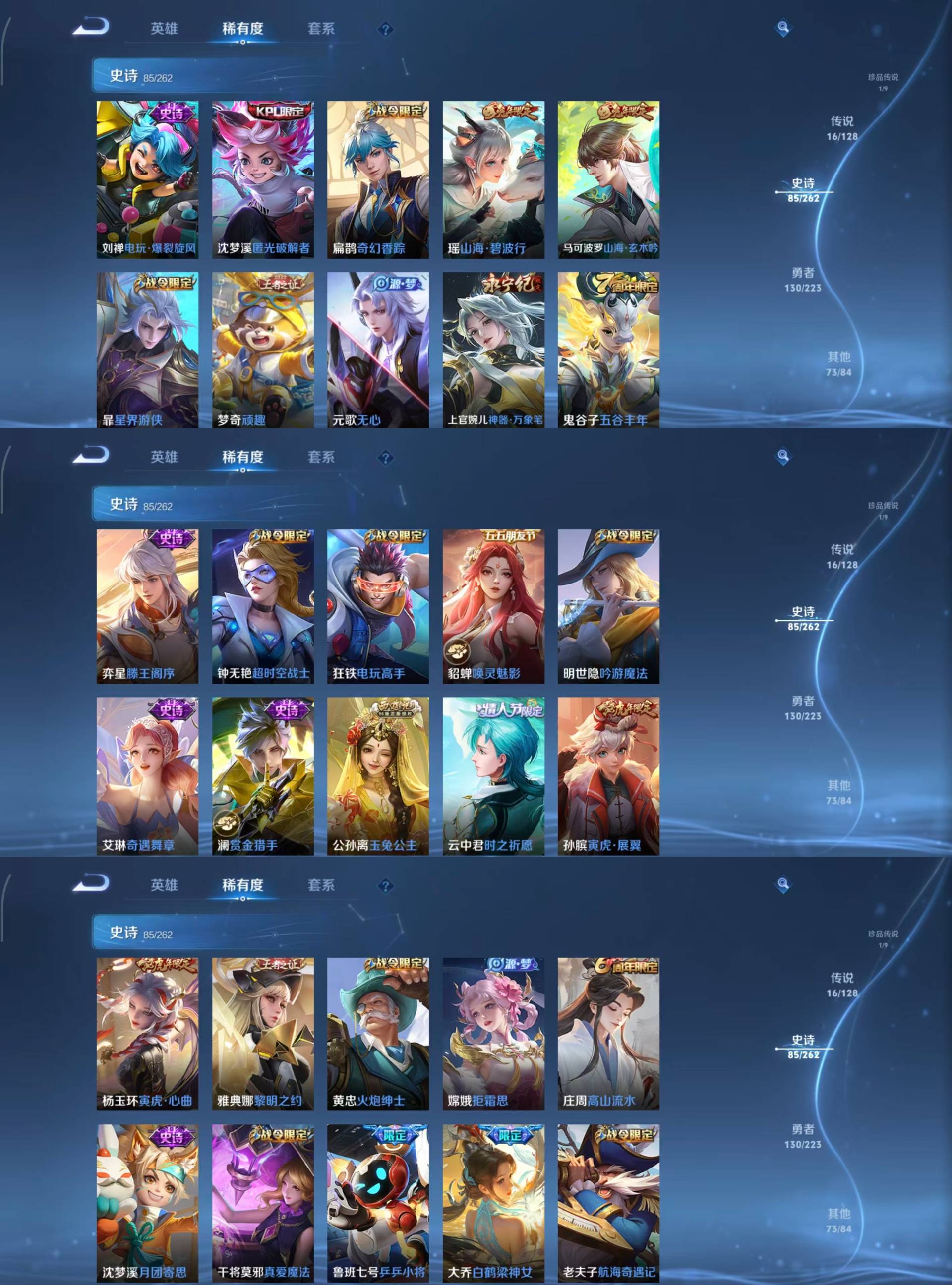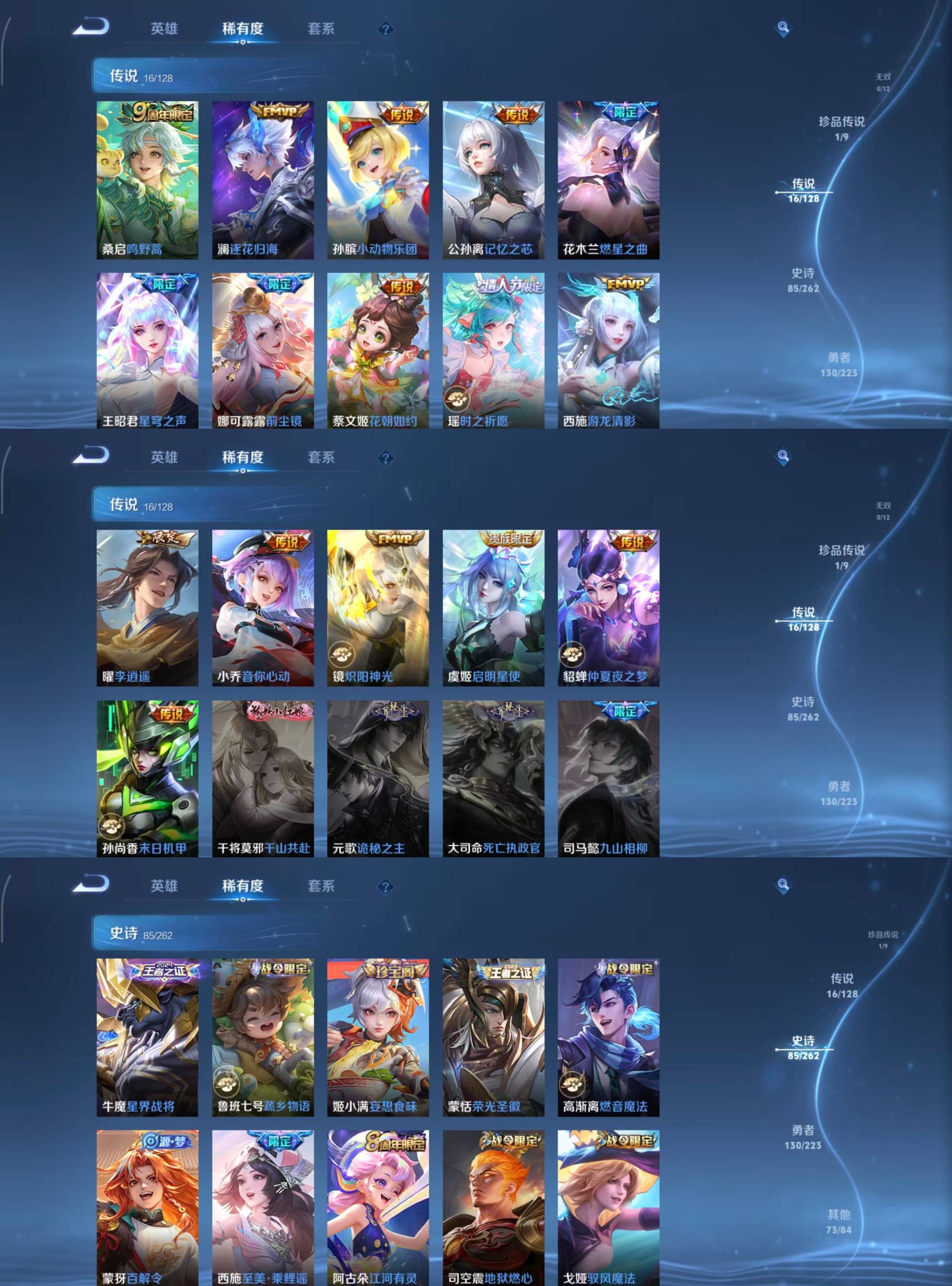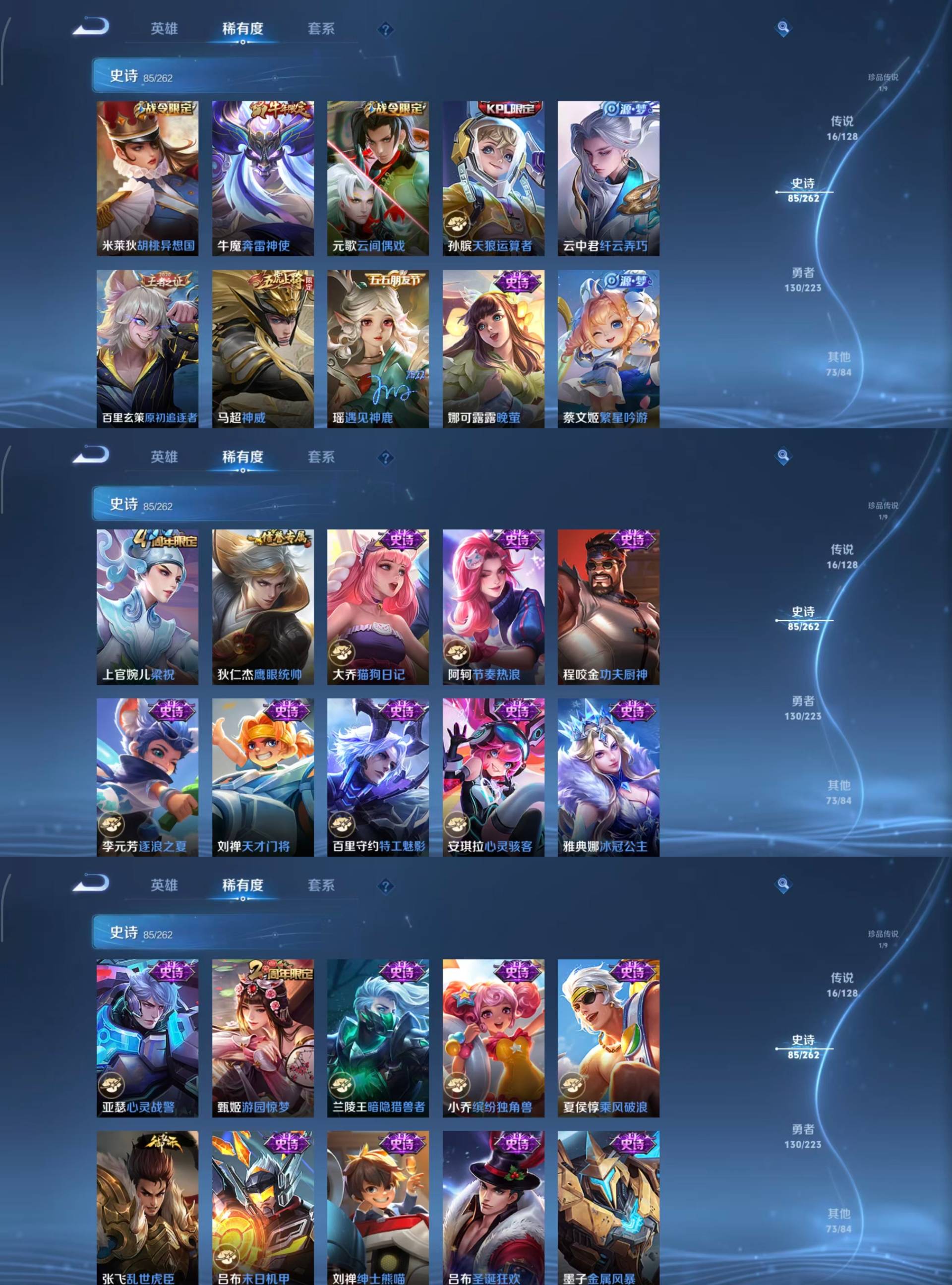 瑶遇见神鹿,娜可露露晚萤,李元芳逐浪之夏,大乔猫狗日记,阿轲节奏热浪,露娜紫霞仙子,王昭君偶像歌手,雅典娜冰冠公主,吕布末日机甲,嬴政摇滚巨星,刘禅绅士熊喵,刘禅天才门将,安琪拉心灵骇客,程咬金功夫厨神,兰陵王暗隐猎兽者,宫本武藏鬼剑武藏,亚瑟心灵战警,廉颇地狱岩魂,小乔缤纷独角兽,夏侯惇乘风破浪,墨子金属风暴,百里玄策原初追逐者,吕布圣诞狂欢,貂蝉圣诞恋歌,百里守约特工魅影,嬴政暗夜贵公子,嫦娥拒霜思,雅典娜黎明之约,澜赏金猎手,艾琳奇遇舞章,貂蝉唤灵魅影,弈星滕王阁序,沈梦溪匿光破解者,刘禅电玩·爆裂旋风,蒙犽百解令,高渐离燃音魔法