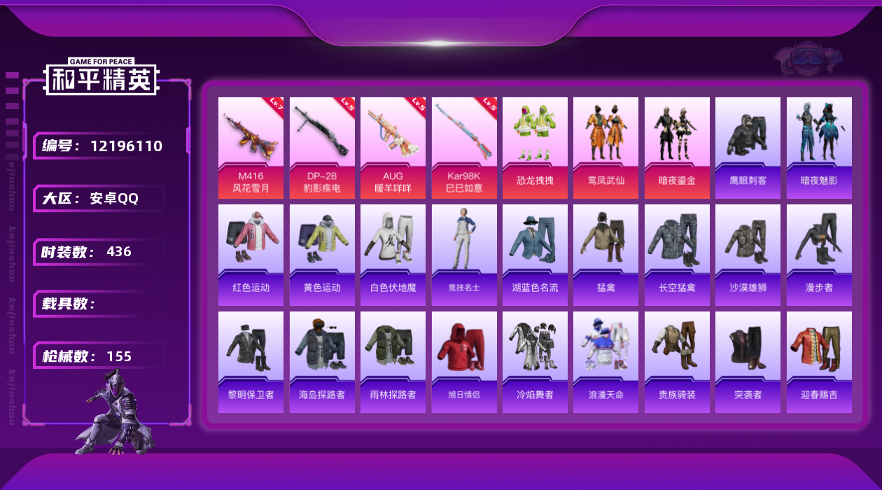 [12196110]3粉装 4特效枪 8印记 可二次 可修改实名 优质装备:M416风花雪月,七级M416-风花雪月,AUG-暖羊咩咩,Kar98K-巳巳如意 热门装扮:恐龙拽拽,鸾凤武仙,暗夜鎏金,鹰眼刺客,暗夜魅影 稀有枪皮:DP-28-豹影疾电 五级特效枪:五级Kar98K-巳巳如意,五级DP-28-豹影疾电,五级AUG-暖羊咩咩 紫色装扮:田园牧歌,轻风白浪,和煦暖阳,SS22特训,SS23特训,幻彩翩翩,妙红点点,香榭午后,白兰地假日,娇憨猪猪,酸甜橘柚,萌趣咩咩,SS21特训,SS31特训套装,冰川特警,冷焰舞者,旭日情侣,青涩时光,SS20特训,时空追击者,暴风机械师,SS16特训,冰爽风暴,萌趣颜团子,特种颜团子,飞驰魅影,音速流光,SS19特训,军刀雅典娜,豚鼠丹丹,甜心亚梦,虚音幻奏,瑞龙福将,团圆交子,SS17特训,异彩先驱,SS18特训,都市魅力,长空猛禽,雨林探路者,霓虹极客,迎春赐吉,风暴特警,缤纷果语,耀眼新星,虎虎生威吉莉,风行保卫者,蜜露汐语,魅力单车,鹤鸣,麻辣教官,黄色运动,黎明保卫者,龟仙人,龙魂突击队,沙漠毒蛇,极地朋克,柠萌假日,沙漠兵团,暗金炫舞,沙漠雄狮,海岛探路者,涂山之恋,滨海假日,夏日音浪,幻世战舞者,探宝勇士,湖蓝色名流,滨海厨神,白熊同盟,白色伏地魔,破晓战魂,破蛋小黄鸡,福星高照,空投萌叽,突袭者,红色运动,王牌教练,牛气冲天,炫蓝之夏,燃烧卡路里,猛禽,狂战萌兔,狂沙舞者,SS29特训,光矢逐梦,鱼渊荷华,玉兔迎春,燕燕于飞,巳巳如意,竞技名士,惊鸿侠骨,SS24特训(SS24特训套装),SS25特训,锦衣飞扬,SS27特训,浪漫天命,SS26特训,智谋强哥,人鱼之吻,耀粉歌者,绯格组合,漫步者,贵族骑装,冰冻风暴 优质战备:幻星舰长降落伞,太空嘟嘟飞行器,彩虹甜喵降落伞,垂柳戏鸭降落伞,百万伏特降落伞,神秘黑猫降落伞,烈焰拳霸降落伞