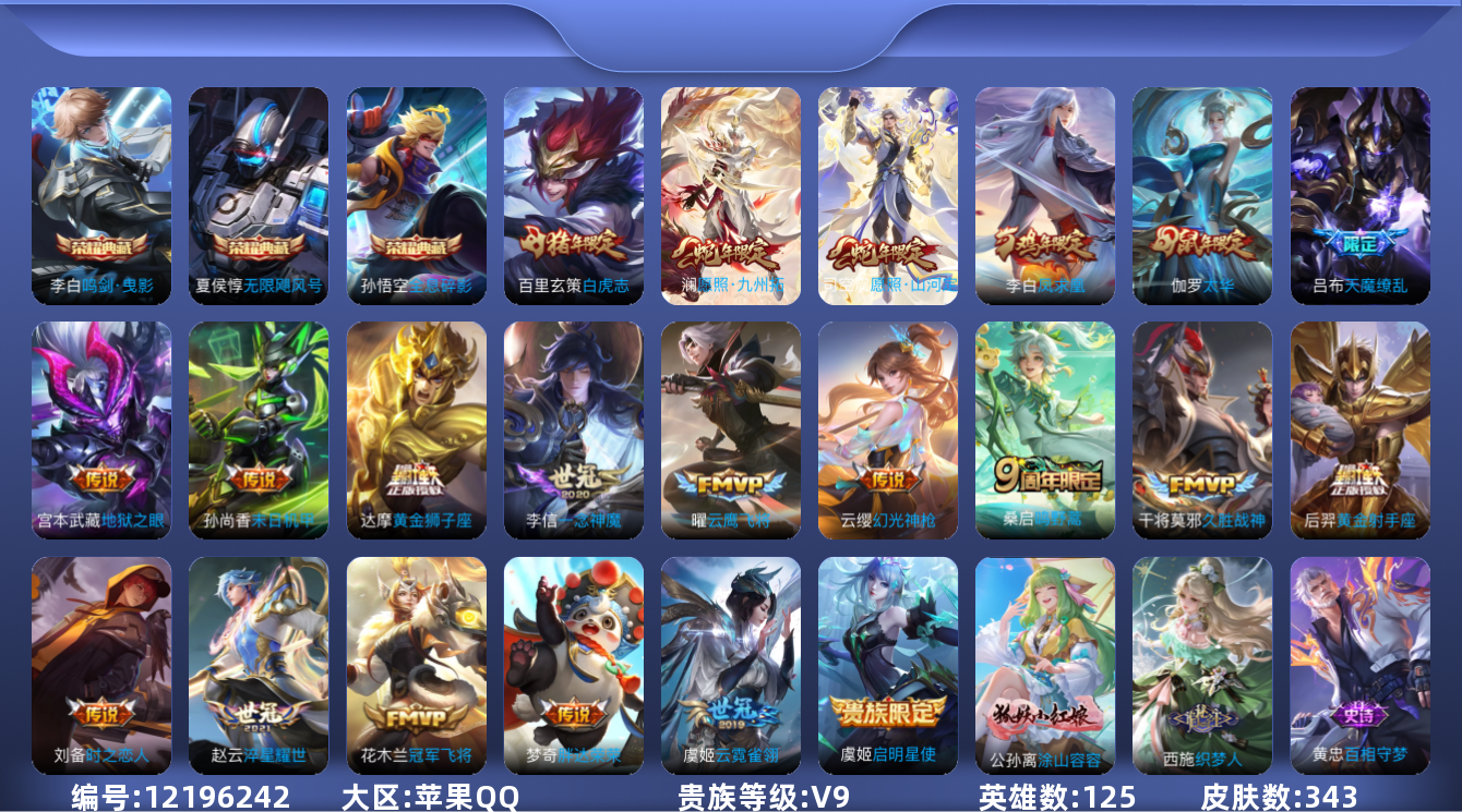 [12196242]V9 3典藏 21传说 125英雄 343皮肤 可修改实名 优质装备:无限飓风号(高达),鸣剑·曳影,全息碎影(猴子典藏),黄金狮子座,黄金射手座,冠军飞将,云鹰飞将(小将军),久胜战神,一念神魔,云霓雀翎,末日机甲-孙尚香(绿蚂蚱),地狱之眼,胖达荣荣,时之恋人-刘备(电焊工),淬星耀世,涂山容容 传说皮:幻光神枪 珍宝阁皮:妄想食味,优雅恋人,蔷薇恋人 限定皮:愿照·九州拓(澜年限),愿照·山河定(司空震年限),鸣野蒿,至尊宝,白虎志(电光耗子),凤求凰(白切鸡),凤凰于飞,太华(伽罗年限),魔法小厨娘,飞衡(韩信年限),玄嵩(庄周年限),瑞麟志(木兰年限),遇见飞天,冰锋战神,幽恒(沐浴露),游园惊梦,梁祝,天狼狩猎者,龙胆,逐梦之翼,烈魂,岱宗(典韦年限),天狼绘梦者,逐梦之影,玄武志(苏烈年限),纯白花嫁,一生所爱,天魔缭乱,青春决赛季,热情桑巴,美猴王 史诗皮:器灵·浮梦炉,化蝶舞,谪仙醉月,龙之律动,雪豹·霜爪,茶境仙,百相守梦-百里守约,星界特工,百相守梦-黄忠,织梦人,遇见神鹿,白龙吟,黄金分割率,特工魅影,千年之狐,魅语,百解令(蒙犽),无限星赏官,冰冠公主,偶像歌手,晚萤,电玩·爆裂旋风,龙骑士(小龙虾),末日机甲-吕布,猫狗日记-孙策,时之恋人-孙尚香,乱世虎臣,节奏热浪,摇滚巨星,水果甜心,绅士熊喵,天才门将,心灵骇客,功夫厨神,德古拉伯爵,暗隐猎兽者,幽灵船长,鬼剑武藏,心灵战警,舞动绿茵,地狱岩魂,拒霜思,乘风破浪,逐浪之夏,月团寄思,水晶猎龙者,曙光守护者,箭羽风息,金属风暴,原初追逐者,圣诞狂欢,圣诞恋歌,鹰眼统帅,暗夜贵公子,魅力维加斯,黎明之约,赏金猎手,奇遇舞章,未来纪元-赵云