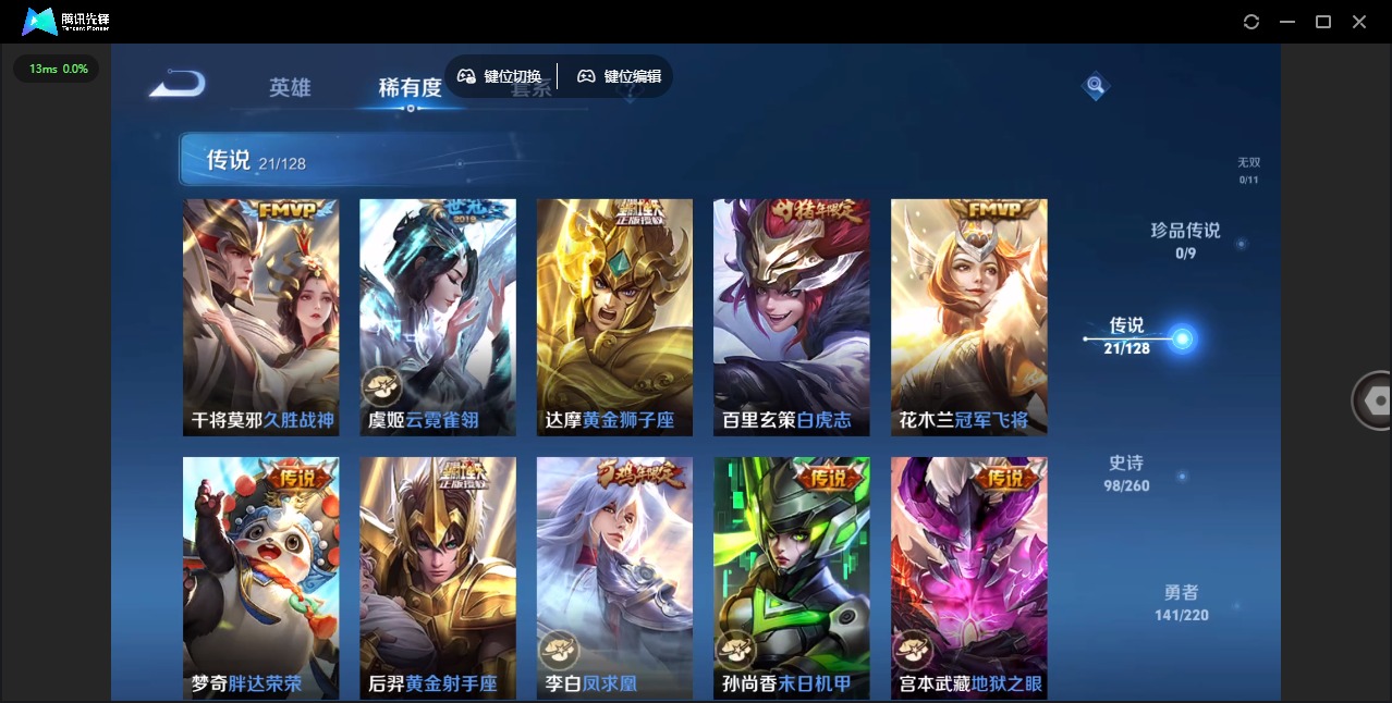 - [11515371]V7 1珍品传说 10传说 124英雄 206皮肤 可修改实名 优质装备:怪盗基德,黄金狮子座,一念神魔,山海·炽霜斩(李信年限),妄想实况,霜月吟 传说皮:幻光神枪 珍宝阁皮:优雅恋人,蔷薇恋人,玩趣恶龙 限定皮:愿照·九州拓(澜年限),愿照·山河定(司空震年限),愿照·众生和(妲己年限),逐霄战戟,陌上桑,鸣野蒿,神威(电光马子),飞衡(韩信年限),高山流水,五谷丰年,游园惊梦,李小龙,孙行者,猪悟能 史诗皮:化蝶舞,星界特工,星界战将,石田雨龙,破空之剑,谪仙醉月,百相守梦-百里守约,炽弈燎原,百相守梦-黄忠,黄金分割率,特工魅影,永昼,江河有灵,百解令(蒙犽),猫狗日记-孙策,节奏热浪,修罗,水果甜心,绅士熊喵,天才门将,星夜王子,德古拉伯爵,暗隐猎兽者,鬼剑武藏,暗渊魔法,心灵战警,纤云弄巧,拒霜思,缤纷独角兽,乘风破浪,水晶猎龙者,曙光守护者,箭羽风息,金属风暴,原初追逐者,圣诞狂欢,圣诞恋歌,鹰眼统帅,魅力维加斯,无心,未来纪元-赵云