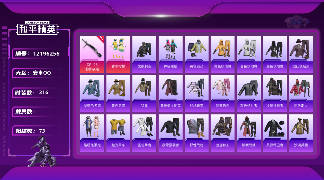 [12196256]1粉装 1特效枪 可二次 可修改实名 优质装备:香水柠檬 热门装扮:神秘黑猫,鹰眼刺客 稀有枪皮:DP-28-豹影疾电 一级特效枪:一级DP-28-豹影疾电 紫色装扮:SS2特训,SS3特训,军械专家,冰川特警,北国孤狼,青涩时光,SS15特训,银白舞王,SS13特训,治愈之星,迅捷之星,科技之星,SS14特训,萌趣颜团子,酒红色名流,酷萌兔限定,野性战魂,雪山精英,霓虹极客,耀动青春,街头潮人,跃动心情,风行保卫者,飞行日记,魅力单车,黄色伏地魔,黄色名流,黄色运动,黑色伏地魔,极速红龙,沙漠兵团,深蓝色名流,圣诞大吉,坚韧舞者,娴静芝兰,夏日音浪,夜莺强袭者,战地菁英,探宝勇士,湖蓝色名流,疯狂小兔子,白色伏地魔,破晓战魂,破蛋小黄鸡,甜蜜告白,竞技勇士朋克,牛气冲天,灰色格斗者,牛气满满,猛禽,镭射皇者,金羽特工,SS6特训,摩艾涂鸦,原初圣火,逆风勇士,SS12特训,梦之呓语,抹茶蜜豆,薄荷蓝莓,红酒骑士,风华少年志,白月香洋装,SS10特训,机械英豪,机械征服者,SS11特训,萌黄之夏,蓝调潮人,冷酷挑战者,海上生明月 优质战备:极限特训降落伞,环太平洋降落伞,古堡领主降落伞,夏日绵绵冰降落伞,阿狸红降落伞,银刃赛罗降落伞