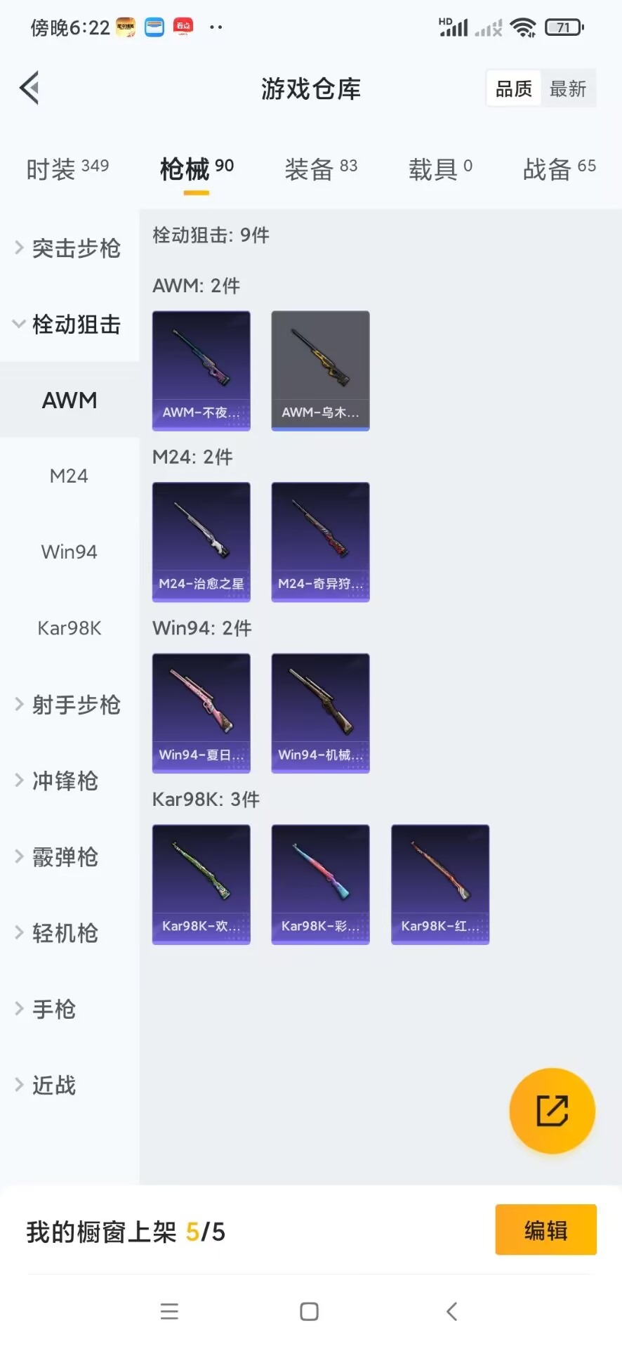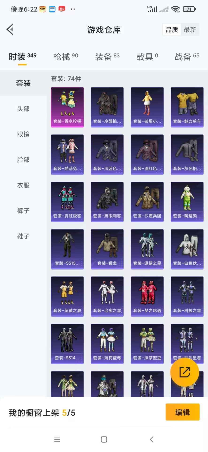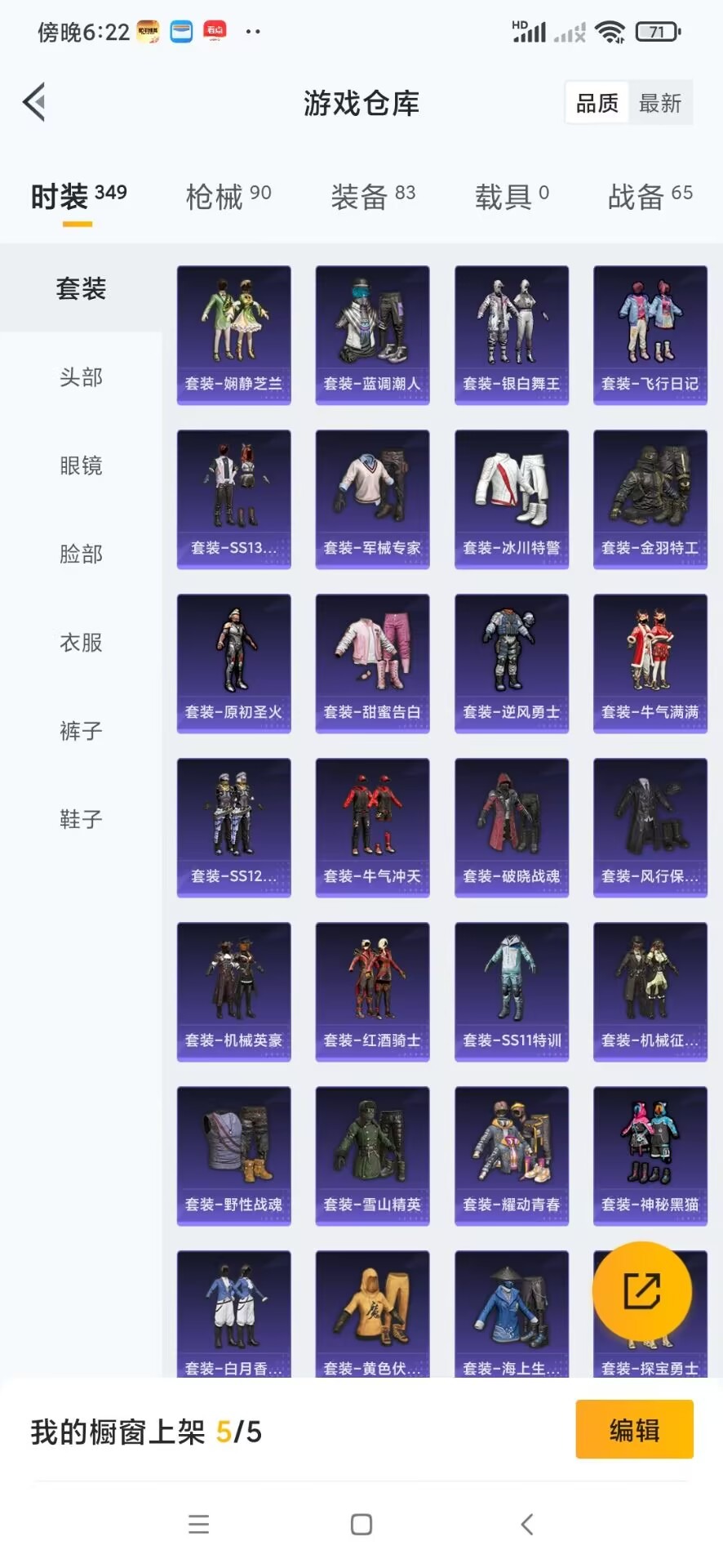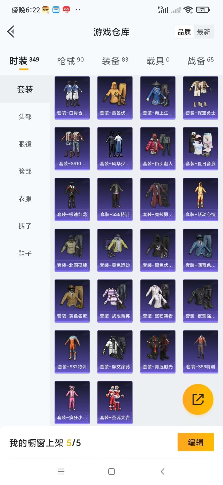 - [11604566]4粉装 6特效枪 3印记 可二次 可修改实名 身法装备:暗影哥特(红眼罩) 优质装备:天禅智恒,AMR-智耀战神,AUG-圣斗士星矢,星穹咏叹调,MK14-甜梦熊击,罗征,Vector-绯穹魔姬,奇迹舞步-美琪,Kar98K-巳巳如意 稀有枪皮:DP-28-豹影疾电 五级特效枪:五级Kar98K-巳巳如意,五级DP-28-豹影疾电,五级MK14-甜梦熊击,五级AUG-圣斗士星矢 四级特效枪:四级AMR-智耀战神 三级特效枪:三级Vector-绯穹魔姬 紫色装扮:冷焰舞者,北国孤狼,极速光影,云朵鹅,雪绒豹,SS33特训套装,顶瓜瓜,SS13特训,SS14特训,沁蓝冰爽,酷萌兔限定,霓虹街区,蓝色守护者,蓝色运动,蜜露汐语,飞行日记,魅力单车,鹤鸣,黄色名流,格斗先锋,暗金炫舞,海岛探路者,娴静芝兰,夏日音浪,怒火燎原,绮丽涂鸦,疯狂小兔子,白色伏地魔,破蛋小黄鸡,福星高照,突袭者,竞技勇士朋克,甜蜜熊情侣,潮流先锋,灼焰舞者,牛气满满,异域银装,鱼渊荷华,燕燕于飞,绒宝小鹅,暗影哥特(红眼罩),浪漫天命,SS6特训,SS7特训,SS8特训,大橘大利,星渊小夜曲,SS12特训,SS11特训,粉恋花,蓝冰羽,紫幽梦,SS32特训服(SS32特训套装),萌黄之夏,恋语绒绒 优质战备:萌物绒绒降落伞,繁龙极客飞行器,绝色倾城降落伞,繁龙极客降落伞,幻彩电音降落伞,幻星舰长飞行器,幻星舰长降落伞,无垠阁降落伞,绯穹魔姬降落伞,灵猫魔法师飞行器,第五大道降落伞,四圣焕新降落伞,齐天大圣降落伞