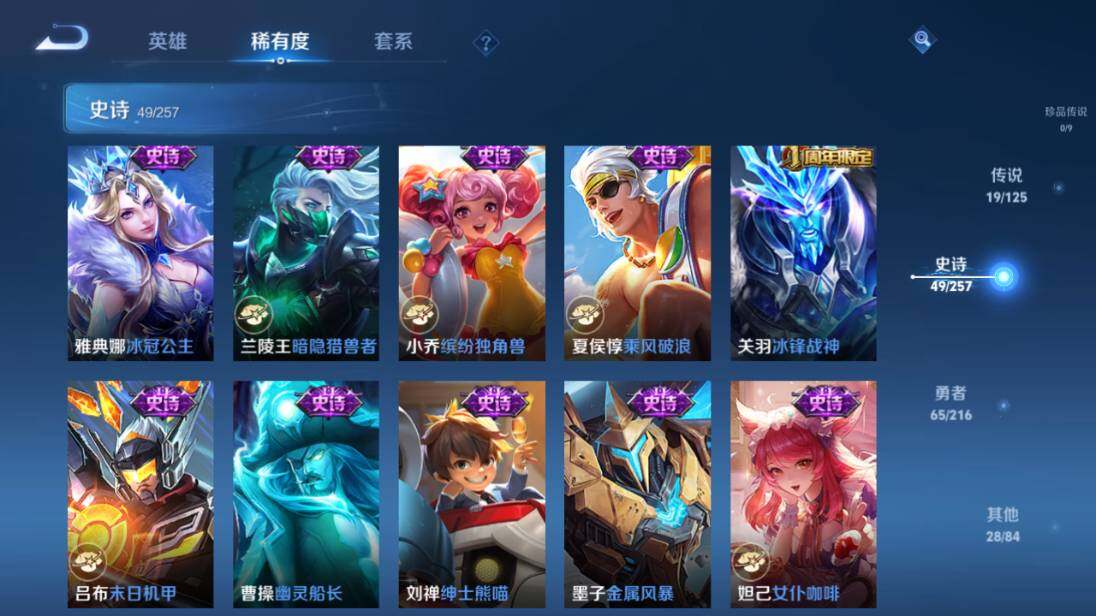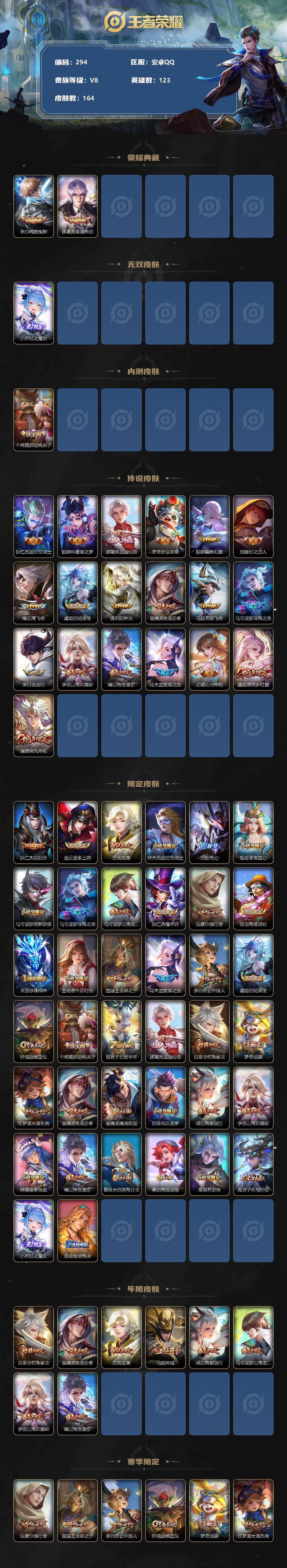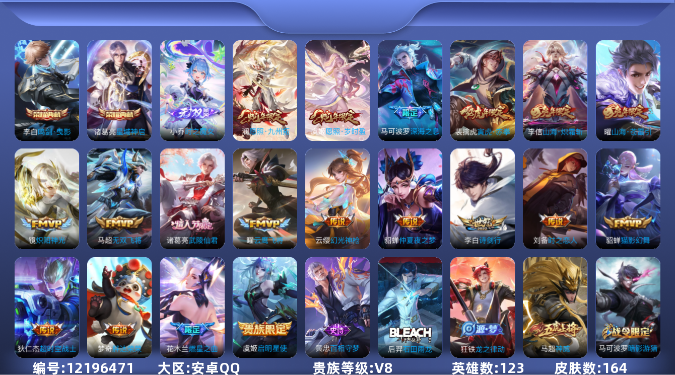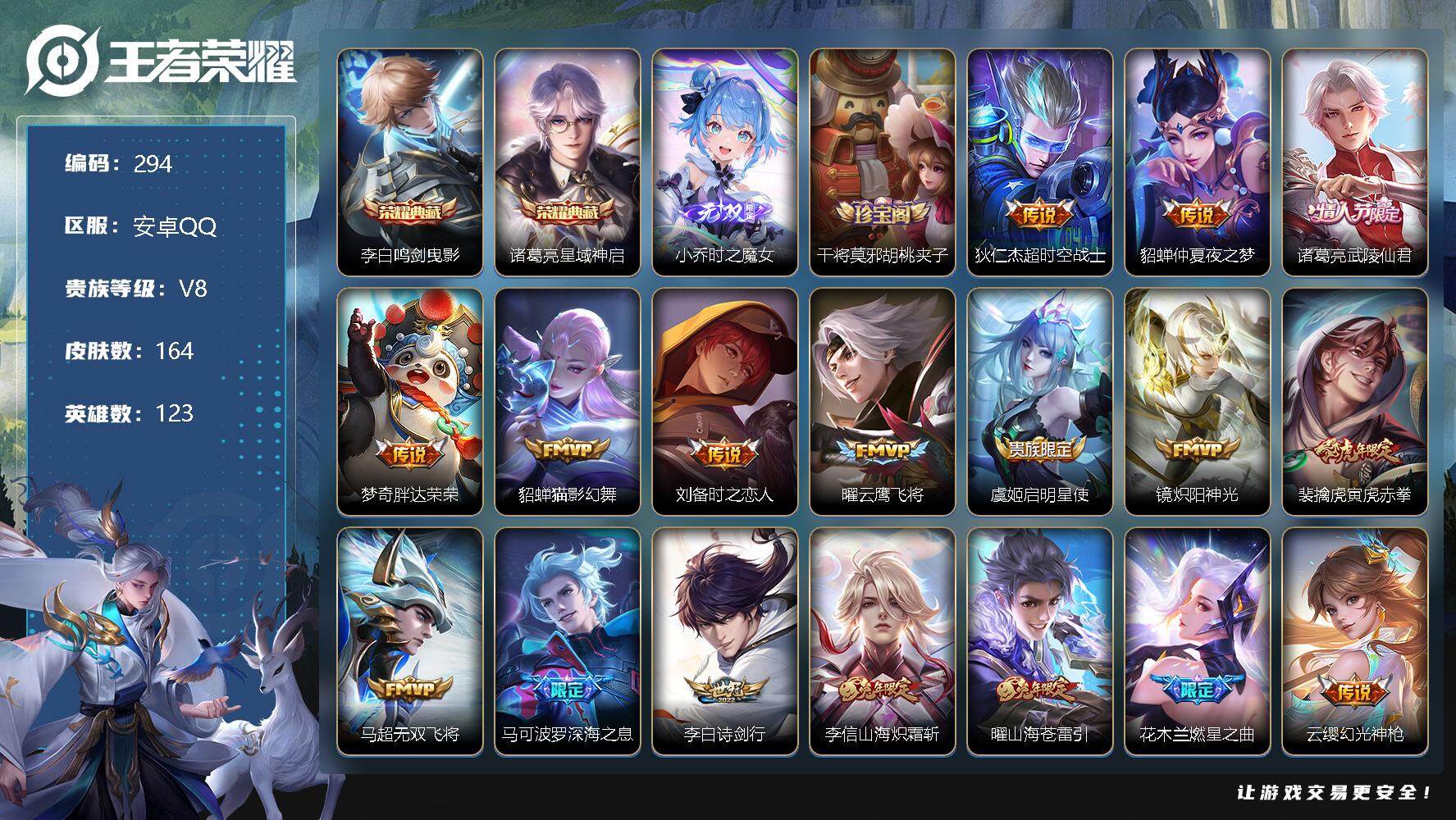 [12196471]【商品标题】:安卓Q-V8-至尊星耀I段位-123英雄-164皮肤-2典藏-0珍品无双-1无双-0珍品传说-19传说-49史诗
