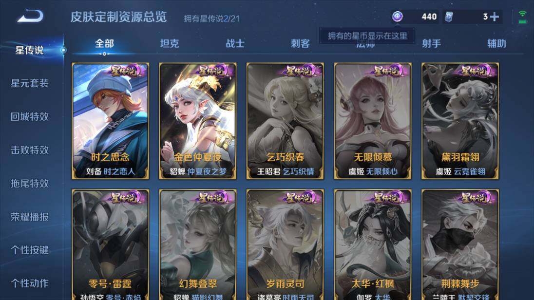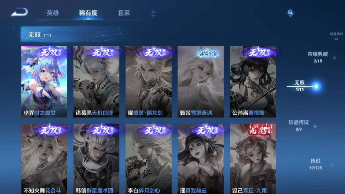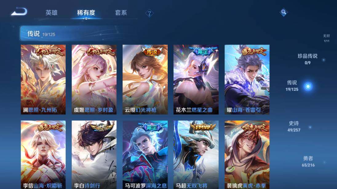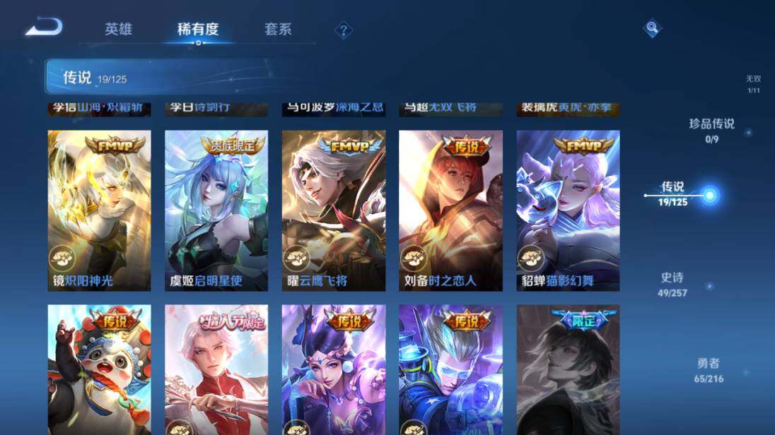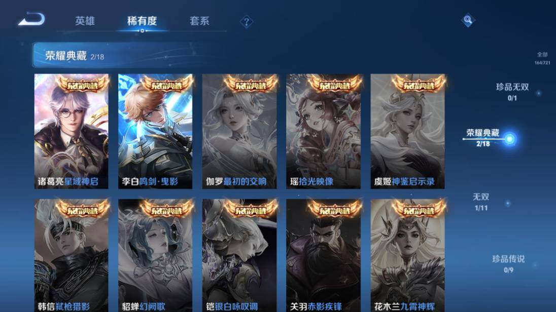 【传说皮肤】:狄仁杰超时空战士,貂蝉仲夏夜之梦,诸葛亮武陵仙君,梦奇胖达荣荣,貂蝉猫影幻舞,刘备时之恋人,曜云鹰飞将,虞姬启明星使,镜炽阳神光,裴擒虎寅虎赤拳,马超无双飞将,马可波罗深海之息,李白诗剑行,李信山海炽霜斩,曜山海苍雷引,花木兰燃星之曲,云缨幻光神枪,虞姬愿照岁时盈,澜愿照九州拓