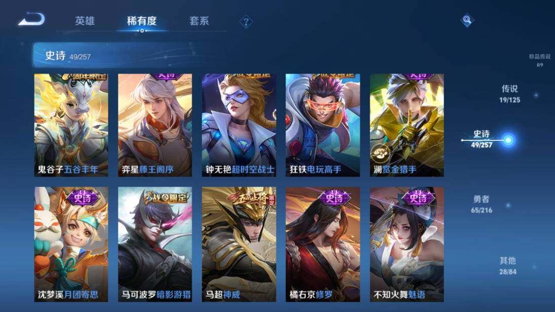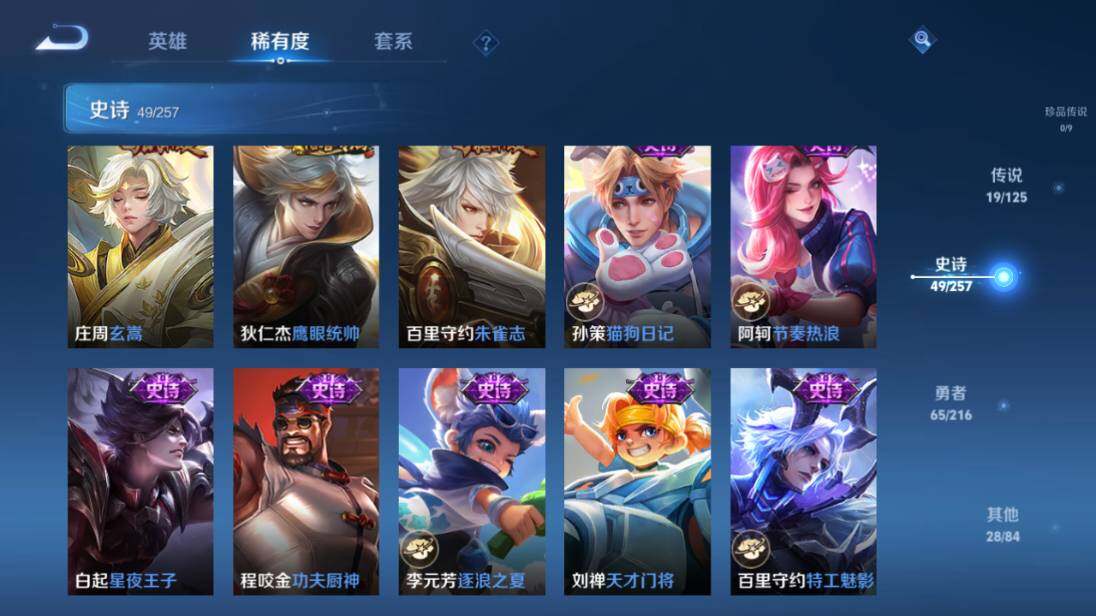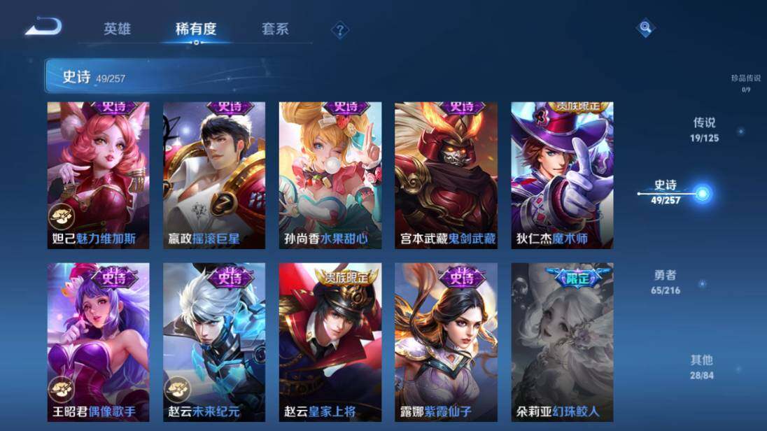 - PX_2057207-贵族等级: V7 英雄数: 124 皮肤数: 227 星传说: 零号·雷霆 传说皮: 炽阳神光,末日机甲-孙尚香,零号·赤焰,霜月吟,牧神诗旅,祥瑞亨通 限定皮: 冰锋战神,李小龙,御风骁将,神威,时之彼端,飞衡,天狼绘梦者,至尊宝,孙行者,鸣野蒿,逐霄战戟,愿照·九州拓
