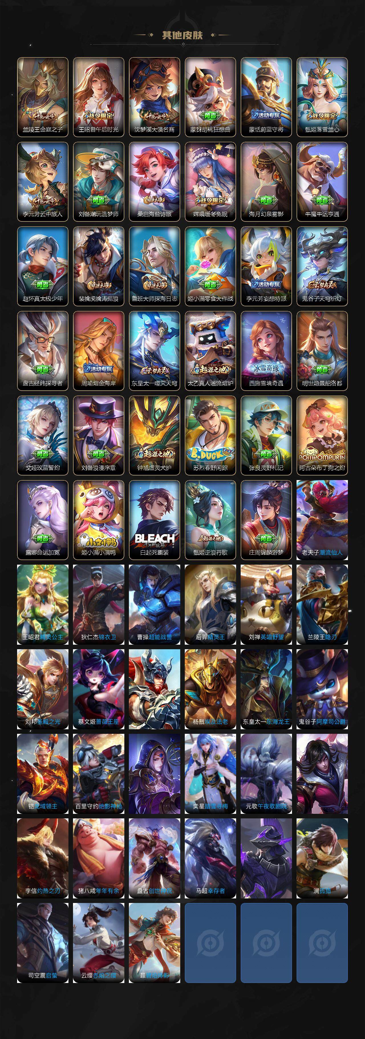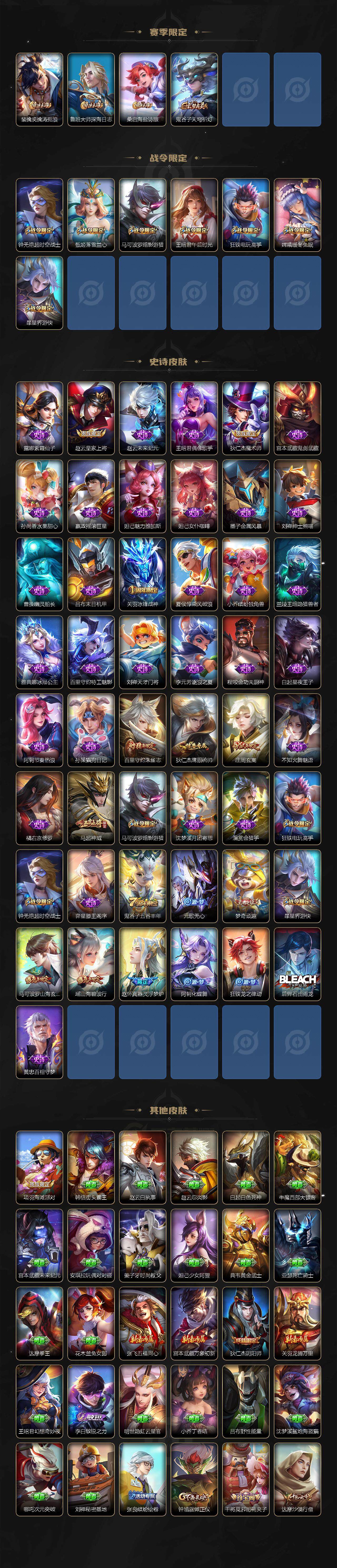 - [12091408]V7 1典藏 3传说 124英雄 274皮肤 可修改实名 优质装备:神鉴启示录,炽阳神光 珍宝阁皮:万物之道,蔷薇恋人 限定皮:愿照·岁时盈(虞姬年限),逐霄战戟,鸣野蒿,白晶晶,玄嵩(庄周年限),遇见飞天,五谷丰年,冰锋战神,梁祝,李小龙,霸王别姬-虞姬 史诗皮:器灵·浮梦炉,星界战将,芈月浮光幕影,蔬乡物语(鲁班七号),百相守梦-百里守约,紫霞仙子,黄金分割率,魅语,蒙恬荣光圣徽,冰冠公主,偶像歌手,白蛇,龙骑士(小龙虾),乱世虎臣,节奏热浪,女仆咖啡,水果甜心,绅士熊喵,星夜王子,心灵骇客,德古拉伯爵,暗隐猎兽者,鬼剑武藏,心灵战警,舞动绿茵,地狱岩魂,纤云弄巧,繁星吟游(呼啦呼啦),拒霜思,缤纷独角兽,乘风破浪,逐浪之夏,曙光守护者,箭羽风息,金属风暴,原初追逐者,圣诞狂欢,圣诞恋歌,鹰眼统帅,王者之锤,暗夜贵公子,魅力维加斯,黎明之约,未来纪元-赵云