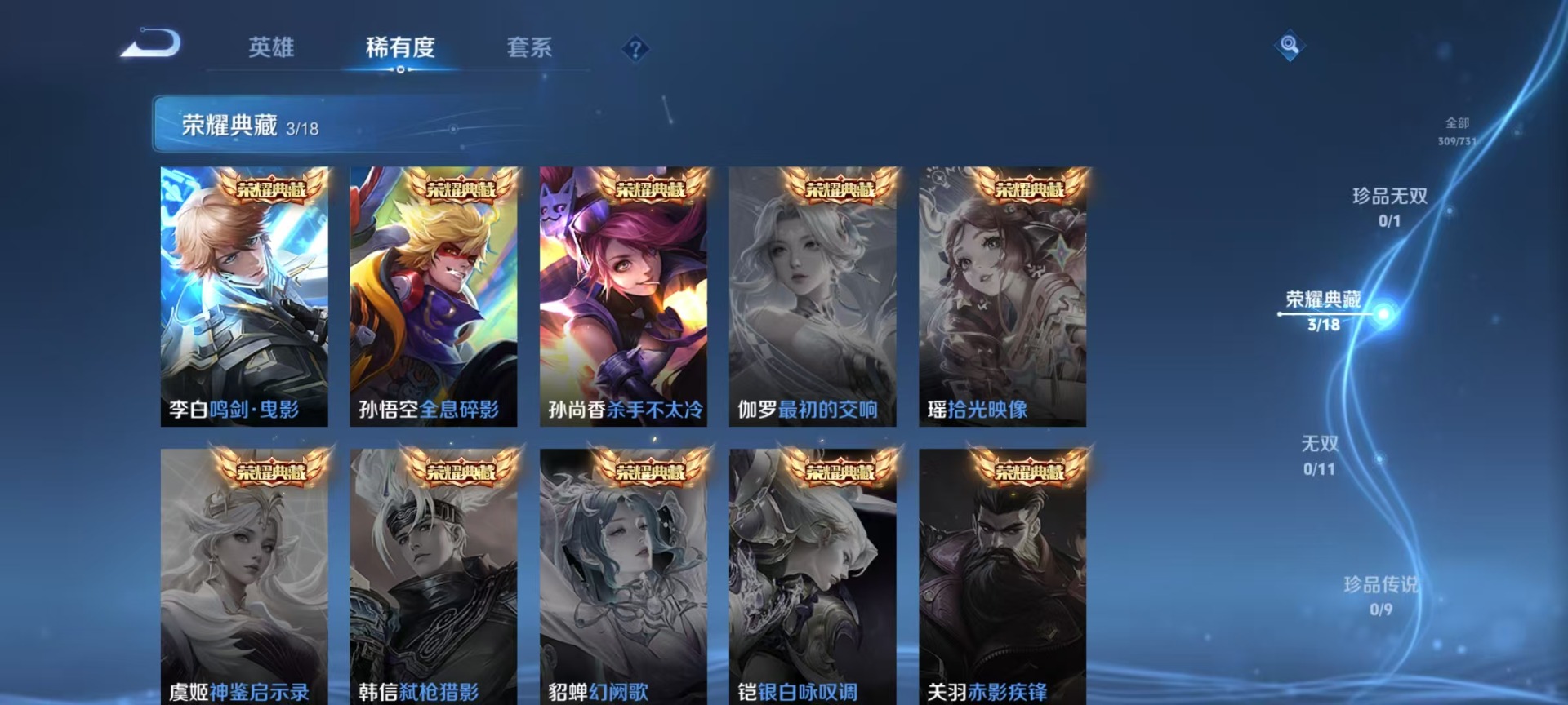 铠青龙志,伽罗天狼溯光者,镜匿光追影者,裴擒虎李小龙,上官婉儿梁祝,上官婉儿天狼绘梦者,马可波罗山海·玄木吟,猪八戒猪悟能,孙悟空孙行者,孙悟空大圣娶亲,孙悟空至尊宝,孙悟空美猴王,马超神威,赵云引擎之心,韩信逐梦之影,关羽武圣,关羽冰锋战神
