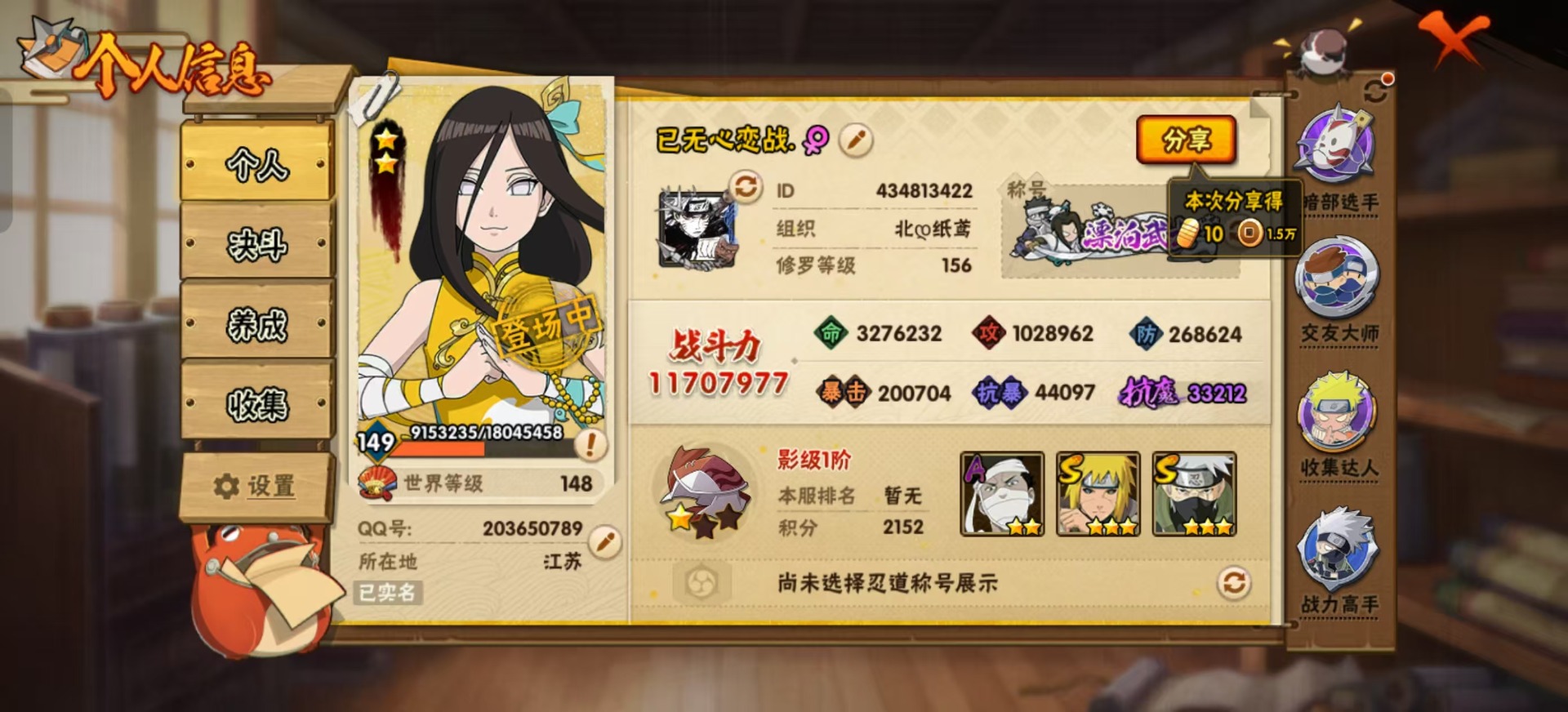 [12197321]V12 20S忍 39A忍 19通灵 1170.7W战力 可二次 可修改实名 优质装备:宇智波鼬「秽土转生」,千手扉间「秽土转生」,波风水门「秽土转生」,猿飞日斩「秽土转生」,长门「秽土转生」,宇智波斑,千手扉间,神秘面具男,鬼灯幻月「二代目水影」,“宇智波斑” 「白面具」,旗木卡卡西「须佐能乎」,自来也 「传说中的三忍」 S级忍者:自来也 「舞之豪杰」,宇智波鼬 「须佐能乎」,佩恩「天道」,猿飞日斩,波风水门,大蛇丸,自来也,纲手