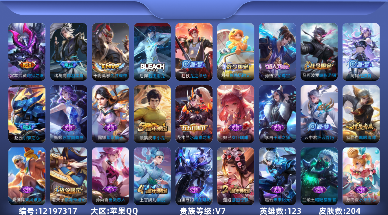[12197317]V7 3传说 123英雄 204皮肤 可修改实名 优质装备:久胜战神,地狱之眼,鹤羽星尊 珍宝阁皮:蔷薇恋人 限定皮:至尊宝,游园惊梦,梁祝,李小龙,引擎之心 史诗皮:鸭鸭历险记-刘禅,化蝶舞,龙之律动,石田雨龙,紫霞仙子,特工魅影,千年之狐,匿光侦查者,偶像歌手,乱世虎臣,女仆咖啡,水果甜心,功夫厨神,暗隐猎兽者,纤云弄巧,乘风破浪,逐浪之夏,水晶猎龙者,金属风暴,圣诞狂欢,圣诞恋歌,鹰眼统帅,魅力维加斯,未来纪元-赵云