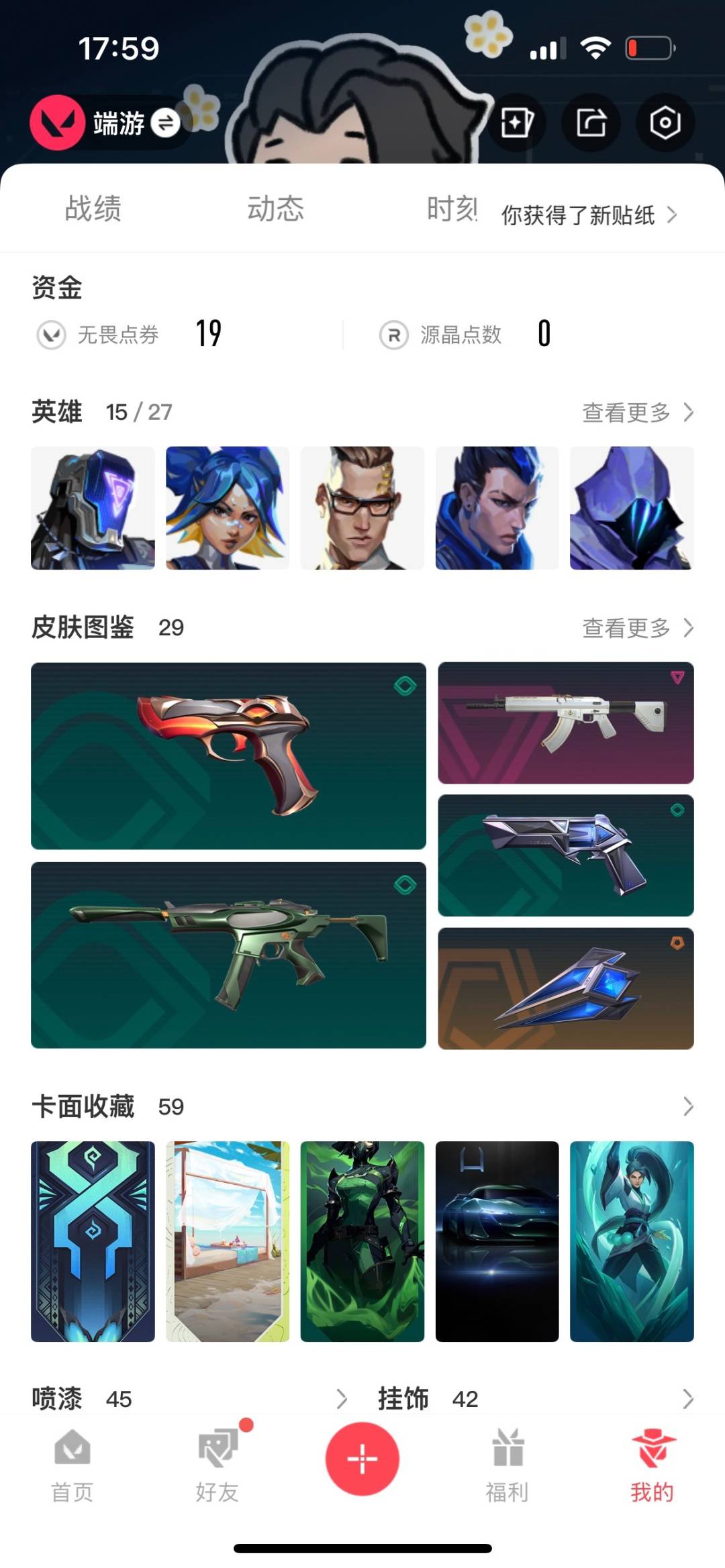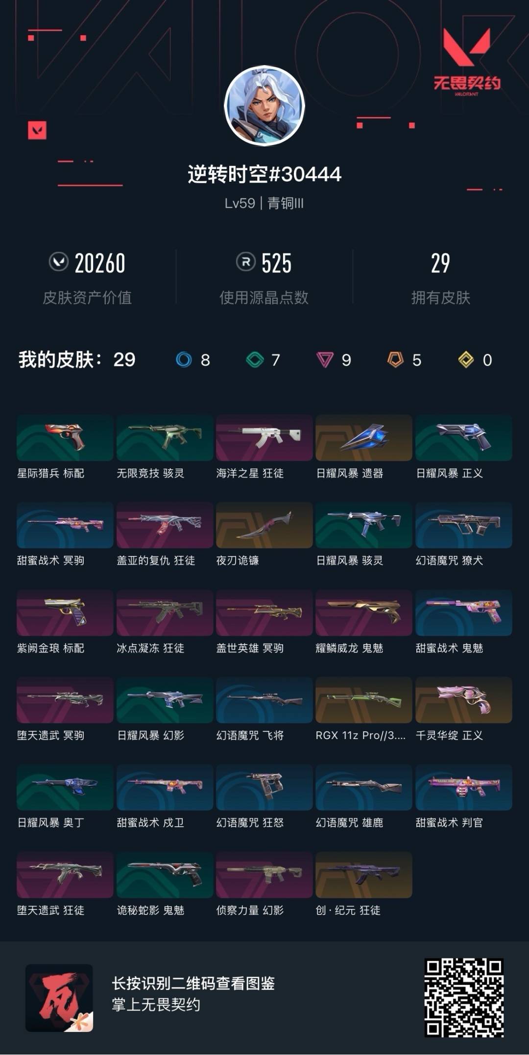 [12197572]5橙皮 9紫皮 29皮肤 15英雄 59卡面 525已用源晶 青铜 优质装备:狂徒-盖亚的复仇,幻影-侦察力量,冥驹-堕天遗武,正义-千灵华绽,标配-紫阙金琅,狂徒-冰点凝冻,夜刃诡镰,鬼魅-耀鳞威龙 步枪皮肤:狂徒-创·纪元,狂徒-海洋之星,狂徒-堕天遗武 狙击枪皮肤:冥驹-盖世英雄,莽侠-RGX 11z Pro 3.0