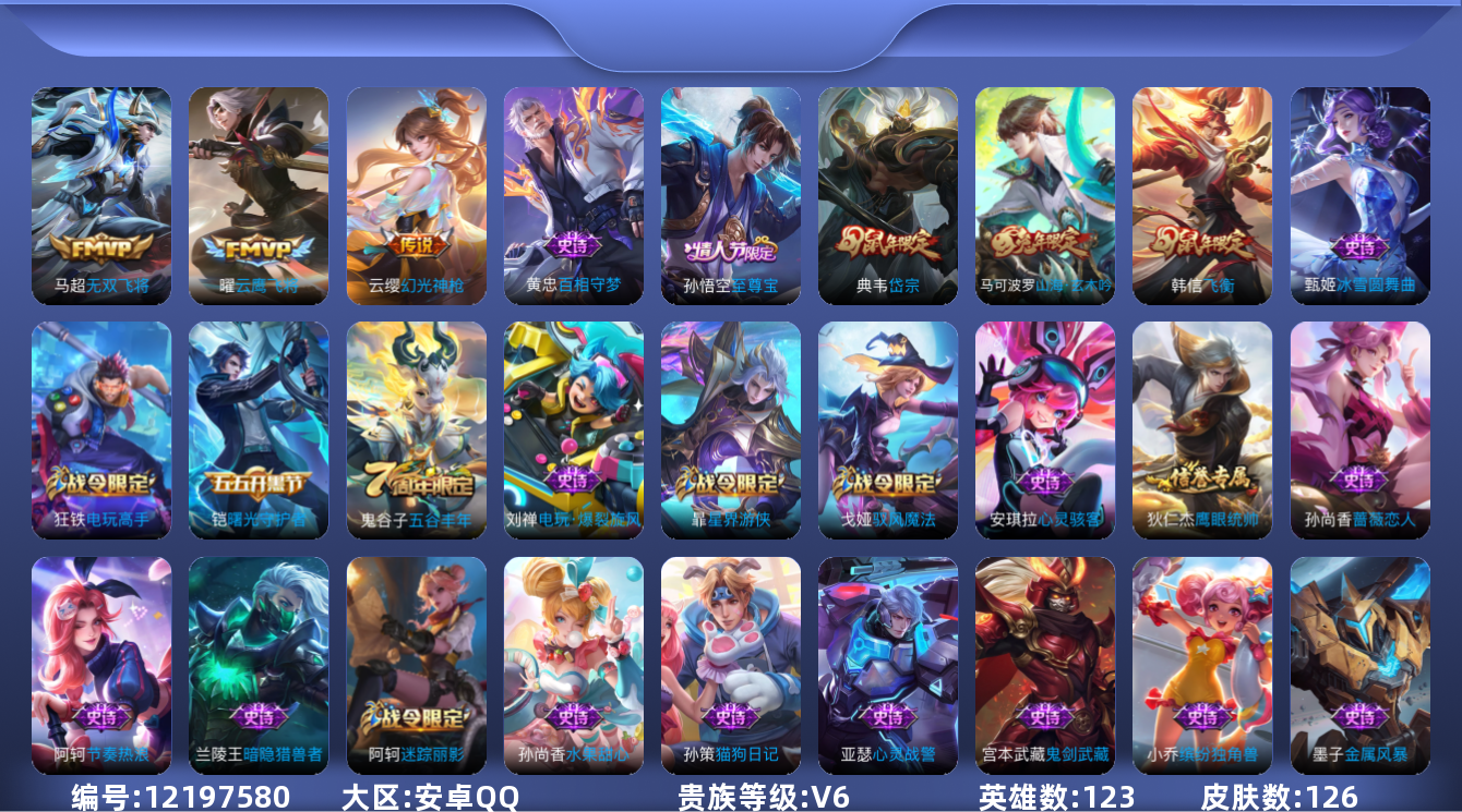 [12197580]V6 3传说 123英雄 126皮肤 可修改实名 优质装备:云鹰飞将(小将军),无双飞将 传说皮:幻光神枪 珍宝阁皮:蔷薇恋人 限定皮:至尊宝,飞衡(韩信年限),五谷丰年,岱宗(典韦年限),山海·玄木吟(马可年限) 史诗皮:百相守梦-黄忠,冰冠公主,电玩·爆裂旋风,猫狗日记-孙策,节奏热浪,摇滚巨星,水果甜心,心灵骇客,功夫厨神,暗隐猎兽者,鬼剑武藏,心灵战警,地狱岩魂,缤纷独角兽,逐浪之夏,曙光守护者,金属风暴,鹰眼统帅