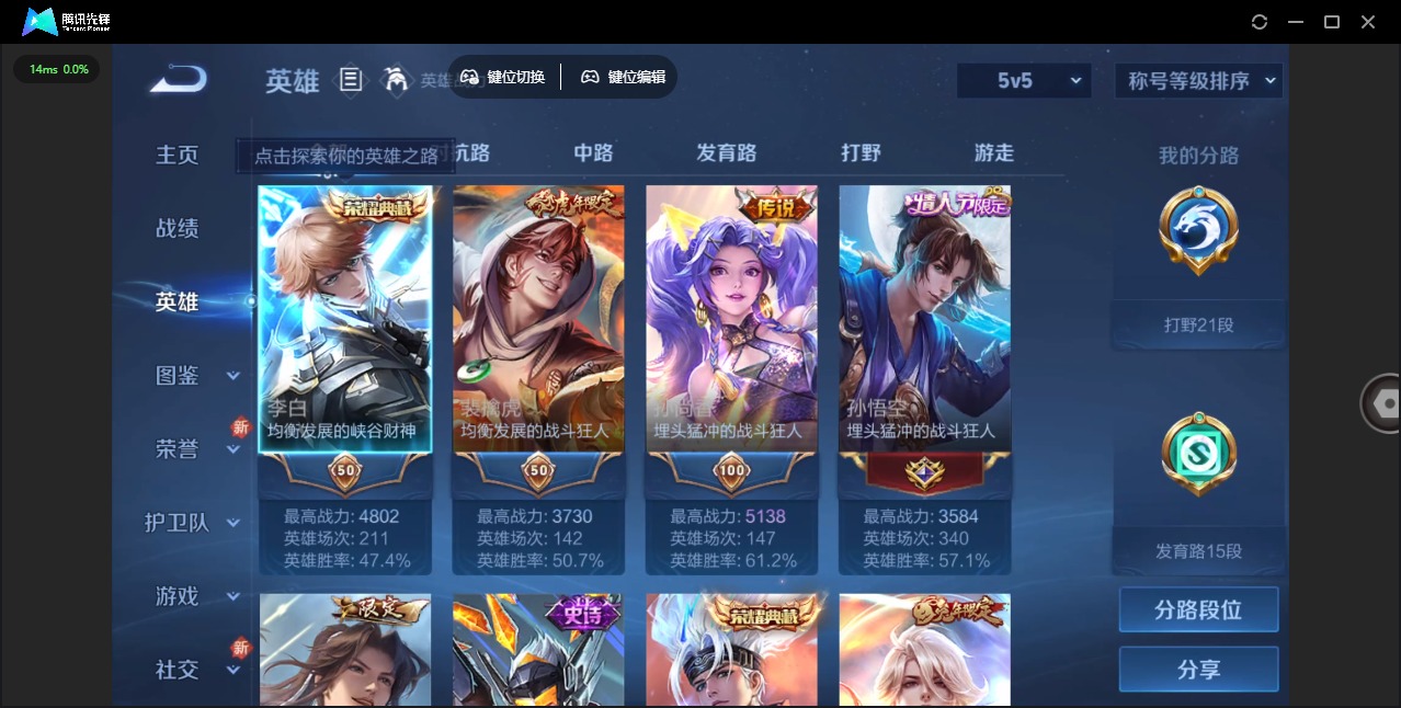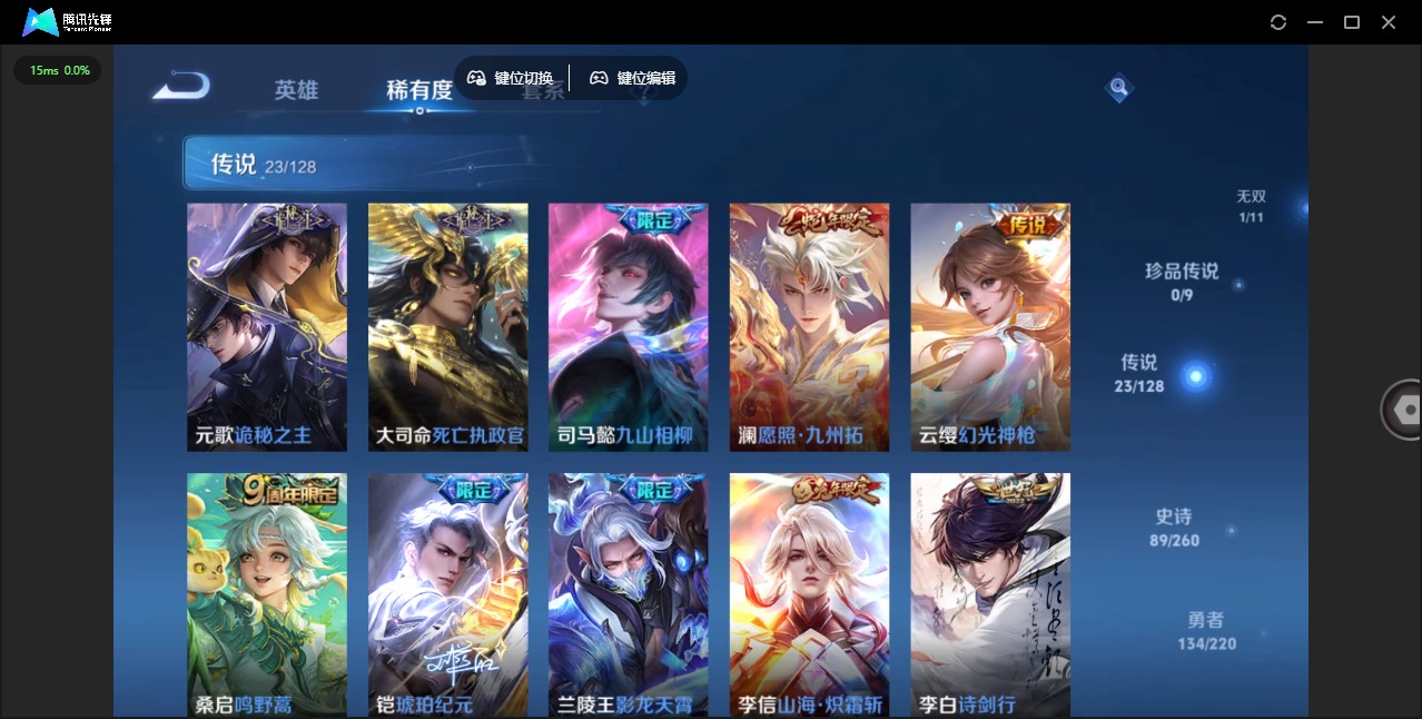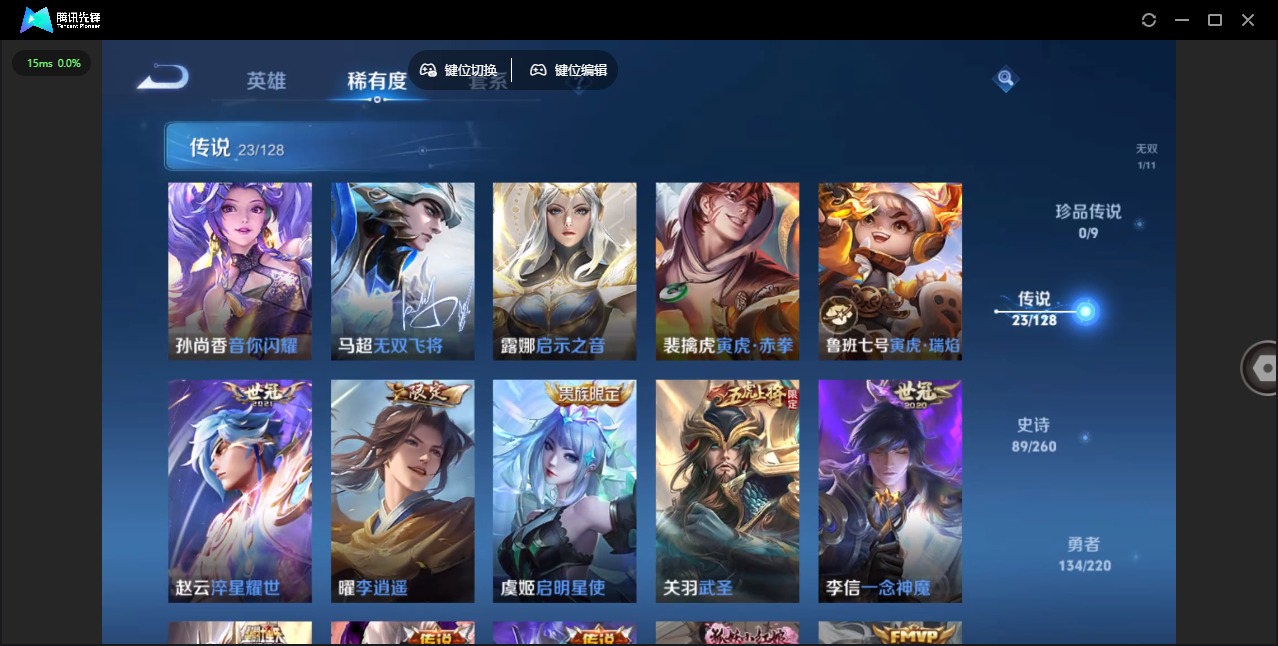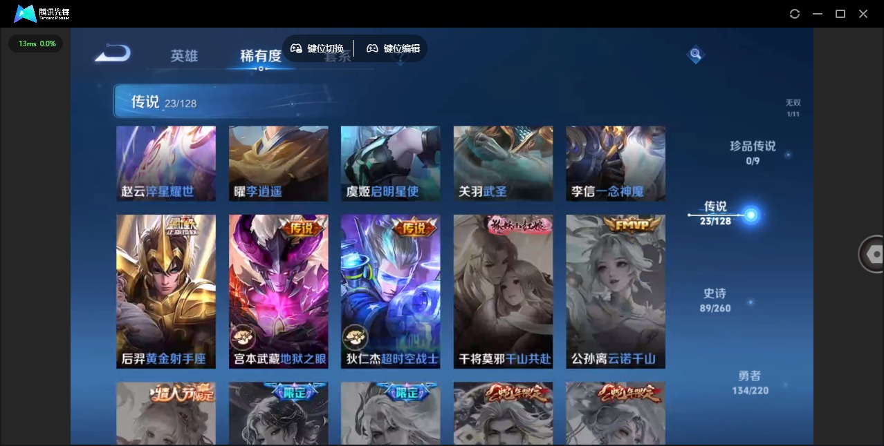 - PX_2093921-实名: 可修改 贵族等级: V5 英雄数: 77 皮肤数: 46 传说皮: 云鹰飞将 限定皮: 逐霄战戟,愿照·山河定
