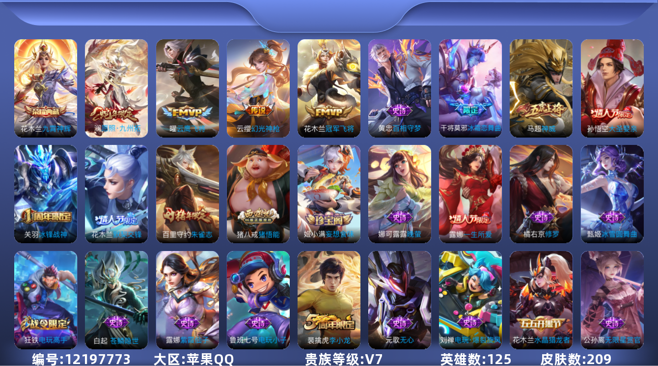 [12197773]V7 1典藏 4传说 125英雄 209皮肤 可修改实名 优质装备:九霄神辉(木兰典藏),冠军飞将,云鹰飞将(小将军) 传说皮:幻光神枪 珍宝阁皮:妄想食味,女武神 限定皮:愿照·九州拓(澜年限),神威(电光马子),瑞麟志(木兰年限),遇见飞天,冰锋战神,游园惊梦,梁祝,逐梦之星,李小龙,朱雀志(守约年限),默契交锋-花木兰,猪悟能,一生所爱,大圣娶亲,冰霜恋舞曲,云端筑梦师 史诗皮:苍鳞隐世,百相守梦-黄忠,紫霞仙子,电玩小子(小书包),黄金分割率,千年之狐,无限星赏官,偶像歌手,晚萤,电玩·爆裂旋风,龙骑士(小龙虾),末日机甲-吕布,猫狗日记-孙策,节奏热浪,修罗,摇滚巨星,水果甜心,天才门将,德古拉伯爵,幽灵船长,鬼剑武藏,地狱岩魂,纤云弄巧,繁星吟游(呼啦呼啦),缤纷独角兽,水晶猎龙者,原初追逐者,圣诞狂欢,圣诞恋歌,鹰眼统帅,黎明之约,无心