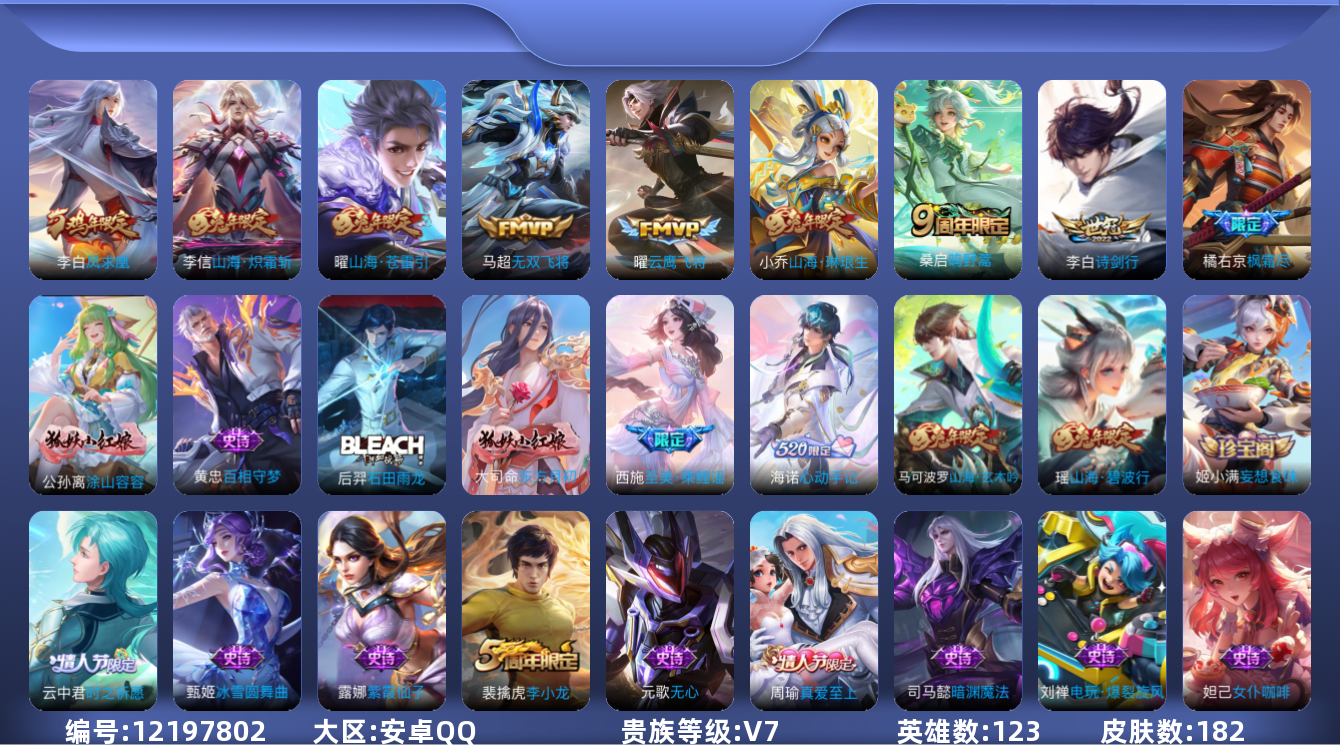 [12197802]V7 9传说 123英雄 182皮肤 可修改实名 优质装备:云鹰飞将(小将军),无双飞将,山海·炽霜斩(李信年限),山海·琳琅生(小乔年限),山海·苍雷引(电光曜子),涂山容容 珍宝阁皮:妄想食味 限定皮:逐霄战戟,鸣野蒿,凤求凰(白切鸡),山海·碧波行(瑶年限),至美·乘鲤谣,诗剑行,李小龙,真爱至上,时之祈愿-云中君,百木心枪,枫霜尽,山海·玄木吟(马可年限) 史诗皮:石田雨龙,战舞者,东方月初,海诺心动手记,百相守梦-黄忠,紫霞仙子,特工魅影,江河有灵,百解令(蒙犽),蒙恬荣光圣徽,偶像歌手,电玩·爆裂旋风,末日机甲-吕布,猫狗日记-孙策,节奏热浪,女仆咖啡,水果甜心,星夜王子,心灵骇客,功夫厨神,暗隐猎兽者,鬼剑武藏,暗渊魔法,心灵战警,舞动绿茵,纤云弄巧,拒霜思,缤纷独角兽,逐浪之夏,金属风暴,圣诞恋歌,鹰眼统帅,魅力维加斯,滕王阁序,无心