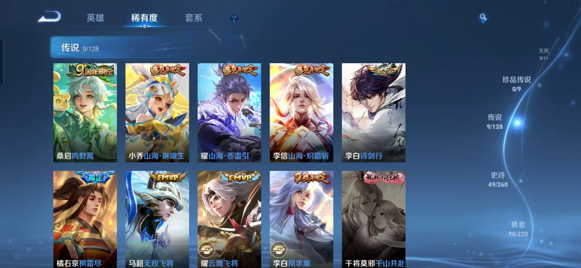 - [12229376]V8 1典藏 8传说 123英雄 218皮肤 可修改实名 优质装备:星域神启(倪克斯贼亮),一念神魔,末日机甲-孙尚香(绿蚂蚱),地狱火,淬星耀世,超时空战士-狄仁杰,无双飞将,山海·苍雷引(电光曜子) 珍宝阁皮:胡桃夹子,玩趣恶龙 限定皮:傲雪梅枪,遇见飞天,高山流水,五谷丰年,梁祝,辉光之辰,真爱至上,孙行者,匿光追影者 史诗皮:百相守梦-百里守约,星界特工,百相守梦-黄忠,紫霞仙子,苍穹之光,电玩小子(小书包),黄金分割率,特工魅影,千年之狐,江河有灵,蒙恬荣光圣徽,冰冠公主,龙骑士(小龙虾),末日机甲-吕布,猫狗日记-孙策,乱世虎臣,节奏热浪,摇滚巨星,水果甜心,绅士熊喵,星夜王子,心灵骇客,功夫厨神,德古拉伯爵,暗隐猎兽者,幽灵船长,鬼剑武藏,心灵战警,乘风破浪,逐浪之夏,水晶猎龙者,曙光守护者,箭羽风息,金属风暴,原初追逐者,圣诞狂欢,圣诞恋歌,鹰眼统帅,魅力维加斯,黎明之约,无心,未来纪元-赵云