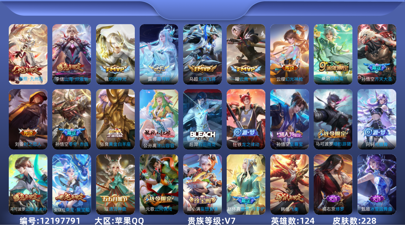 [12197791]V7 12传说 124英雄 228皮肤 可修改实名 社交场景限制 女号 优质装备:云鹰飞将(小将军),黄金白羊座,炽阳神光,零号·赤焰,时之恋人-刘备(电焊工),无双飞将,山海·炽霜斩(李信年限),霜月吟,涂山容容 传说皮:幻光神枪 珍宝阁皮:妄想食味 限定皮:愿照·九州拓(澜年限),逐霄战戟,鸣野蒿,至尊宝,飞衡(韩信年限),齐天大圣,梁祝,李小龙,山海·玄木吟(马可年限) 史诗皮:器灵·浮梦炉,化蝶舞,星界战将,谪仙醉月,龙之律动,石田雨龙,怒海争锋,蒙犽顽岩魄,芈月浮光幕影,上官婉儿群星魔术团,乘龙·聚宝船(安琪拉年限),遇见神鹿,紫霞仙子,特工魅影,高渐离燃音魔法,冰冠公主,电玩·爆裂旋风,末日机甲-吕布,猫狗日记-孙策,时之恋人-孙尚香,乱世虎臣,节奏热浪,修罗,女仆咖啡,水果甜心,绅士熊喵,功夫厨神,暗隐猎兽者,幽灵船长,鬼剑武藏,暗渊魔法,心灵战警,纤云弄巧,繁星吟游(呼啦呼啦),缤纷独角兽,乘风破浪,逐浪之夏,水晶猎龙者,曙光守护者,金属风暴,原初追逐者,圣诞狂欢,圣诞恋歌,鹰眼统帅,魅力维加斯,赏金猎手,无心,未来纪元-赵云