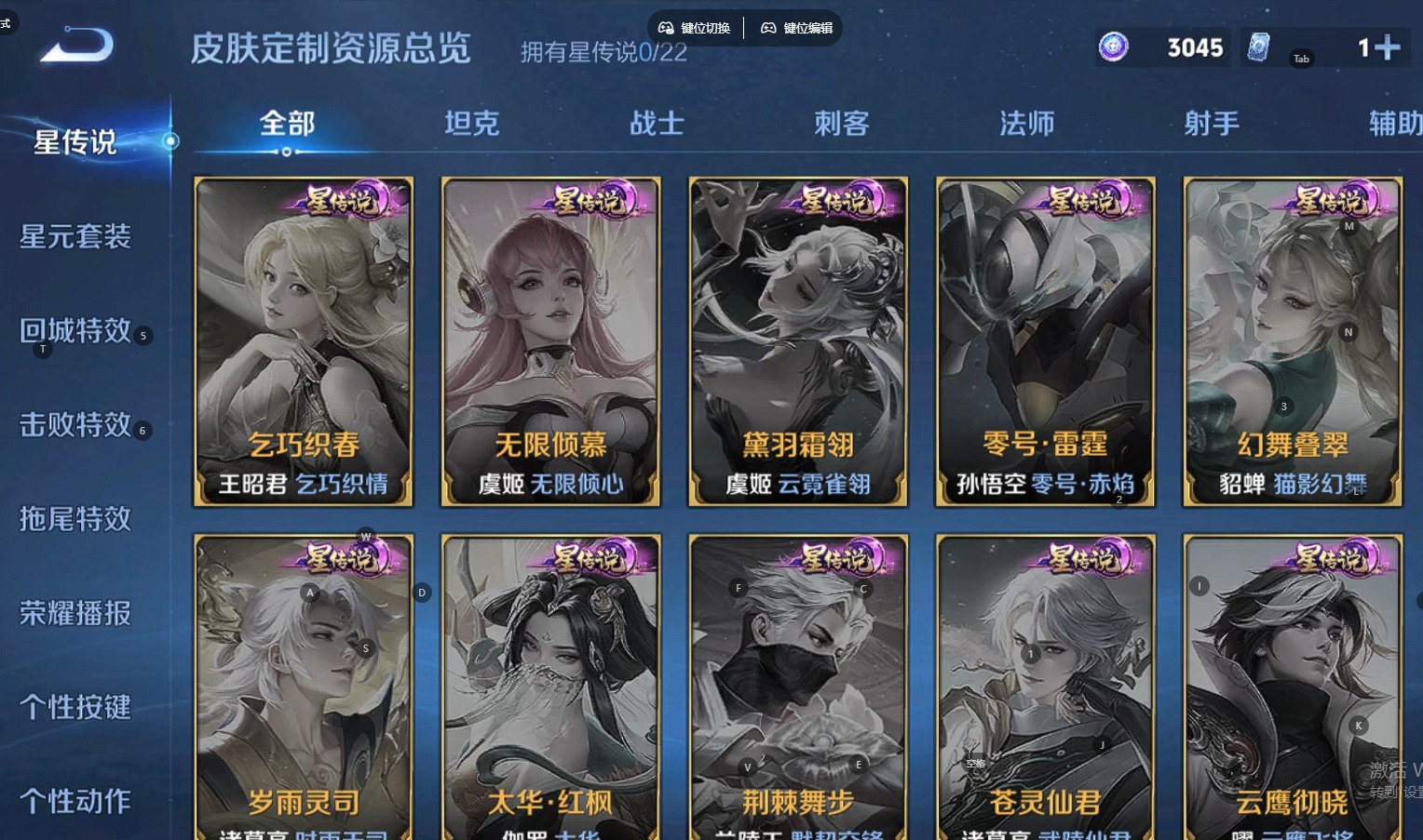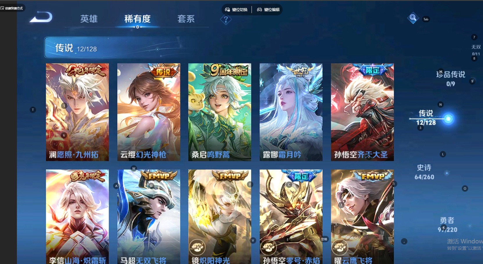 - [11966831]V6 9传说 70英雄 60皮肤 可修改实名 传说皮:星之鸣奏,幻光神枪 限定皮:愿照·九州拓(澜年限),愿照·福禄聚(蔡文姬年限),愿照·岁时盈(虞姬年限),愿照·山河定(司空震年限),愿照·众生和(妲己年限),愿照·千秋盛(女娲年限),鸣野蒿,游园惊梦,李小龙 史诗皮:器灵·浮梦炉,诗语江南,缤纷独角兽,乘风破浪,暗夜贵公子,魅力维加斯