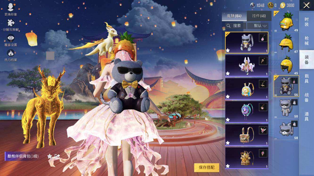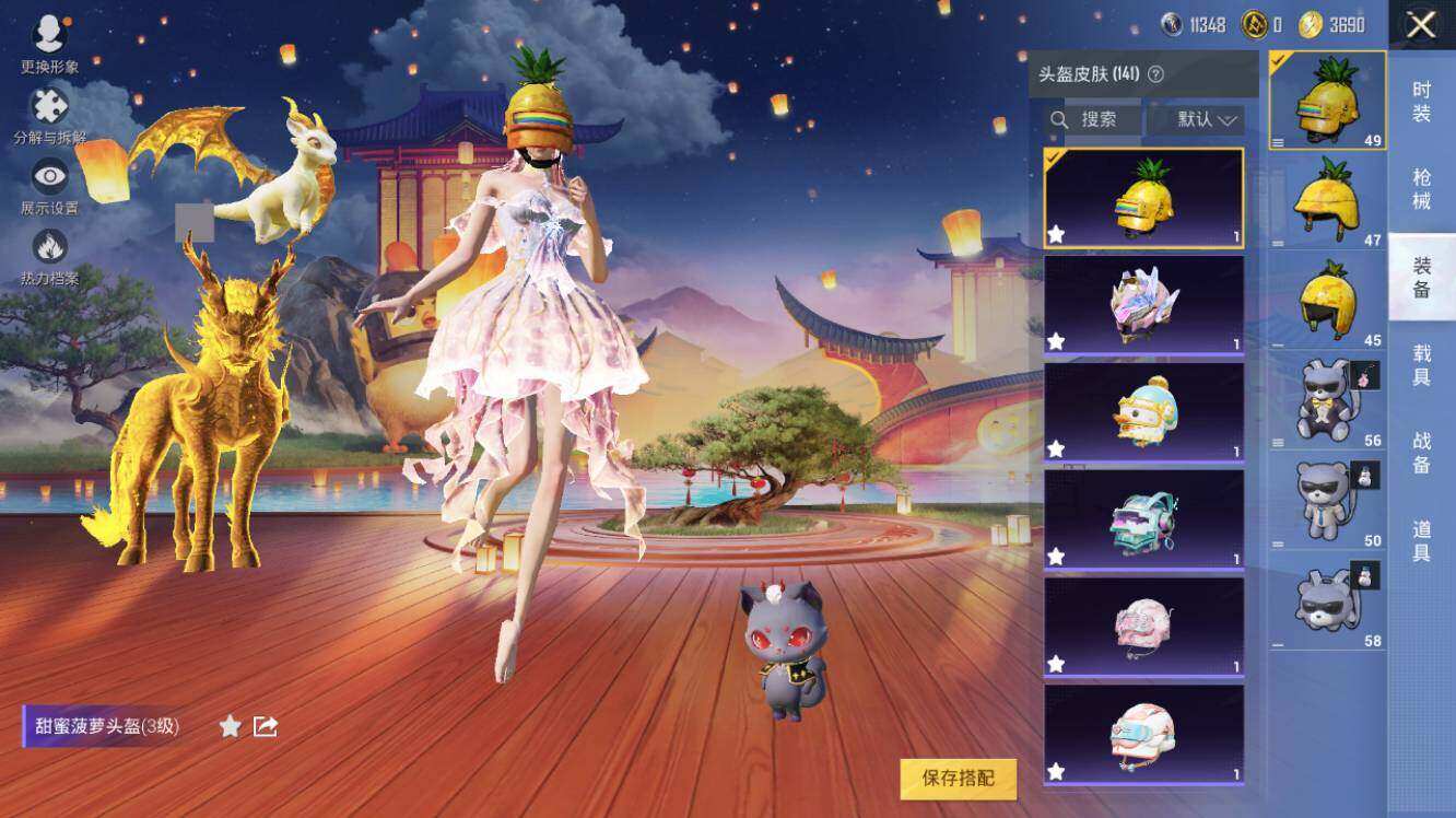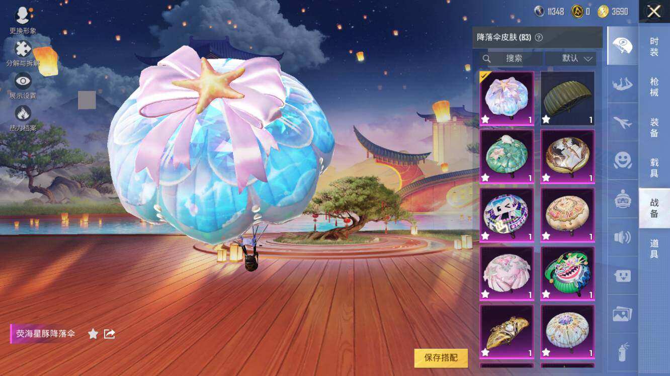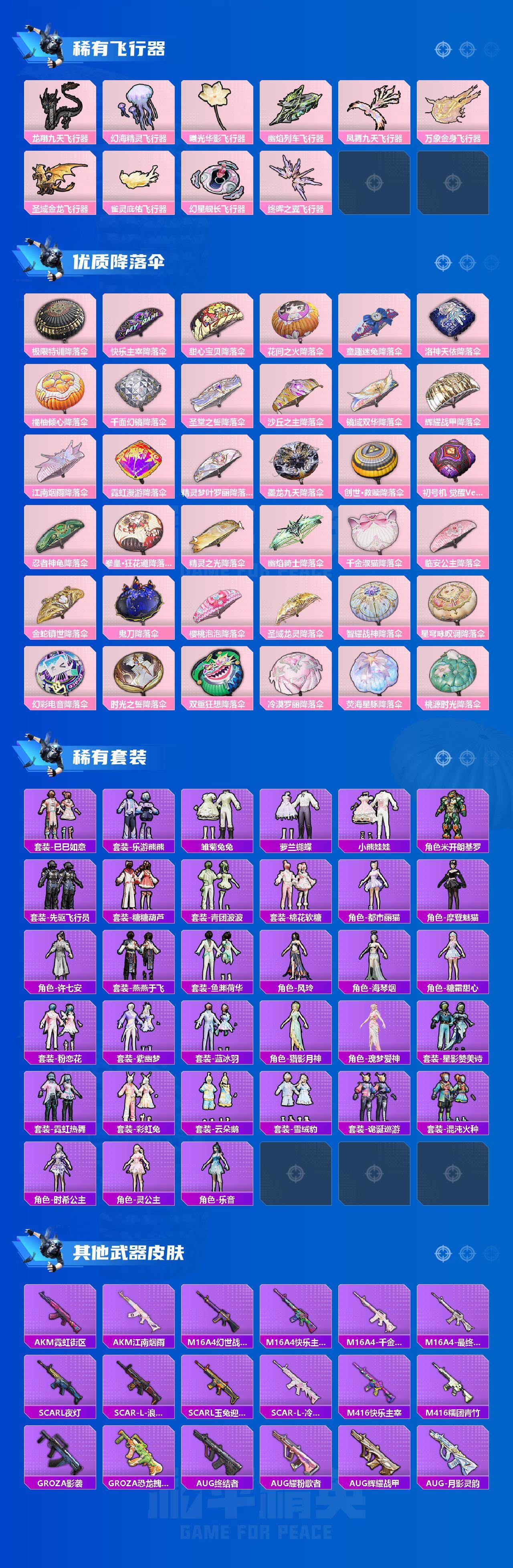 AKM-幽焰骑士,SCAR-L-金蛇镇世,M416-心之恋语,M416-电玩时刻,GROZA-精灵之光,AUG-暖羊咩咩,Famas-觉醒初号机,UMP45-量子极限,Kar98K-巳巳如意,Kar98K-圣域龙灵,M200-梦海之灵,DP-28-圣堂之誓,DP-28-千金淑猫,PKM-江南烟雨,破片手榴弹-秋玉花灯