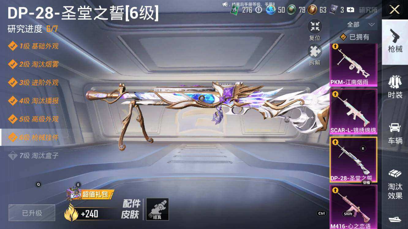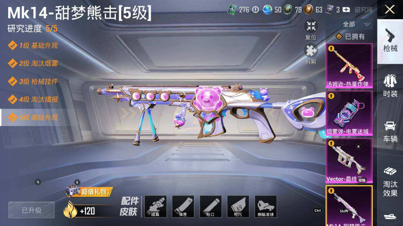 【粉色枪皮等级】:AKM-幽焰骑士(三级),SCAR-L-锦绣绵绵(五级),SCAR-L-金蛇镇世(三级),M416-心之恋语(四级),M416-电玩时刻(五级),GROZA-精灵之光(三级),AUG-暖羊咩咩(五级),Famas-初号机 觉醒Ver.(五级),UMP45-量子极限(五级),Vector-最终圣卫者(三级),汤姆逊-热量炸弹(四级),Kar98K-巳巳如意(五级),Kar98K-圣域龙灵(三级),Mk14-甜梦熊击(五级),M200-梦海之灵(三级),DP-28-圣堂之誓(六级),DP-28-千金淑猫(二级),PKM-江南烟雨(四级),烟雾弹-电雾迷城(四级)