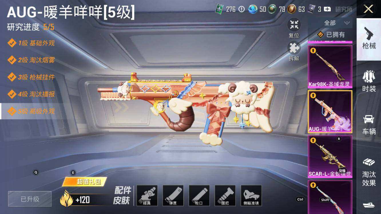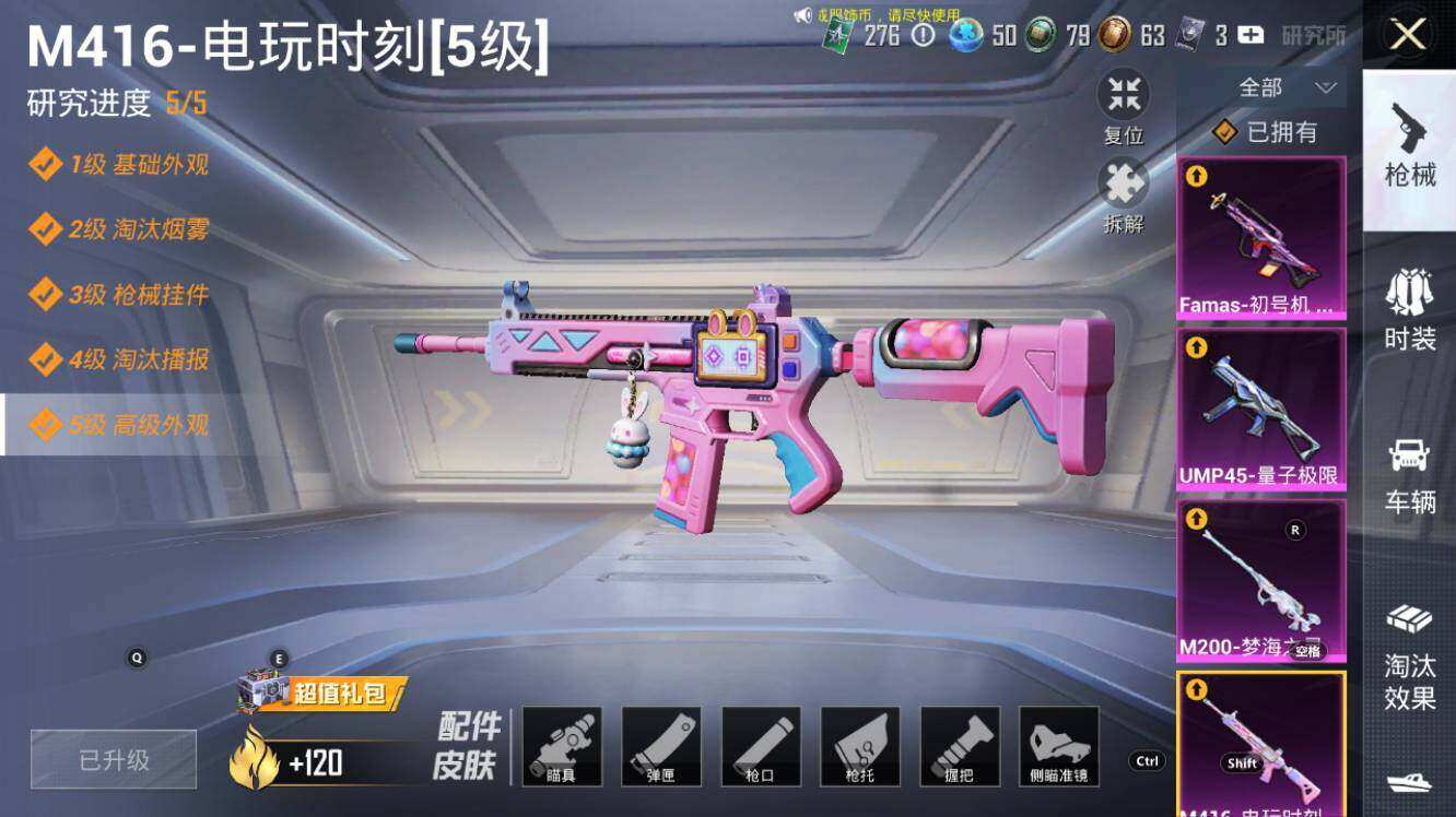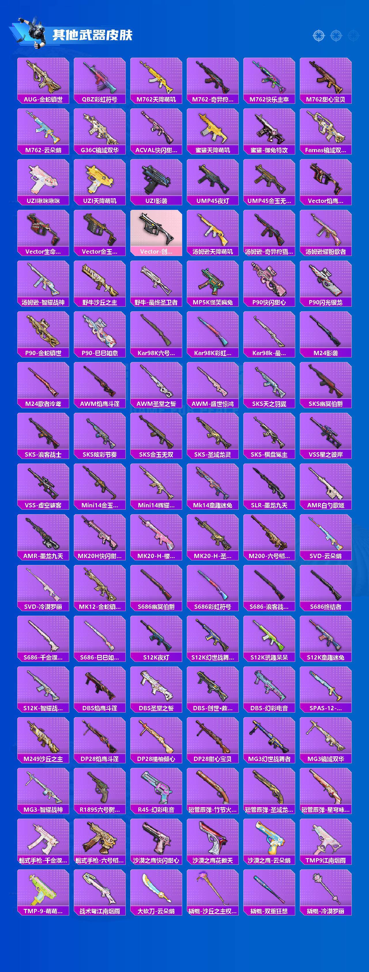 【粉色枪皮】:AKM-幽焰骑士,SCAR-L-锦绣绵绵,SCAR-L-金蛇镇世,M416-心之恋语,M416-电玩时刻,GROZA-精灵之光,AUG-暖羊咩咩,Famas-初号机 觉醒Ver.,UMP45-量子极限,Vector-最终圣卫者,汤姆逊-热量炸弹,Kar98K-巳巳如意,Kar