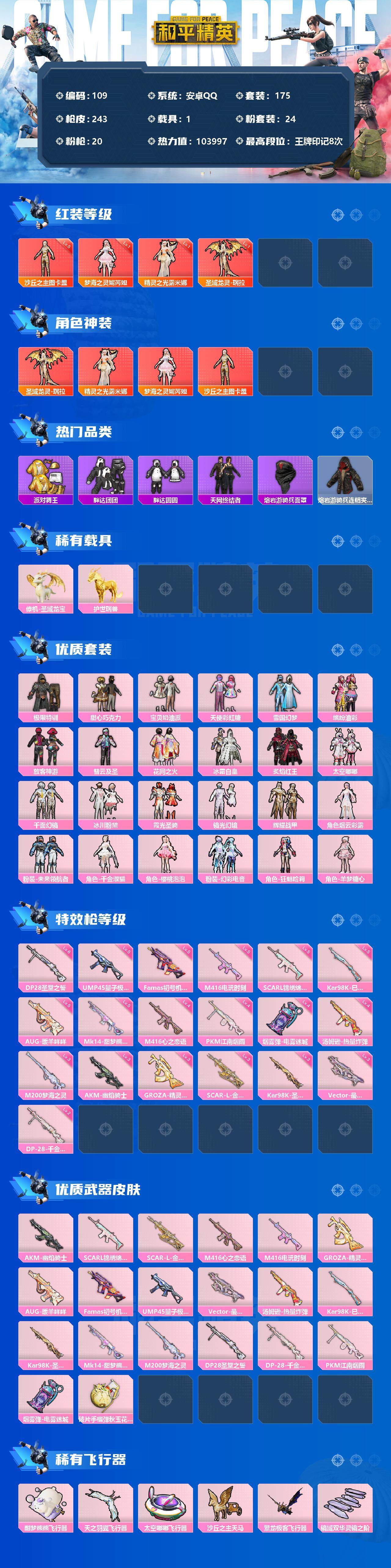 - PX_2064253- 安卓手Q-9王牌印记-有战神框-12粉装-8特效枪-2载具-57218热力值-113套装-141枪皮-3卓越印记-1传奇印记 【12粉装】,梦幻火箭,缤纷油彩,放客神游,繁龙极客,怪诞乔克,幻彩电音,玩偶服-猪猪侠,严莉莉,圣堂之誓,幻影战神,美琪,电磁星 【8特效枪】AKM-梦之光华-5级 SCAR-L-锦绣绵绵-5级 M416-心之恋语-5级 Kar98K-巳巳如意-5