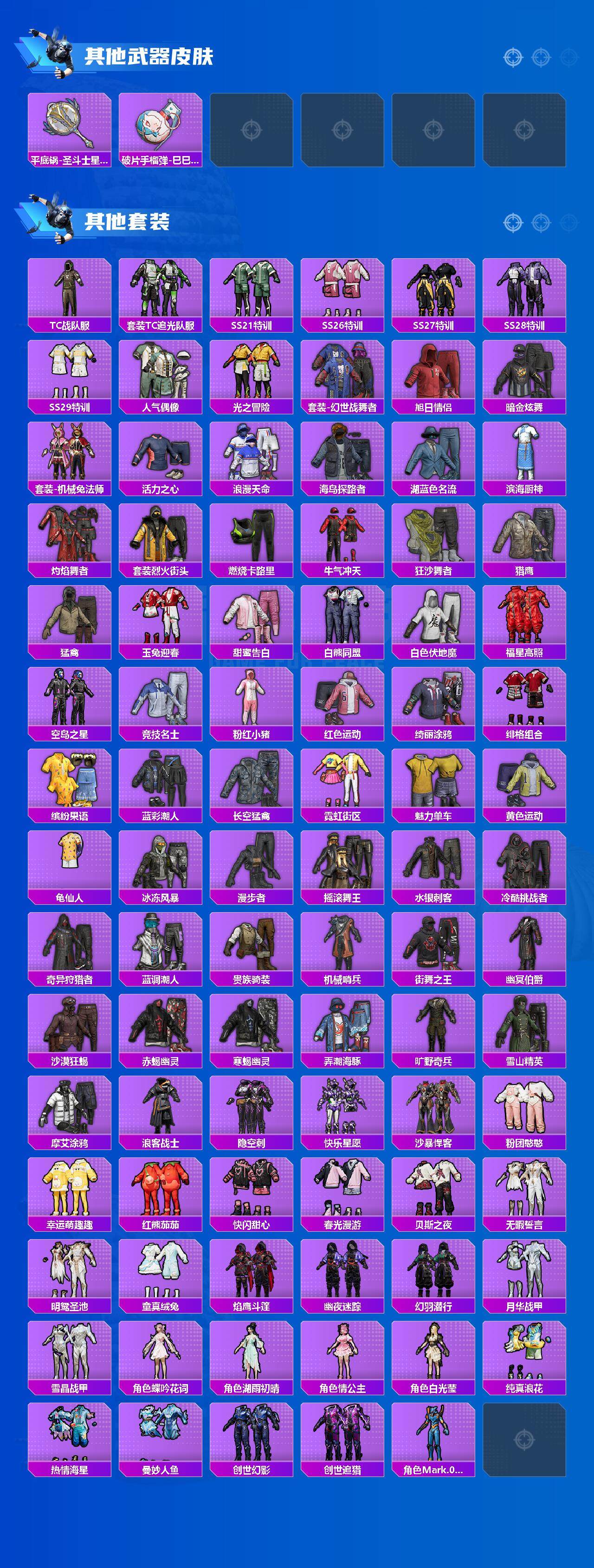 【粉色套装】:粉装-极限特训,粉装-甜心巧克力,粉装-宝贝奶油派,粉装-天使彩虹糖,粉装-雪国幻梦,粉装-缤纷油彩,粉装-放客神游,粉装-彗云及圣,粉装-花间之火,粉装-冰霜白皇,粉装-炙焰红王,粉装-太空嘟嘟,粉装-千面幻镜,粉装-冰川粉黛,粉装-霞光圣骑,粉装-镜光幻境,粉装-辉耀战甲,角色-烟云彩露,粉装-未来领航者,角色-千金淑猫,角色-樱桃泡泡,粉装-幻彩电音,角色-狂魅哈莉,角色-羊梦糖心