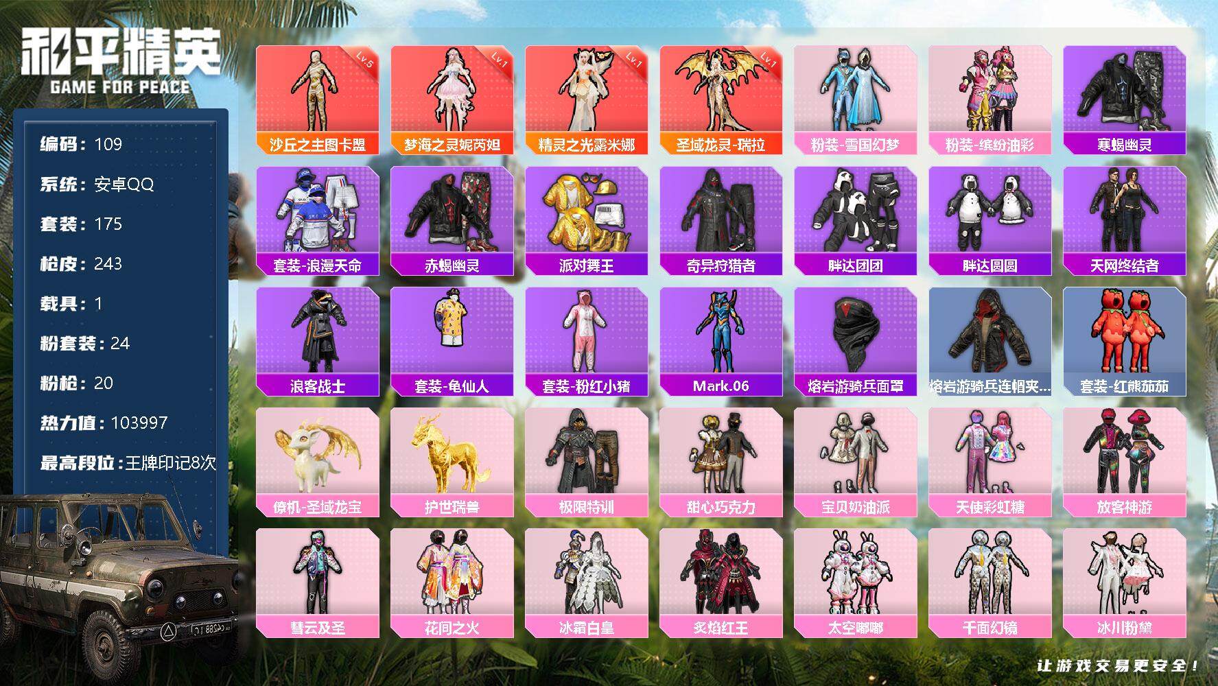 [12197941]【商品标题】:4神装!5级沙丘之主-图卡盟!安卓 手Q-4神装-24粉装-20特效枪-1载具1僚机-18粉色飞行器-103997热力值-8王牌印记-175套装-243枪皮