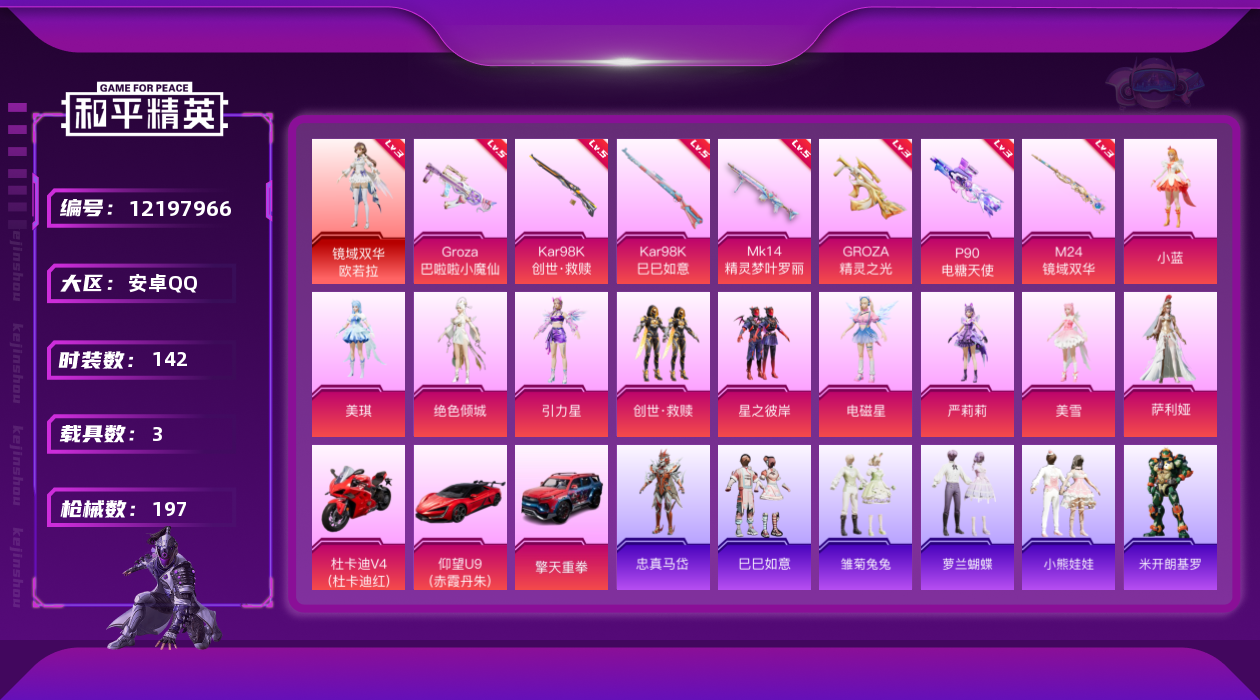 - PX_2088325- 包人脸 苹果手Q-8王牌印记-10粉装-6特效枪-2载具-53816热力值-99套装-169枪皮-1卓越印记-0传奇印记, 【10粉装】,梦幻火箭,玩偶服-猪猪侠,碧影闪光,星云暗核,宙之时溯,圣堂之誓,樱桃泡泡,金风银杏,暗夜鎏金,吟月归客, 【6特效枪】,AKM-绿萝繁花-5级,M416-全功率超战-7级,GROZA-镜光银凌-5级,AUG-暖羊咩咩-3级,Kar98K