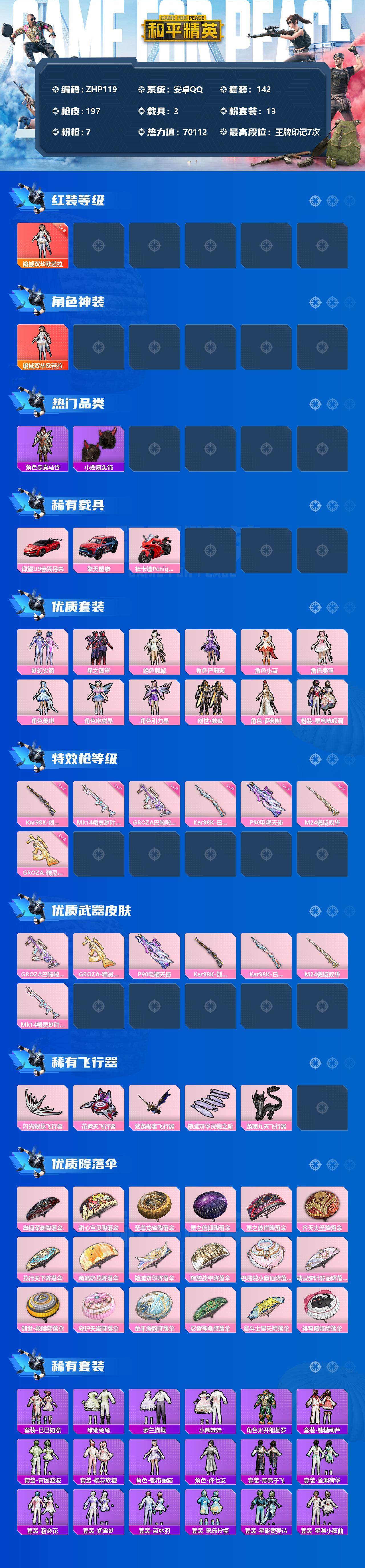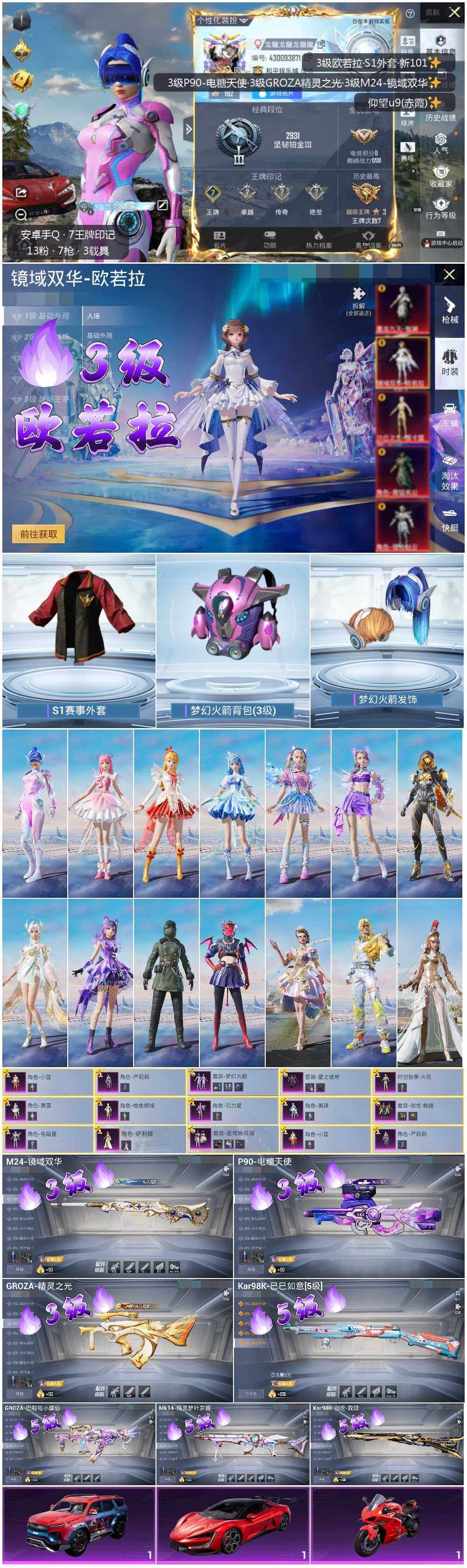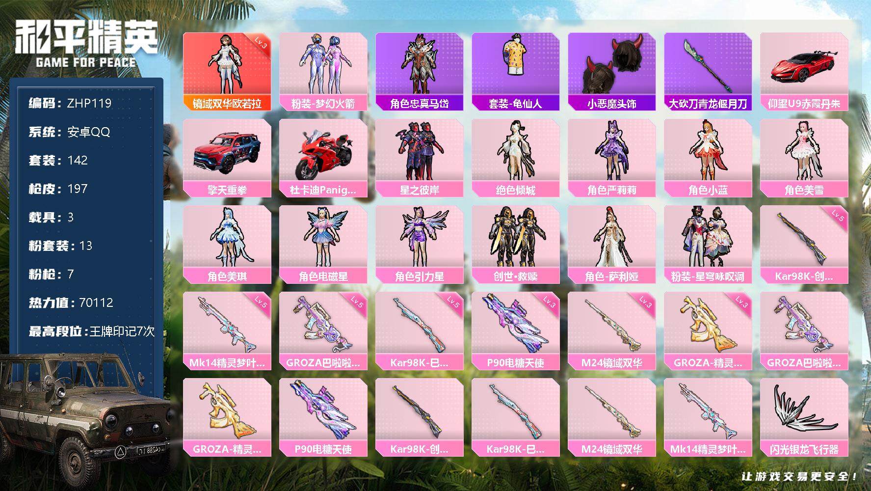 [12197966]【商品标题】:特价急出!3级欧若拉新101!安卓 手Q-1神装-13粉装-7特效枪-3载具-5粉色飞行器-70112热力值-7王牌印记-142套装-197枪皮 【红色神装等级】:镜域双华-欧若拉(三级) 【红色角色神装】:镜域双华-欧若拉 【热门品类】:粉装-梦幻火箭,角色-忠真马岱,套装-龟仙人,小恶魔头饰,大砍刀-青龙偃月刀 【粉色载具】:仰望U9(赤霞丹朱),擎天重拳,杜卡迪 Panigale V4(杜卡迪红) 【粉色套装】:粉装-梦幻火箭,粉装-星之彼岸,角色-绝色倾城,角色-严莉莉,角色-小蓝,角色-美雪,角色-美琪,角色-电磁星,角色-引力星,套装-创世·救赎,角色-萨利娅,粉装-星穹咏叹调 【粉色枪皮等级】:GROZA-巴啦啦小魔仙(五级),GROZA-精灵之光(三级),P90-电糖天使(三级),Kar98K-创世·救赎(五级),Kar98K-巳巳如意(五级),M24-镜域双华(三级),Mk14-精灵梦叶罗丽(五级) 【粉色枪皮】:GROZA-巴啦啦小魔仙,GROZA-精灵之光,P90-电糖天使,Kar98K-创世·救赎,Kar98K-巳巳如意,M24-镜域双华,Mk14-精灵梦叶罗丽 【粉色飞行器】:闪光银龙飞行器,花傲天飞行器,繁龙极客飞行器,镜域双华-灵镜之阶,龙翔九天飞行器 【粉色降落伞】:凝视深渊降落伞,甜心宝贝降落伞,至尊龙雀降落伞,星之信仰降落伞,星之彼岸降落伞,齐天大圣降落伞,龙行天下降落伞,萌酷奶龙降落伞,镜域双华降落伞,辉耀战甲降落伞,巴啦啦小魔仙降落伞,精灵梦叶罗丽降落伞,创世·救赎降落伞,守护天翼降落伞,金丰海韵降落伞,忍者神龟降落伞,圣斗士星矢降落伞,绯穹魔姬降落伞 【稀有套装】:套装-龟仙人,套装-巳巳如意,套装-雏菊兔兔,套装-萝兰蝴蝶,套装-小熊娃娃,角色-米开朗基罗,套装-糖糖葫芦,套装-青团波波,套装-棉花软糖,角色-都市丽猫,角色-许七安,套装-燕燕于飞,套装-鱼渊荷华,套装-粉恋花,套装-紫幽梦,套装-蓝冰羽,套装-果冻柠檬,套装-星影赞美诗,套装-星渊小夜曲,套装-云朵鹅,套装-雪绒豹 【稀有枪皮】:AKM-霓虹街区,AKM-龙的传人,M16A4-凝视深渊,M16A4-莲影清波,SCAR-L-炫彩节奏,SCAR-L-玉兔迎春,M416-糯团青竹,M416-蓝色火焰,GROZA-影袭,GROZA-银河战甲,AU
