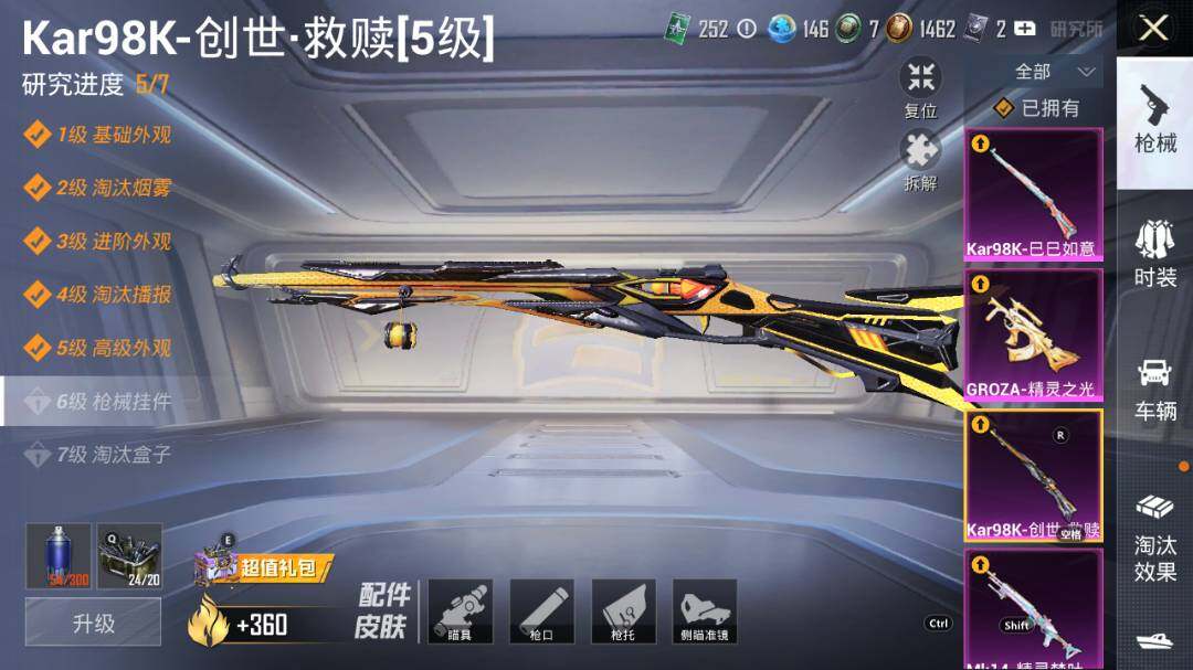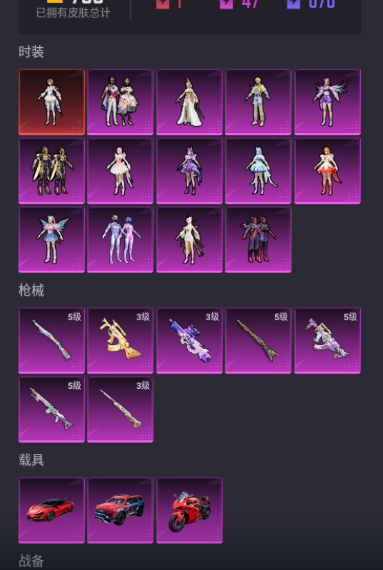 【粉色枪皮等级】:GROZA-巴啦啦小魔仙(五级),GROZA-精灵之光(三级),P90-电糖天使(三级),Kar98K-创世·救赎(五级),Kar98K-巳巳如意(五级),M24-镜域双华(三级),Mk14-精灵梦叶罗丽(五级)