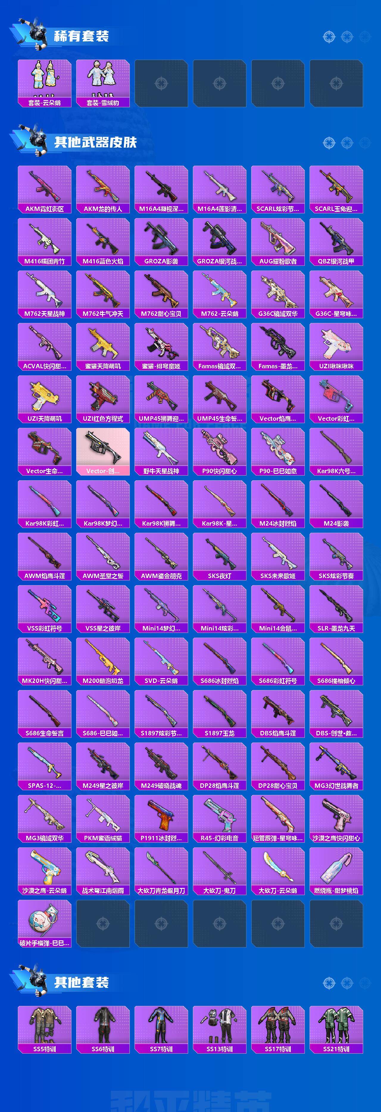 【稀有枪皮】:AKM-霓虹街区,AKM-龙的传人,M16A4-凝视深渊,M16A4-莲影清波,SCAR-L-炫彩节奏,SCAR-L-玉兔迎春,M416-糯团青竹,M416-蓝色火焰,GROZA-影袭,GROZA-银河战甲,AU