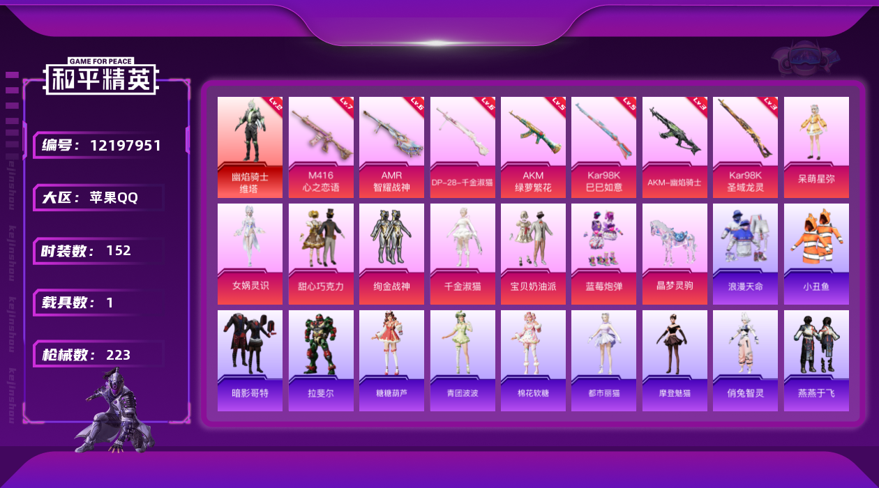 [12197951]【商品标题】:幽焰骑士-维塔(二级)!苹果 手Q-1神装-10粉装-8特效枪-1载具1僚机-2粉色飞行器-74732热力值-15王牌印记-152套装-223枪皮