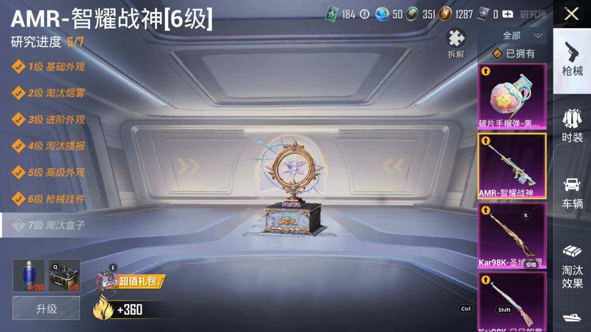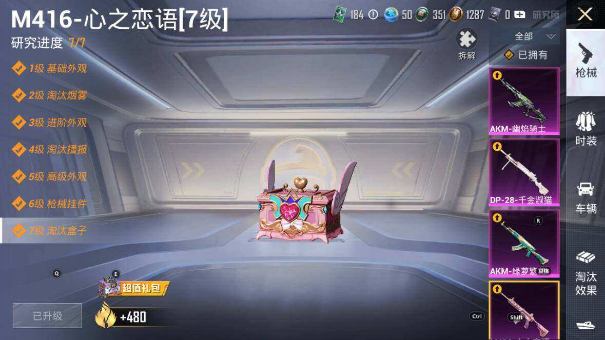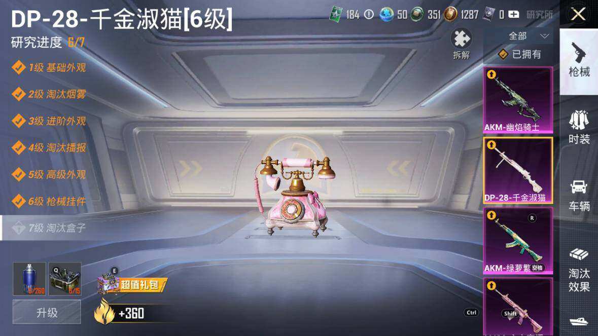 【粉色枪皮等级】:AKM-绿萝繁花(五级),AKM-幽焰骑士(三级),M416-心之恋语(七级),Kar98K-巳巳如意(五级),Kar98K-圣域龙灵(三级),AMR-智耀战神(六级),DP-28-千金淑猫(六级),破片手榴弹-美味星星糖(三级)