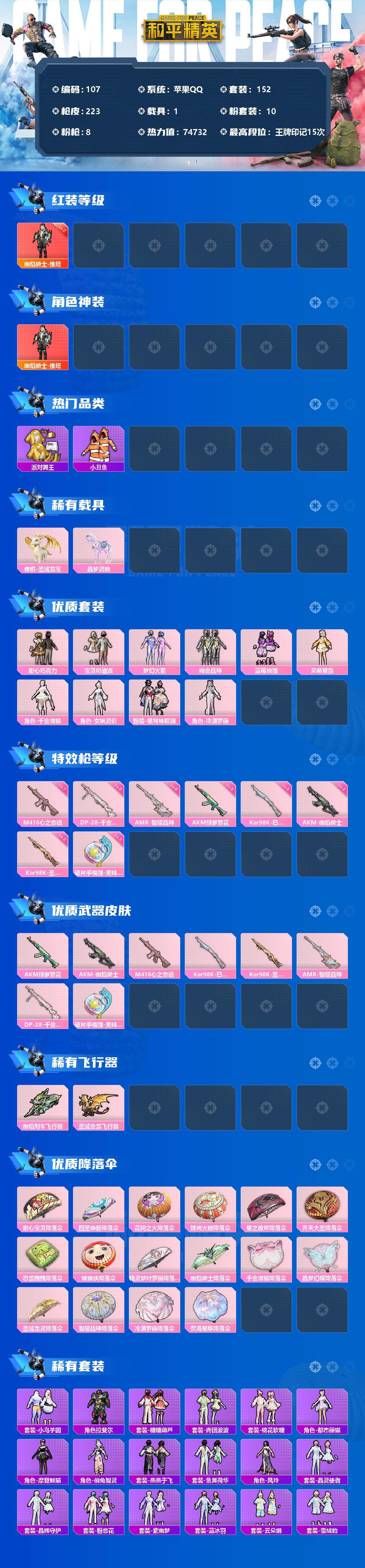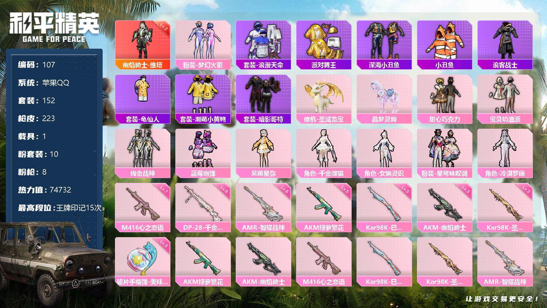 [12197951]【商品标题】:幽焰骑士-维塔(二级)!苹果 手Q-1神装-10粉装-8特效枪-1载具1僚机-2粉色飞行器-74732热力值-15王牌印记-152套装-223枪皮 【红色神装等级】:幽焰骑士-维塔(二级) 【红色角色神装】:幽焰骑士-维塔 【热门品类】:粉装-梦幻火箭,套装-浪漫天命,套装-派对舞王,套装-深海小丑鱼,套装-小丑鱼,套装-浪客战士,套装-龟仙人,套装-潮萌小黄鸭,套装-暗影哥特 【粉色载具】:僚机-圣域龙宝,晶梦灵驹 【粉色套装】:粉装-甜心巧克力,粉装-宝贝奶油派,粉装-梦幻火箭,粉装-绚金战神,粉装-蓝莓炮弹,角色-呆萌星弥,角色-千金淑猫,角色-女娲灵识,粉装-星穹咏叹调,角色-冷漠罗丽 【粉色枪皮等级】:AKM-绿萝繁花(五级),AKM-幽焰骑士(三级),M416-心之恋语(七级),Kar98K-巳巳如意(五级),Kar98K-圣域龙灵(三级),AMR-智耀战神(六级),DP-28-千金淑猫(六级),破片手榴弹-美味星星糖(三级) 【粉色枪皮】:AKM-绿萝繁花,AKM-幽焰骑士,M416-心之恋语,Kar98K-巳巳如意,Kar98K-圣域龙灵,AMR-智耀战神,DP-28-千金淑猫,破片手榴弹-美味星星糖 【粉色飞行器】:幽焰列车飞行器,圣域金龙飞行器 【粉色降落伞】:甜心宝贝降落伞,四圣焕新降落伞,花间之火降落伞,锦绣火鲤降落伞,星之彼岸降落伞,齐天大圣降落伞,恐龙拽拽降落伞,猪猪侠降落伞,精灵梦叶罗丽降落伞,幽焰骑士降落伞,千金淑猫降落伞,晶梦幻蝶降落伞,圣域龙灵降落伞,智耀战神降落伞,冷漠罗丽降落伞,荧海星豚降落伞 【稀有套装】:套装-龟仙人,套装-小鸟芋圆,角色-拉斐尔,套装-糖糖葫芦,套装-青团波波,套装-棉花软糖,角色-都市丽猫,角色-摩登魅猫,角色-俏兔智灵,套装-燕燕于飞,套装-鱼渊荷华,角色-风玲,套装-晶灵使者,套装-晶辉守护,套装-粉恋花,套装-紫幽梦,套装-蓝冰羽,套装-云朵鹅,套装-雪绒豹,角色-时希公主,套装-蜜露汐语 【稀有枪皮】:AKM-四圣焕新,AKM-墨染幽兰,AKM-夜灯,AKM-彩虹符号,AKM-破晓战魂,AKM-缤纷海域,AKM-虎虎生威,AKM-龙的传人,M16A4-千金淑猫,SCAR-L-暗夜玫瑰,SCAR-L-浪客战士,SCAR-L-玉兔迎春,SCAR-L-甜蜜旋律,SCAR-L-红色方程式