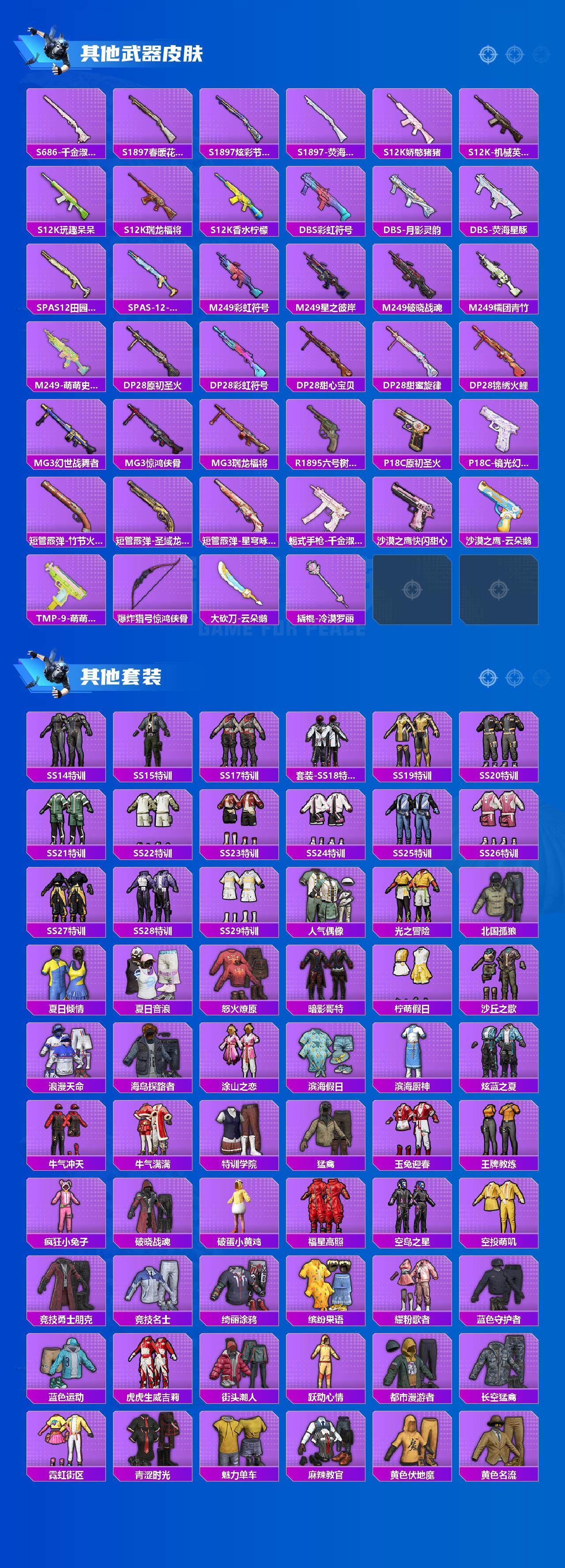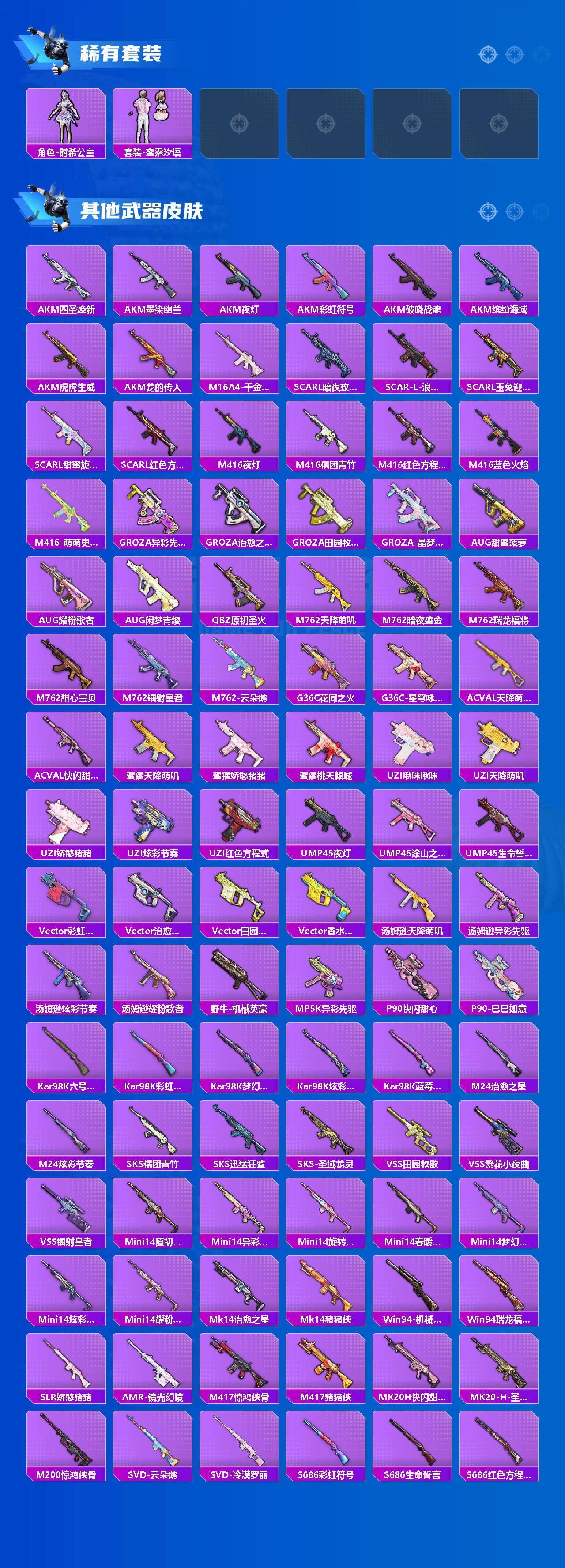 【稀有枪皮】:AKM-四圣焕新,AKM-墨染幽兰,AKM-夜灯,AKM-彩虹符号,AKM-破晓战魂,AKM-缤纷海域,AKM-虎虎生威,AKM-龙的传人,M16A4-千金淑猫,SCAR-L-暗夜玫瑰,SCAR-L-浪客战士,SCAR-L-玉兔迎春,SCAR-L-甜蜜旋律,SCAR-L-红色方程式