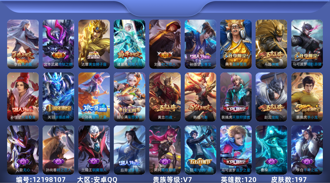 [12198107]V7 5传说 120英雄 197皮肤 可修改实名 优质装备:黄金狮子座,地狱之眼,时之恋人-刘备(电焊工) 珍宝阁皮:妄想食味 限定皮:至尊宝,凤求凰(白切鸡),时雨天司(水龙头),神威(电光马子),飞衡(韩信年限),遇见飞天,降魔,冰锋战神,梁祝,天狼狩猎者,龙胆,逐梦之翼,逐梦之星,烈魂,李小龙,如梦令-后羿,大圣娶亲,蜜橘之夏 史诗皮:苍穹之光,黄金分割率,千年之狐,冰冠公主,白蛇,暗夜猫娘,时之恋人-孙尚香,乱世虎臣,节奏热浪,摇滚巨星,水果甜心,心灵骇客,德古拉伯爵,暗隐猎兽者,幽灵船长,心灵战警,繁星吟游(呼啦呼啦),缤纷独角兽,曙光守护者,金属风暴,原初追逐者,圣诞狂欢,鹰眼统帅,王者之锤,魅力维加斯,无心,未来纪元-赵云