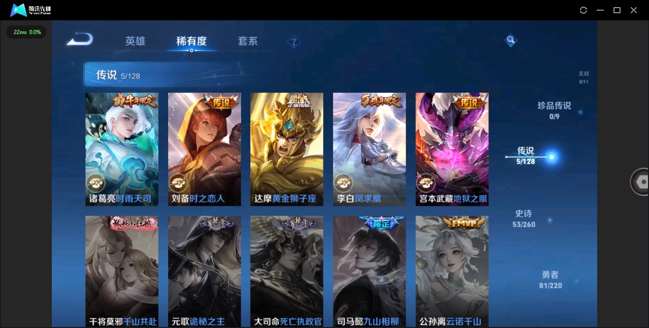 - [12057262]V7 1典藏 1珍品传说 9传说 124英雄 243皮肤 可修改实名 优质装备:弑枪猎影(韩信典藏),黄金狮子座,末日机甲-孙尚香(绿蚂蚱),超时空战士-狄仁杰,浮生妄,澜逐花归海 珍品传说:时之奇旅-孙策 传说皮:祥瑞亨通 珍宝阁皮:妄想食味 限定皮:愿照·九州拓(澜年限),逐霄战戟,鸣野蒿,遇见飞天,梁祝,逐梦之影,大圣娶亲,引擎之心,美猴王,寅虎·赤拳(老虎年限),山海·玄木吟(马可年限) 史诗皮:鸭鸭历险记-刘禅,器灵·浮梦炉,绮世丹青,化蝶舞,星界战将,龙之律动,雪豹·霜爪,石田雨龙,茶境仙,破空之剑,蒙犽顽岩魄,百相守梦-百里守约,百相守梦-黄忠,白龙吟,黄金分割率,千年之狐,晚萤,末日机甲-吕布,猫狗日记-孙策,猫狗日记-大乔,乱世虎臣,节奏热浪,修罗,水果甜心,绅士熊喵,天才门将,星夜王子,幽灵船长,鬼剑武藏,天秀·启明,地狱岩魂,纤云弄巧,缤纷独角兽,乘风破浪,水晶猎龙者,曙光守护者,原初追逐者,圣诞狂欢,鹰眼统帅,魅力维加斯,未来纪元-赵云