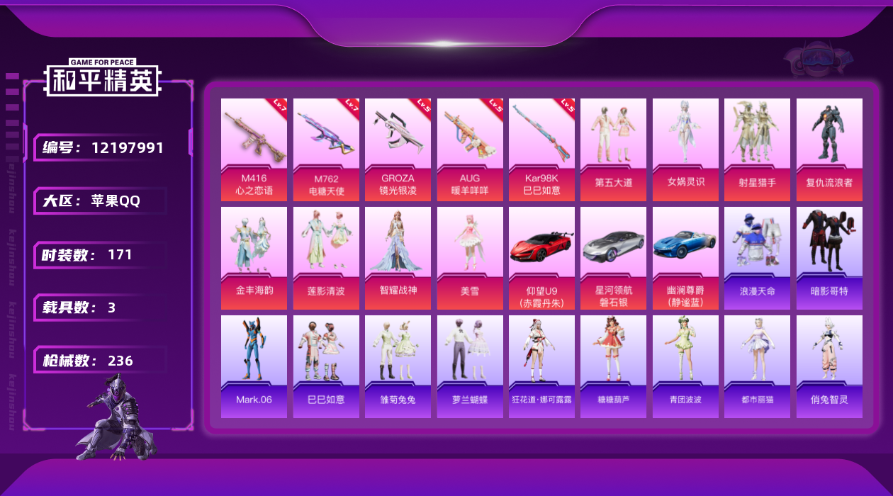 [12197991]【商品标题】:苹果 手Q-9粉装-5特效枪-3载具-3粉色飞行器-78107热力值-13王牌印记-171套装-236枪皮