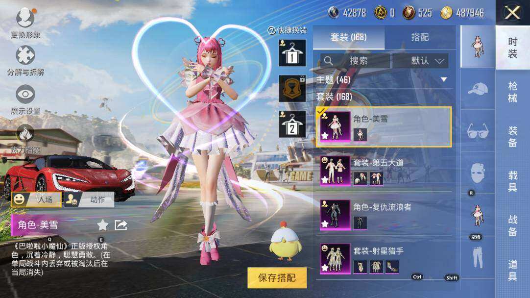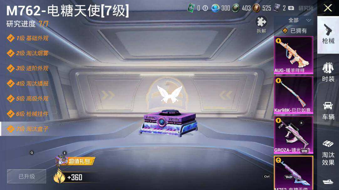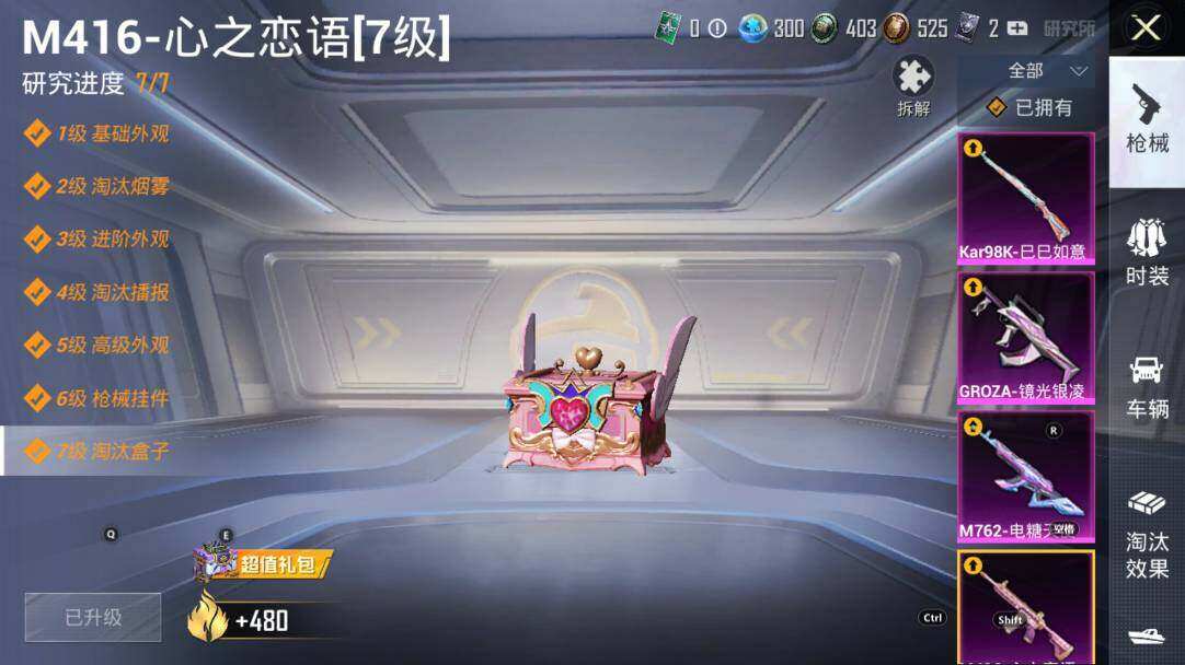 【粉色枪皮等级】:M416-心之恋语(七级),GROZA-镜光银凌(五级),AUG-暖羊咩咩(五级),M762-电糖天使(七级),Kar98K-巳巳如意(五级)
