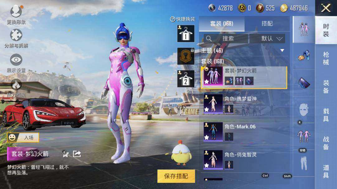 【粉色套装】:粉装-梦幻火箭,角色-复仇流浪者,粉装-第五大道,粉装-射星猎手,粉装-莲影清波,角色-美雪,粉装-金丰海韵,角色-女娲灵识,角色-智耀战神