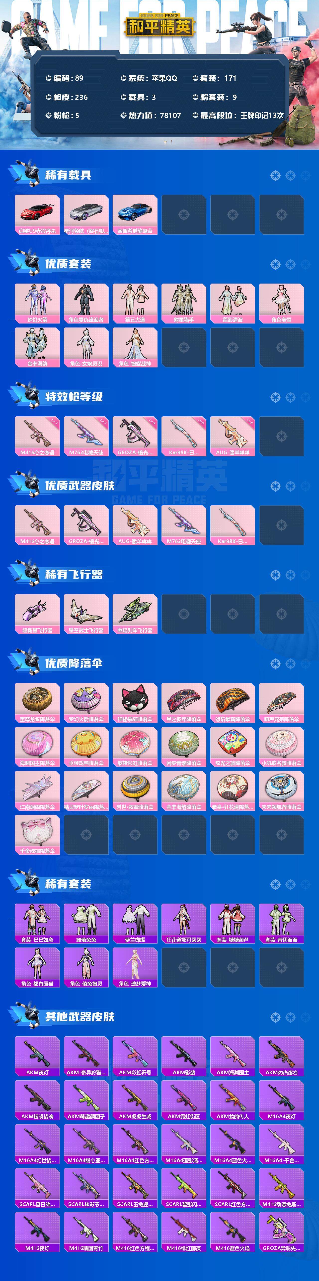 - PX_2090993- 苹果手Q-8王牌印记-5粉装-3特效枪-0载具-53610热力值-129套装-168枪皮-3卓越印记-2传奇印记 【5粉装】,梦幻火箭,宝贝奶油派,智能音符,圣堂之誓,垂柳戏鸭 【3特效枪】SCAR-L-锦绣绵绵-5级 M416-风花雪月-7级 M249-彩虹甜喵-7级 【4稀有紫装】,雪山精英,小丑鱼,龟仙人,金羽特工, 【129稀有时装】,SS31特训,SS33特训,