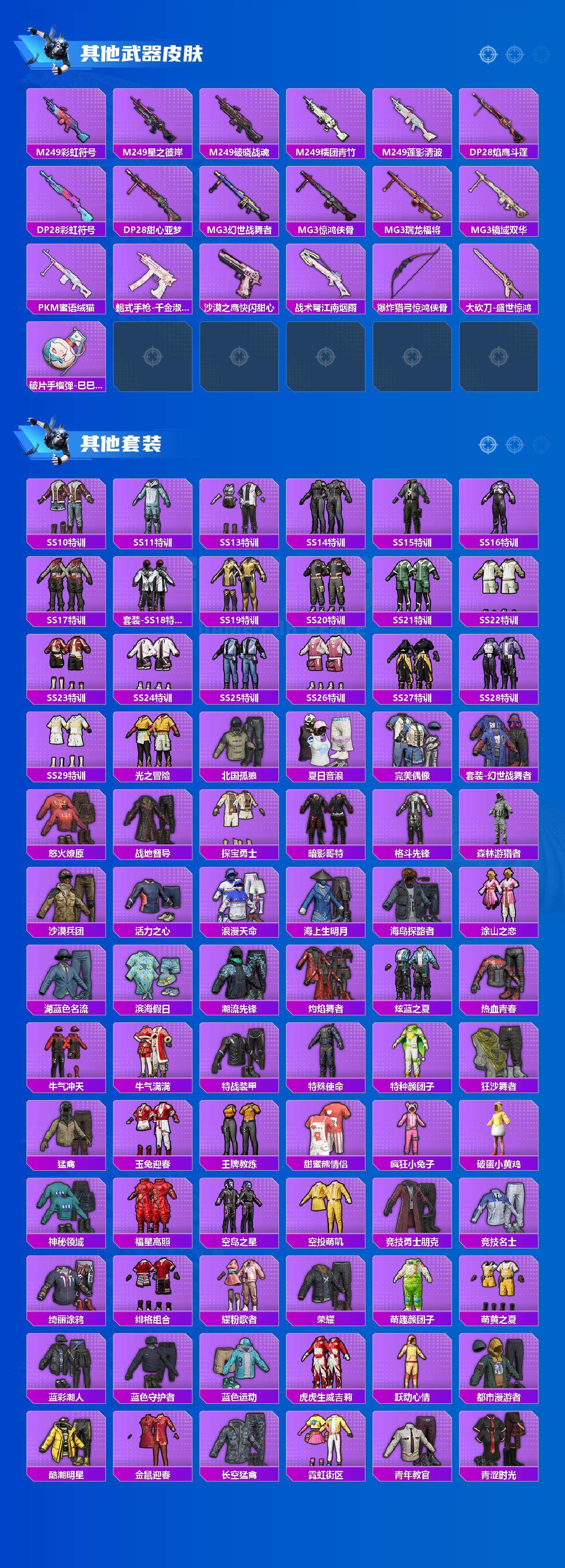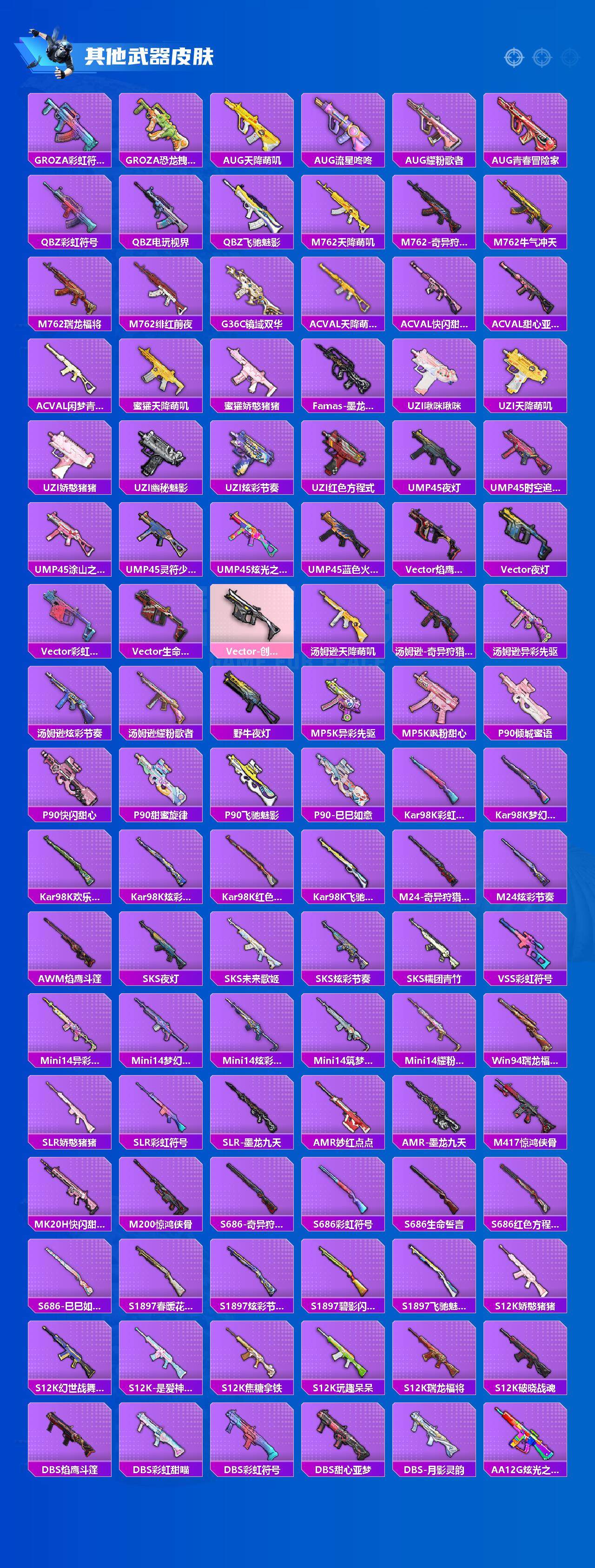 【稀有枪皮】:AKM-夜灯,AKM-奇异狩猎者,AKM-彩虹符号,AKM-影袭,AKM-海渊国主,AKM-灼热熔岩,AKM-破晓战魂,AKM-萌趣颜团子,AKM-虎虎生威,AKM-霓虹街区,AKM-龙的传人,M16A4-夜灯,M16A4-幻世战舞者,M16A4-甜心亚梦,M16A4-红色方程式,M16A4-莲影清波,M16A4-蓝色火焰,M16A4-千金淑猫,SCAR-L-夏日绵绵冰,SCAR-L-炫彩节奏,SCAR-L-玉兔迎春,SCAR-L-碧影闪光,SCAR-L-红色方程式,M416-动感兔斯基,M416-夜灯,M416-糯团青竹,M416-红色方程式,M416-绯红前夜,M416-蓝色火焰,GROZA-异彩先驱,GROZA-彩虹符号,GR