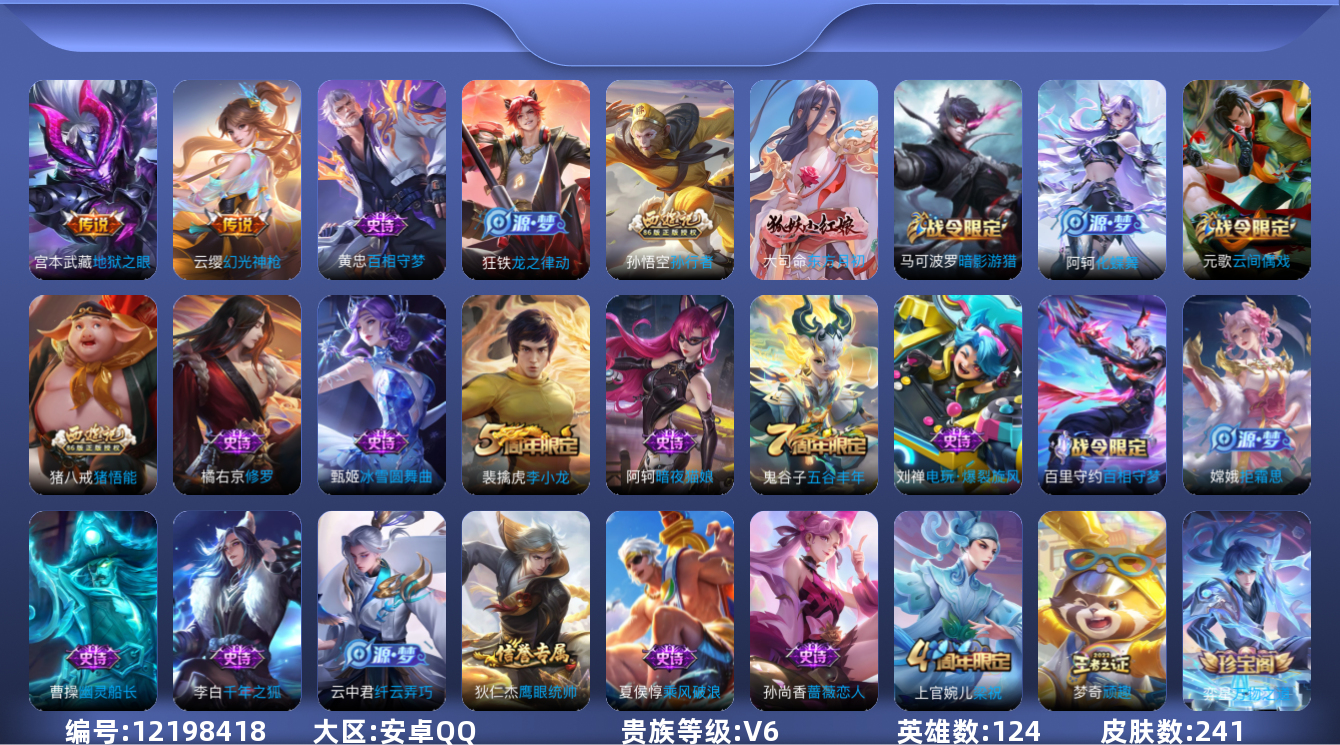 [12198418]V6 2传说 124英雄 241皮肤 可修改实名 优质装备:地狱之眼 传说皮:幻光神枪 珍宝阁皮:万物之道,蔷薇恋人,玩趣恶龙 限定皮:高山流水,五谷丰年,游园惊梦,梁祝,李小龙,孙行者,猪悟能 史诗皮:化蝶舞,星界战将,龙之律动,东方月初,百相守梦-百里守约,百相守梦-黄忠,特工魅影,千年之狐,江河有灵,百解令(蒙犽),蒙恬荣光圣徽,电玩·爆裂旋风,暗夜猫娘,猫狗日记-大乔,修罗,摇滚巨星,水果甜心,功夫厨神,德古拉伯爵,幽灵船长,鬼剑武藏,舞动绿茵,地狱岩魂,纤云弄巧,拒霜思,乘风破浪,逐浪之夏,金属风暴,原初追逐者,鹰眼统帅,魅力维加斯,黎明之约