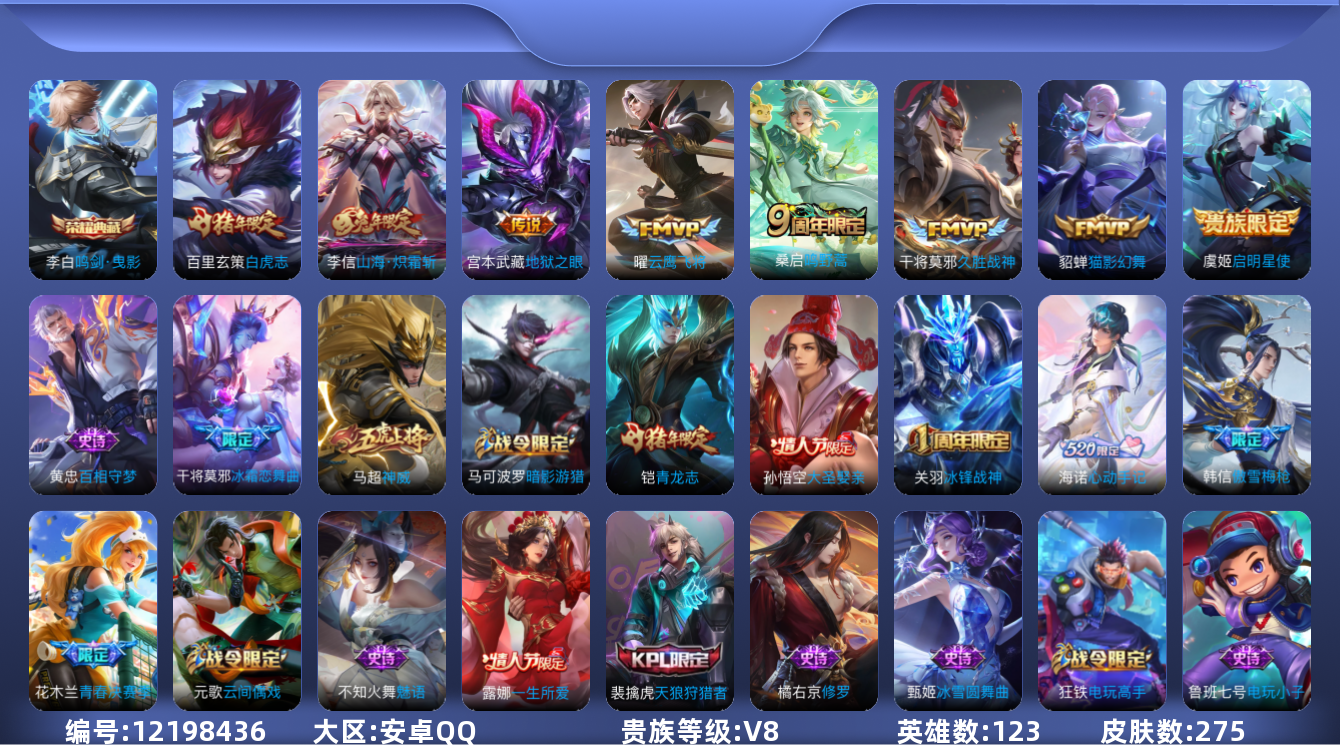 [12198436]V8 1典藏 8传说 123英雄 275皮肤 可修改实名 优质装备:鸣剑·曳影,云鹰飞将(小将军),猫影幻舞,久胜战神,地狱之眼,山海·炽霜斩(李信年限) 珍宝阁皮:万物之道,女武神,玩趣恶龙 限定皮:鸣野蒿,白虎志(电光耗子),傲雪梅枪,神威(电光马子),遇见飞天,高山流水,五谷丰年,青龙志(铠年限),冰锋战神,梁祝,天狼狩猎者,李小龙,真爱至上,一生所爱,大圣娶亲,青春决赛季,冰霜恋舞曲,匿光追影者 史诗皮:百相守梦-黄忠,怒海争锋,海诺心动手记,电玩小子(小书包),黄金分割率,特工魅影,千年之狐,江河有灵,蒙恬荣光圣徽,魅语,偶像歌手,末日机甲-吕布,猫狗日记-孙策,猫狗日记-大乔,乱世虎臣,修罗,女仆咖啡,摇滚巨星,水果甜心,绅士熊喵,天才门将,心灵骇客,功夫厨神,德古拉伯爵,暗隐猎兽者,鬼剑武藏,天秀·启明,舞动绿茵,纤云弄巧,繁星吟游(呼啦呼啦),拒霜思,缤纷独角兽,逐浪之夏,水晶猎龙者,曙光守护者,箭羽风息,金属风暴,原初追逐者,圣诞狂欢,鹰眼统帅,魅力维加斯,黎明之约,无心,未来纪元-赵云