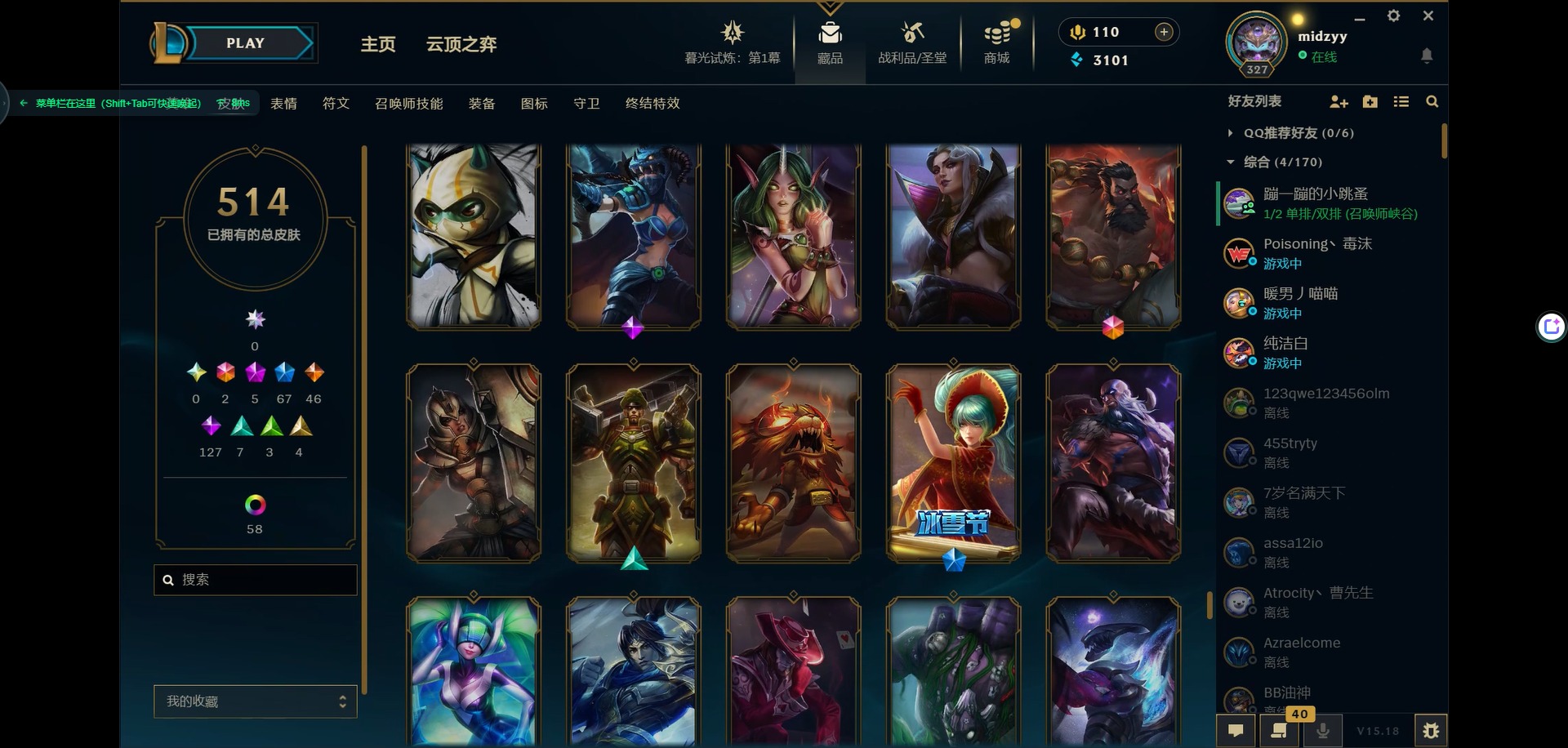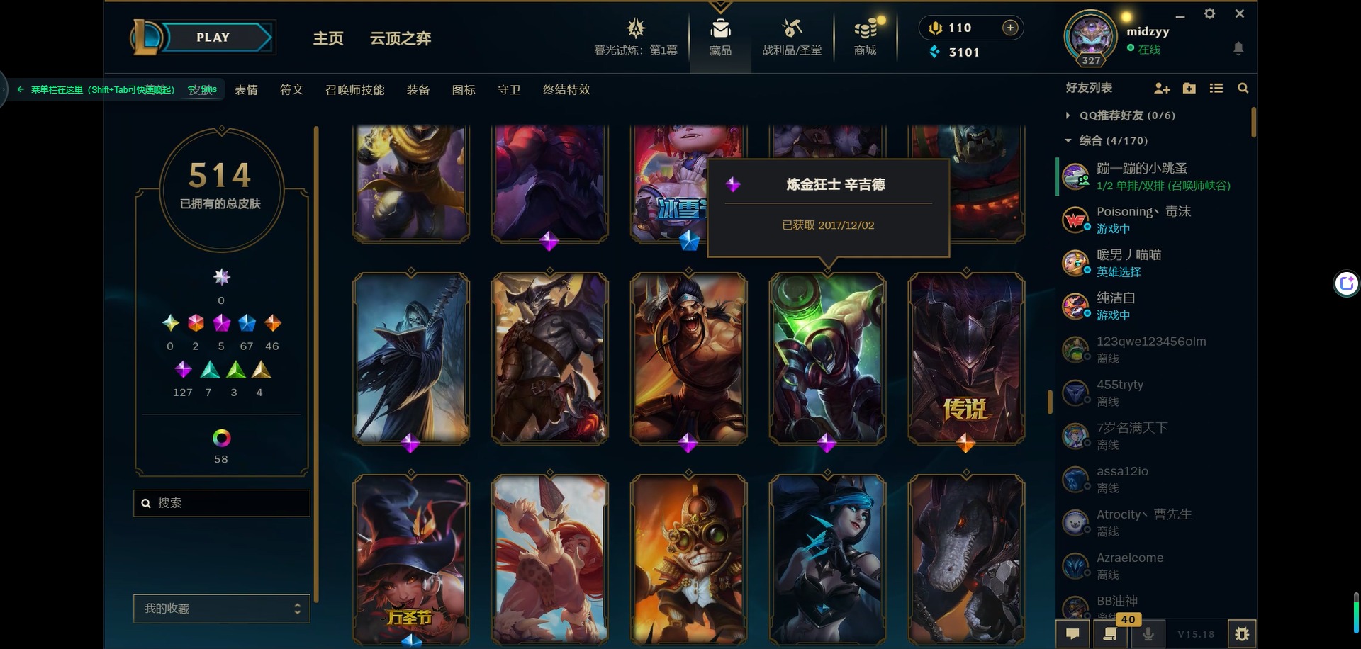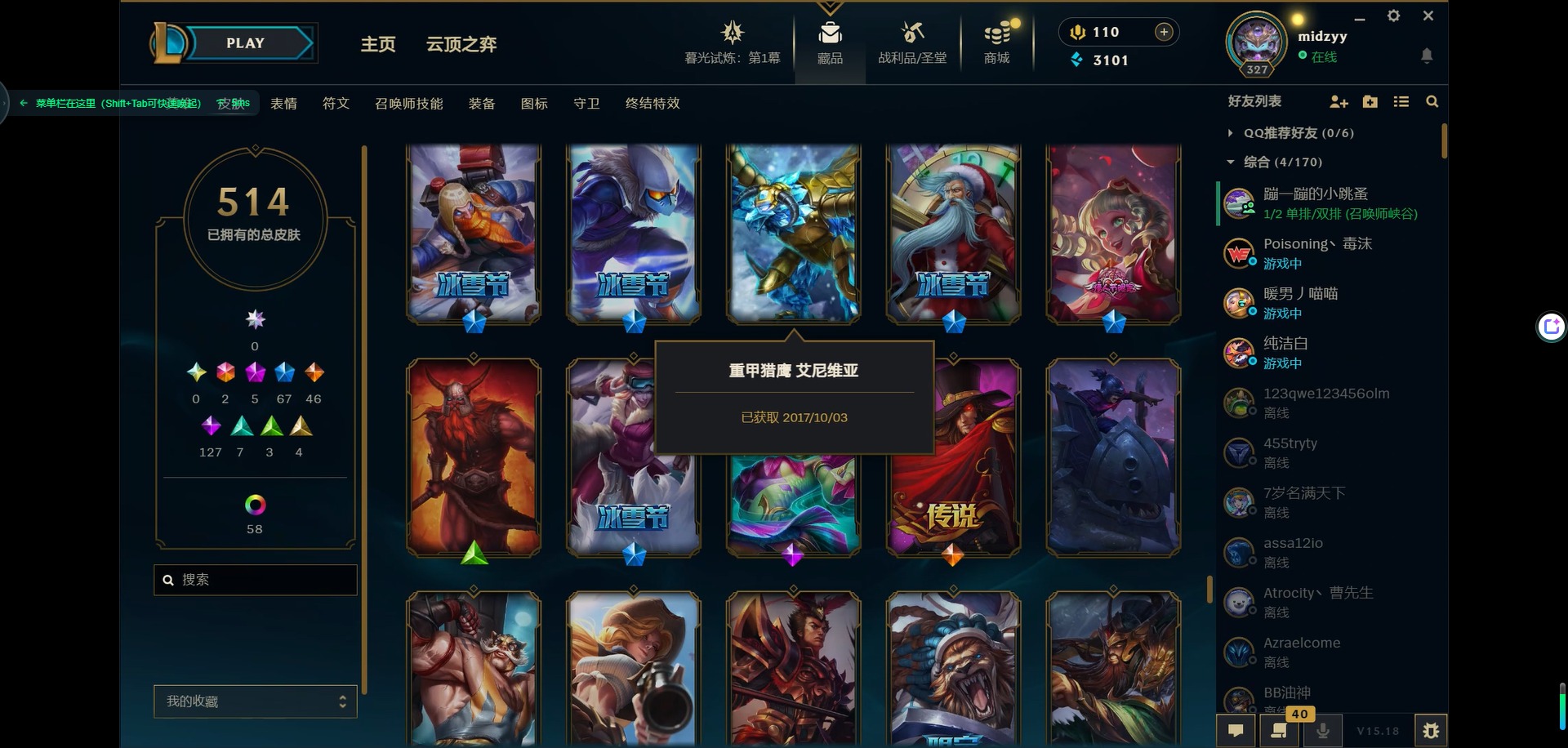 [12198411]2终极 5神话 67限定 46传说 127史诗 514皮肤 66炫彩 169英雄 可二次 可修改实名 优质装备:至臻 腥红之月 亚托克斯,银白审判 凯尔,源代码 乐芙兰,防爆天使 凯尔,暗影 沃里克,巧克力工坊 波比,都铎王朝 图奇,夺命美人 卡特,防爆士兵 炼金,钢铁之翼 凤凰,冠军之血 希瓦娜,红桃杰克 崔斯特,鸡里奥,惊悚派对 阿木木,警用试作体K-9 内瑟斯,克格汪 克格莫,密林猎手 提莫,送披萨的小姐姐 希维尔,野兽猎人 泰达米尔,勇者 奈德丽,御魔星矢 寒冰,灵魂守卫,DJ-娑娜,外星装甲 库奇,至臻 腥红之月 亚托克斯(2022),十五周年纪念 希维尔,魅影之刃 锐雯 限定:钢铁军团 拉克丝 情人节限定:甜心宝贝 安妮 赛季限定皮:胜利剑圣 易,胜利女神 奥利安娜,胜利机器人 布里茨 冠军限定系列:S13 T1 李青,S1FNC 酒桶,S1FNC 迦娜,S1FNC 嘉文四世,S2 暗杀星 蒙多,S2 暗杀星 努努,S2 暗杀星 慎,S3 SKT T1 劫,S3 SKT T1 薇恩,S3 SKT T1 李青,S3 SKT T1 婕拉,S4 SSW 雷恩加尔,S4 SSW 图奇,S5 SKT T1 滑板鞋,S5 SKT T1 蜘蛛 冰雪节限定:“主人不要我了” 阿木木,冰雪风暴 希维尔,冰雪节 马尔扎哈,冰雪节 炼金,冬季仙境 卡尔玛,胡桃夹子 小丑,平安夜女神 娑娜,魄罗骑士 瑟庄妮,圣诞开心鬼 提莫,圣诞精灵 崔丝塔娜,圣诞狂欢 时光,圣诞狂欢 努努,圣诞老人 酒桶,圣诞糖果棒 厄运小姐,圣诞玩偶 波比,圣诞驯鹿 克格莫,邪恶圣诞老人 维迦,幸福女神 乐芙兰,雪默丁格 万圣节限定:鬼影森森 茂凯,鬼影重重 魔腾,古拉伯爵 克烈,魅惑女巫 奈德丽,南瓜头 费德提克,无头骑士 人马 年限:蛇年 库奇,鸡年 阿兹尔 周年:4周年 锐雯,10周年 凤凰